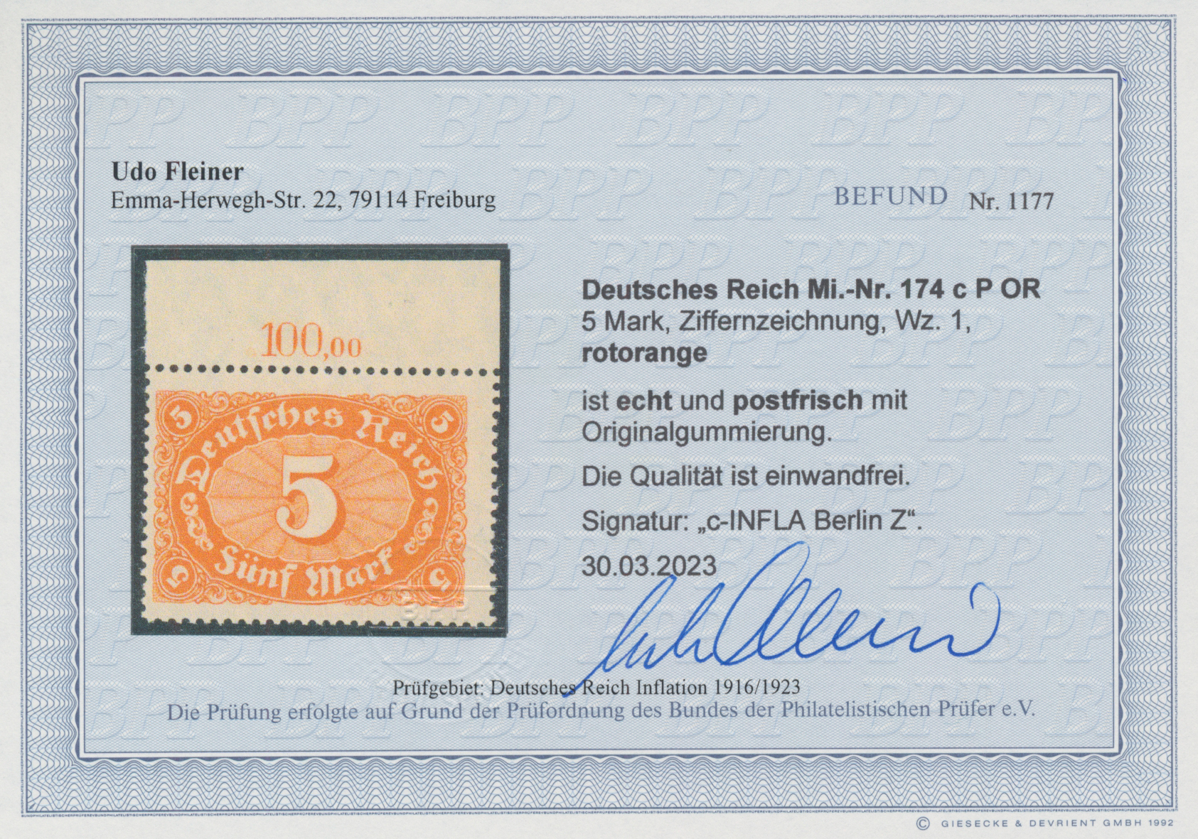 1921, 5 M rotorange vom Oberrand im Plattendruck, tadellos postfrisch, signiert Infla und Befund Fleiner, BPP(2023). (Mi. 300,- €)