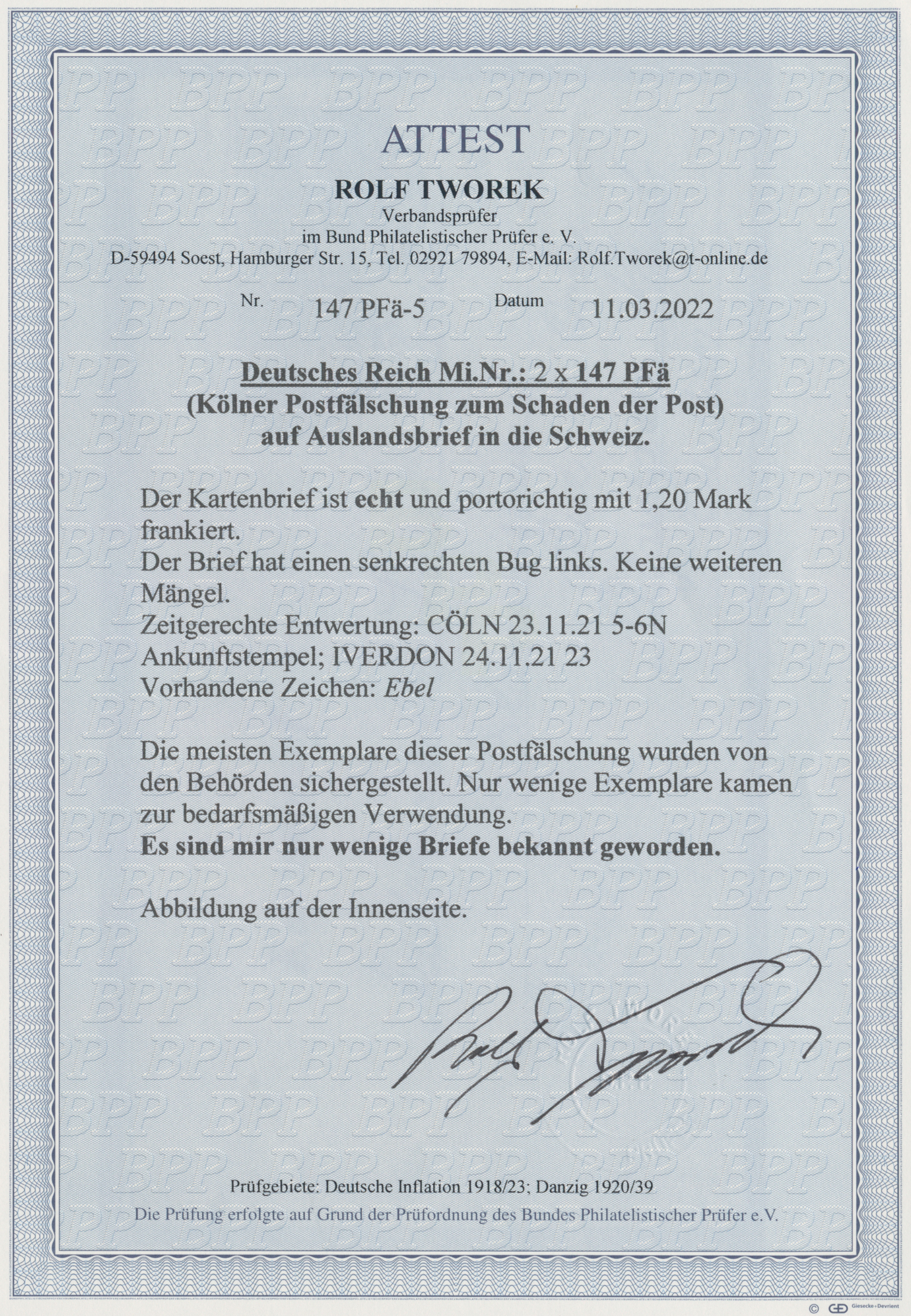 1921, Kölner Postfälschung zum Schaden der Post, als Auslandsbrief in die Schweiz. Der portorichtig mit 1,20 Mark frankierte Beleg ging von Köln ("CÖLN