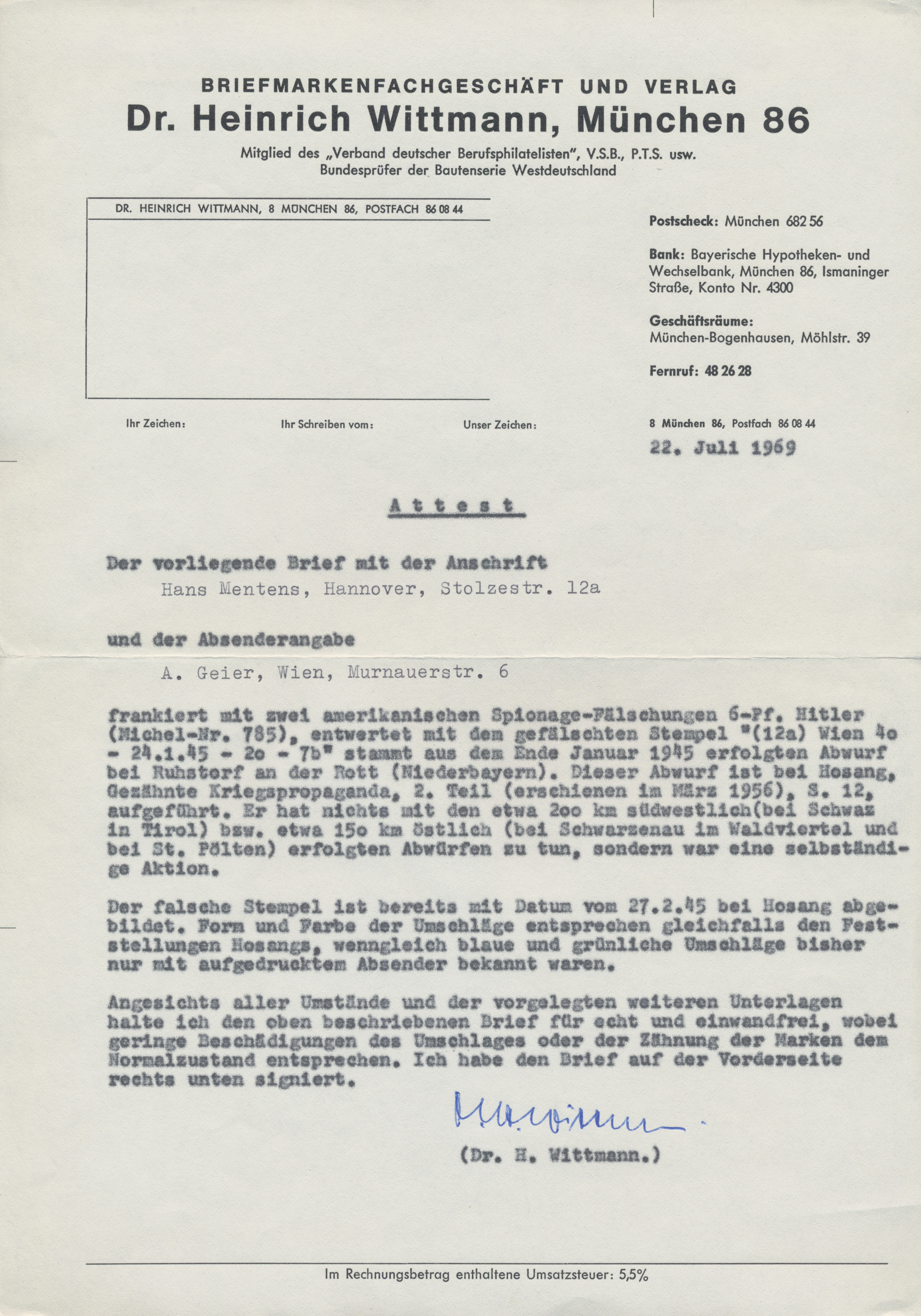 Absenderangabe "A.Geier, Wien, Murnauerstr. 6" nach Hannover adressiert, übliche kl. Einschränkungen sind typisch. Signiert und Attest Dr.Wittmann (1969).