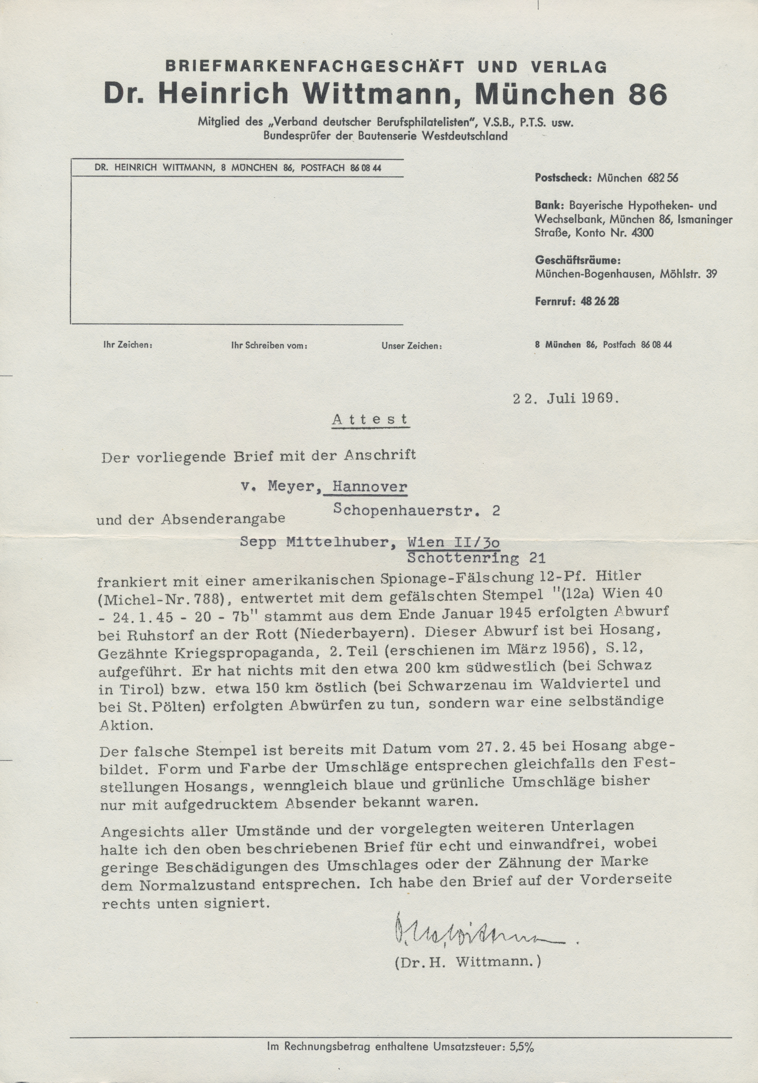 Mittelhuber, Wien II/30, Schottenring 21" nach Hannover adressiert. Signiert und Attest Dr.Wittmann (1969).