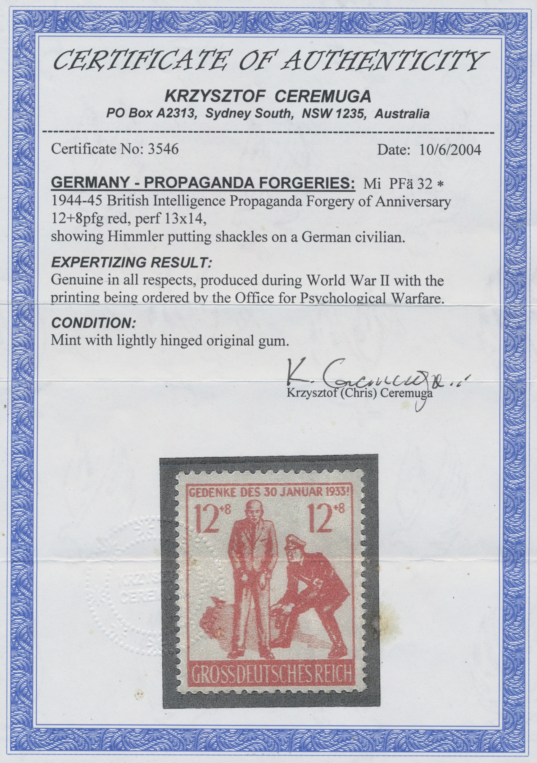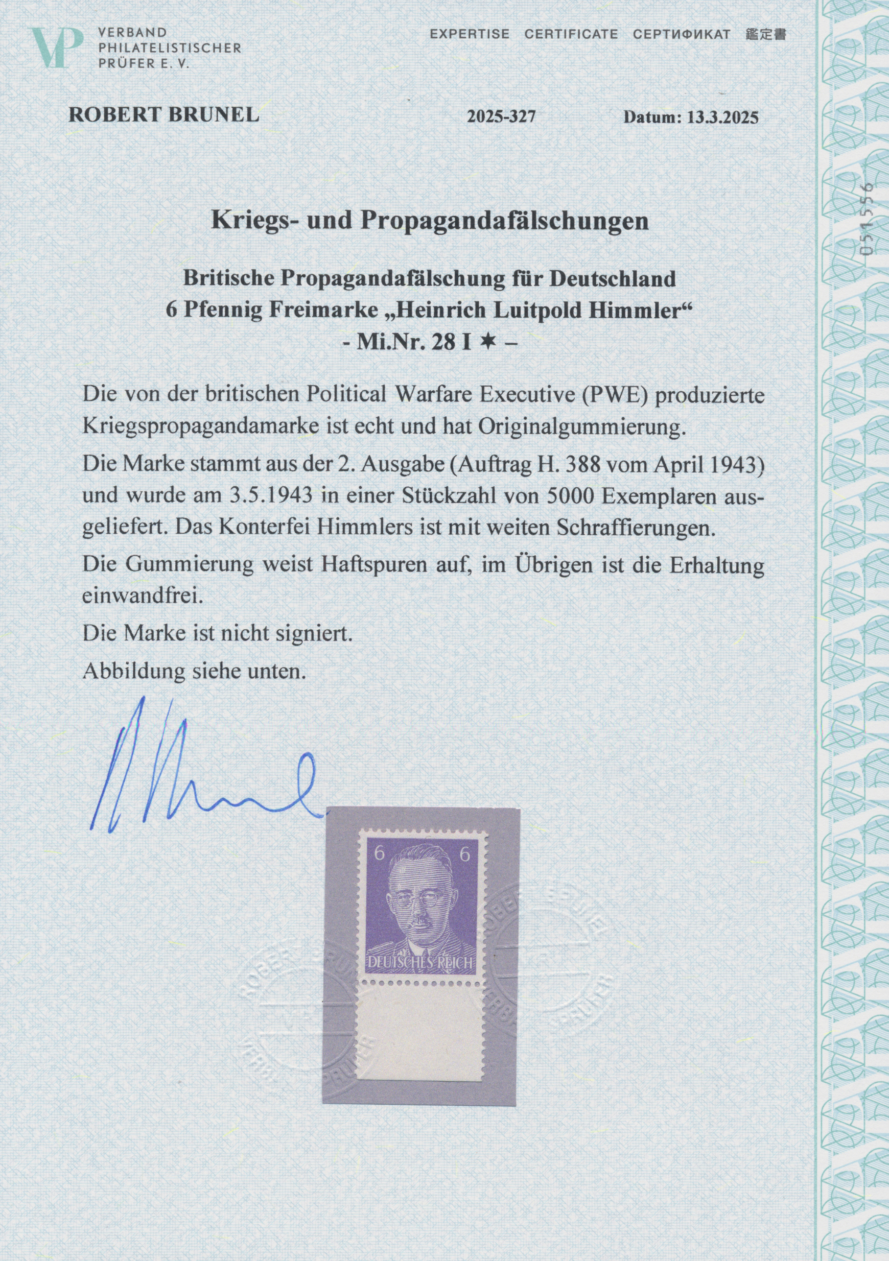 Gräbern und Abbildung von kleinen Galgen in den Wertziffernkästchen, mit Inschrift Deutsches Reich 1944", ungebraucht mit Originalgummi und kleiner Haftsstelle, unsigniert. Fotoattest Brunel VP. Bedeutende Großrarität der Propagandafälschungen, gemäß