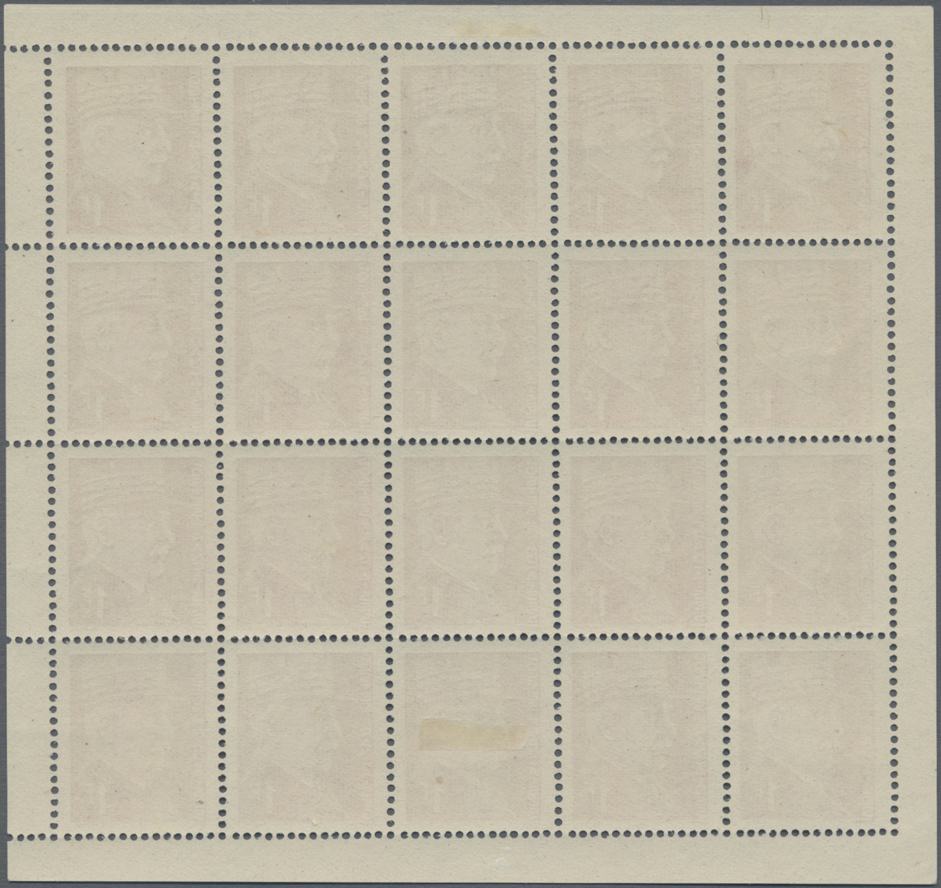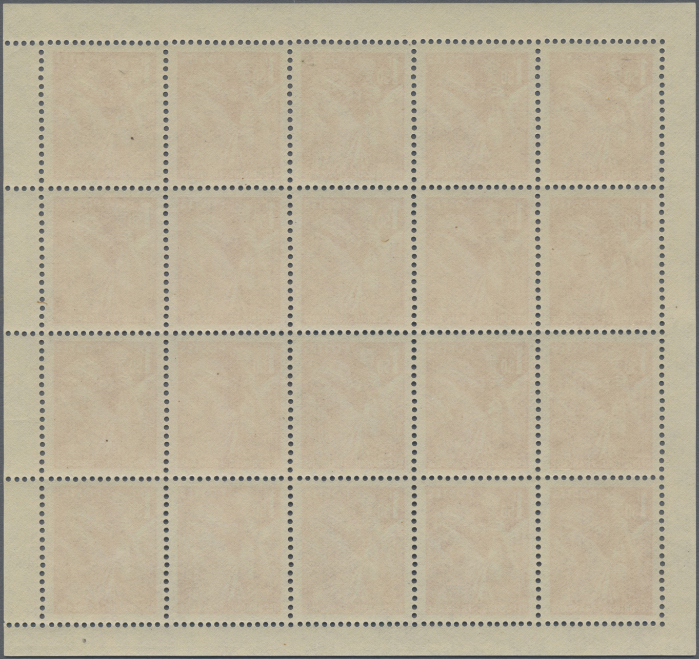 1941, Britische Fälschung für das besetzte Frankreich, Petain 1 Fr. bräunlichrot im 20er-Bogen, postfrisch, mittlere untere Marke und oberer