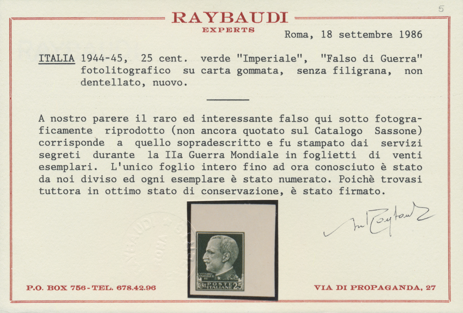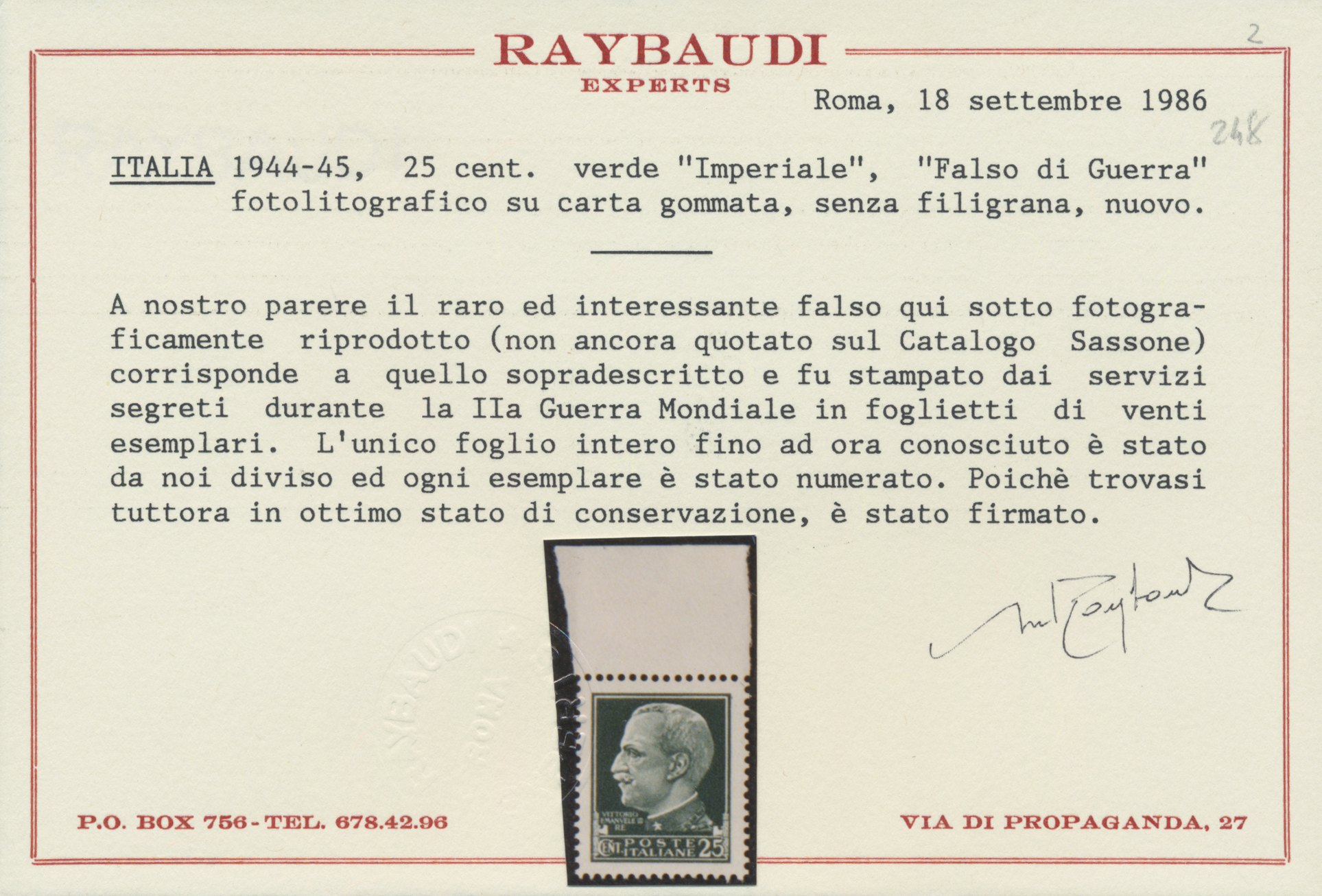 1943, Britische Fälschungen für Italien, Viktor Emanuel 25 C. dunkelgrün gezähnt vom Oberrand, postfrisch (Haftstellen nur im Oberrand), signiert