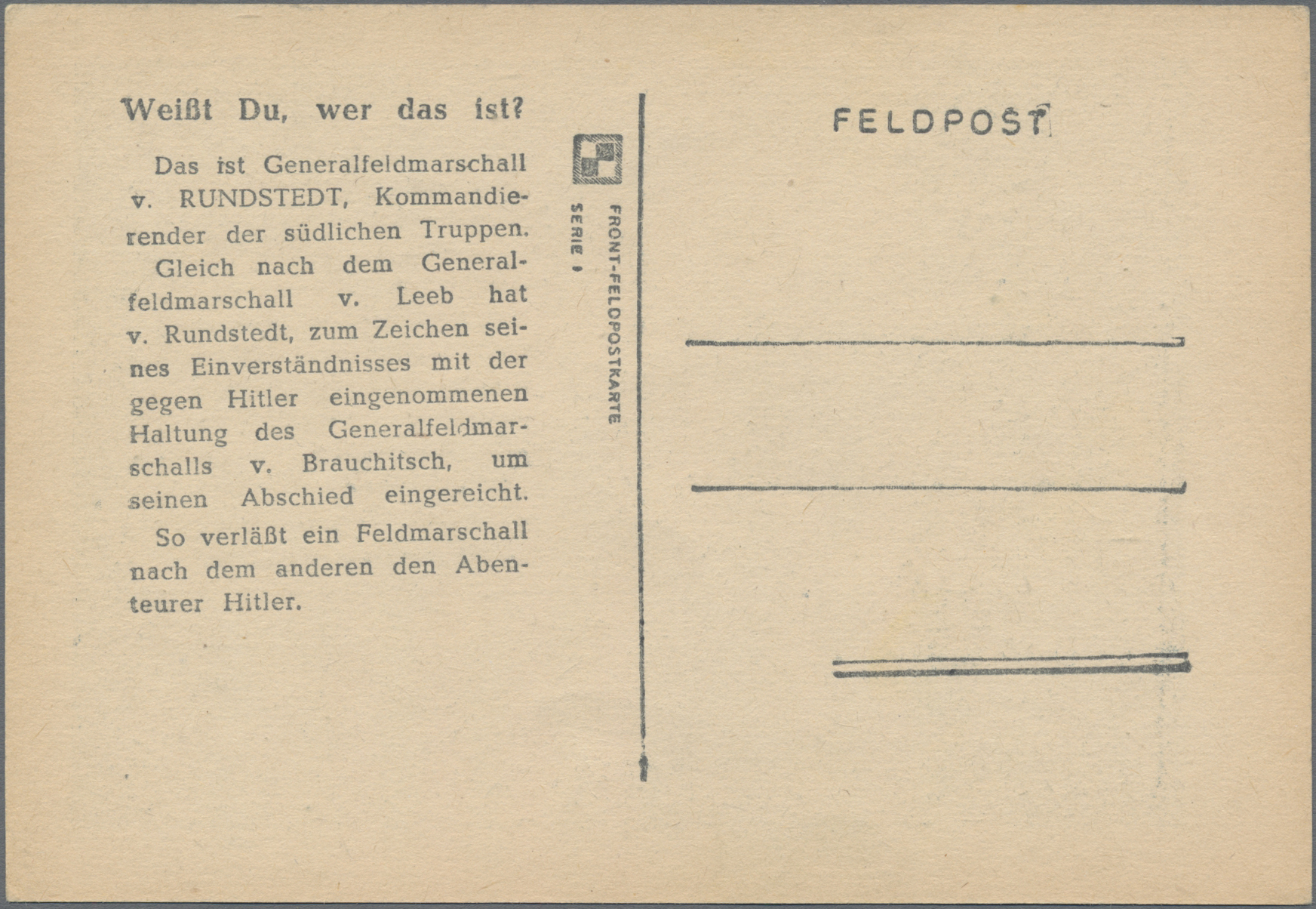 1941/1942, Sowjetrussische Fälschung für Deutschland, Karte "Weißt Du, wer das ist? - v.Runstedt", sehr gute Erhaltung.