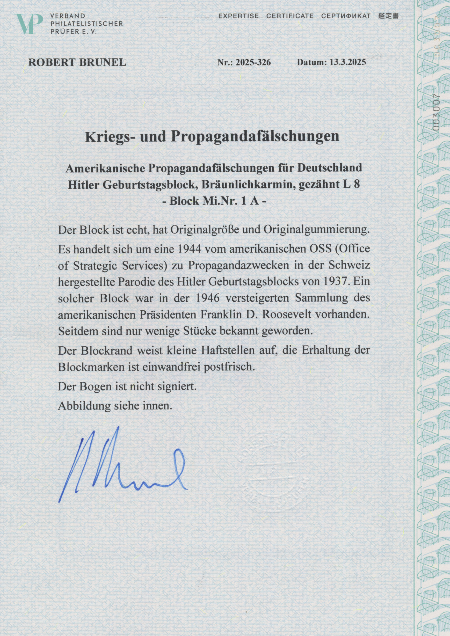 1944, Amerikanische Fälschung für Deutschland, Hitler-Block in bräunlichrot mit Linienzähnung 8 als sarkastische Parodie "Hitler-Totenkopf über