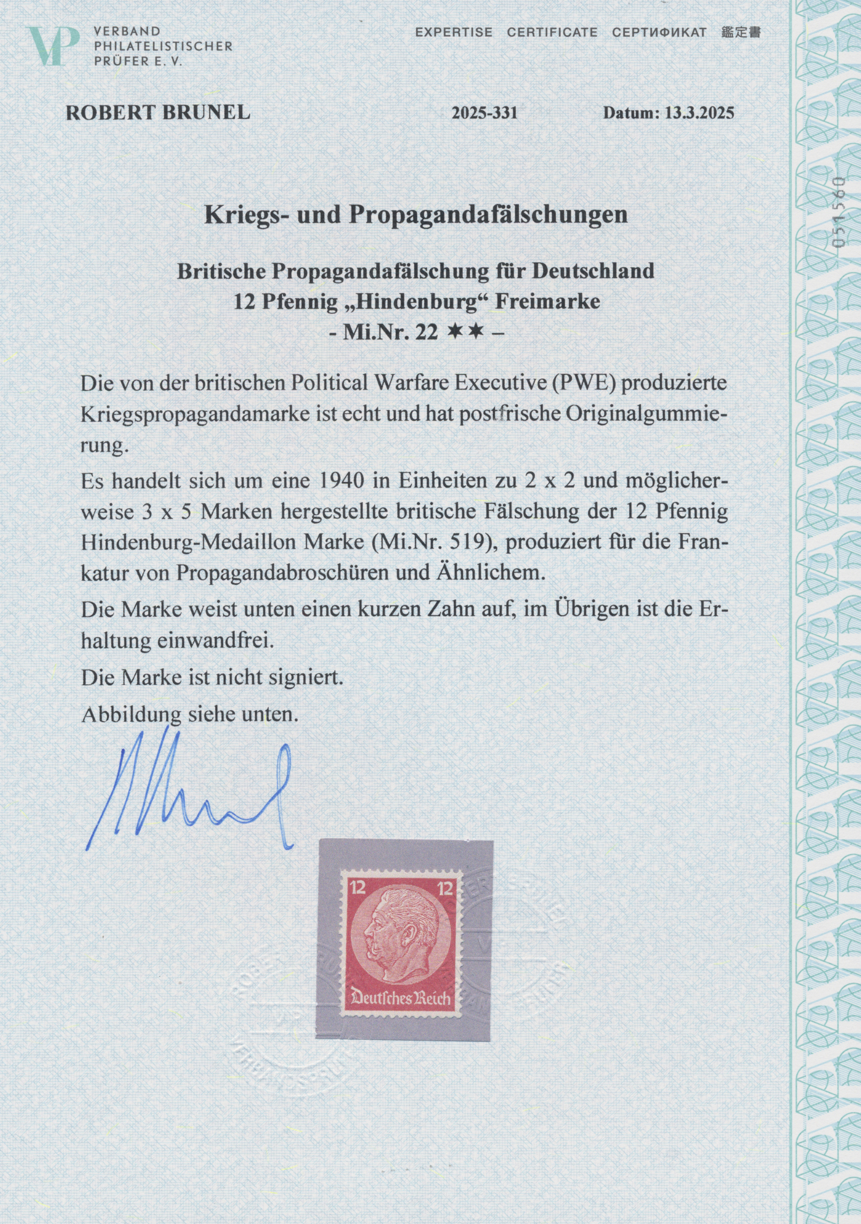 1939, Britische Fälschung für Deutschland, Hindenburg 12 Pfg. rot, unten mit flacher Zähung und einem kurzem Zahn, postfrisch, Punktsignatur.