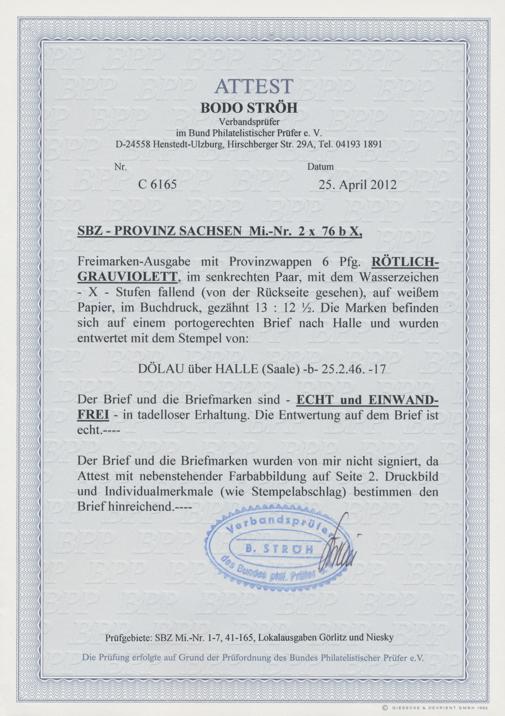 Brief von "DÖLAU über HALLE (SAALE) 25.2.46", Foto-Attest Ströh, BPP (2012); "Der Brief und die Briefmarken sind - echt und einwandfrei – in tadelloser Erhaltung. Die Entwertung auf dem Brief ist echt". Schönes Bedarfsstück. (Mi. mind. 2.050,-