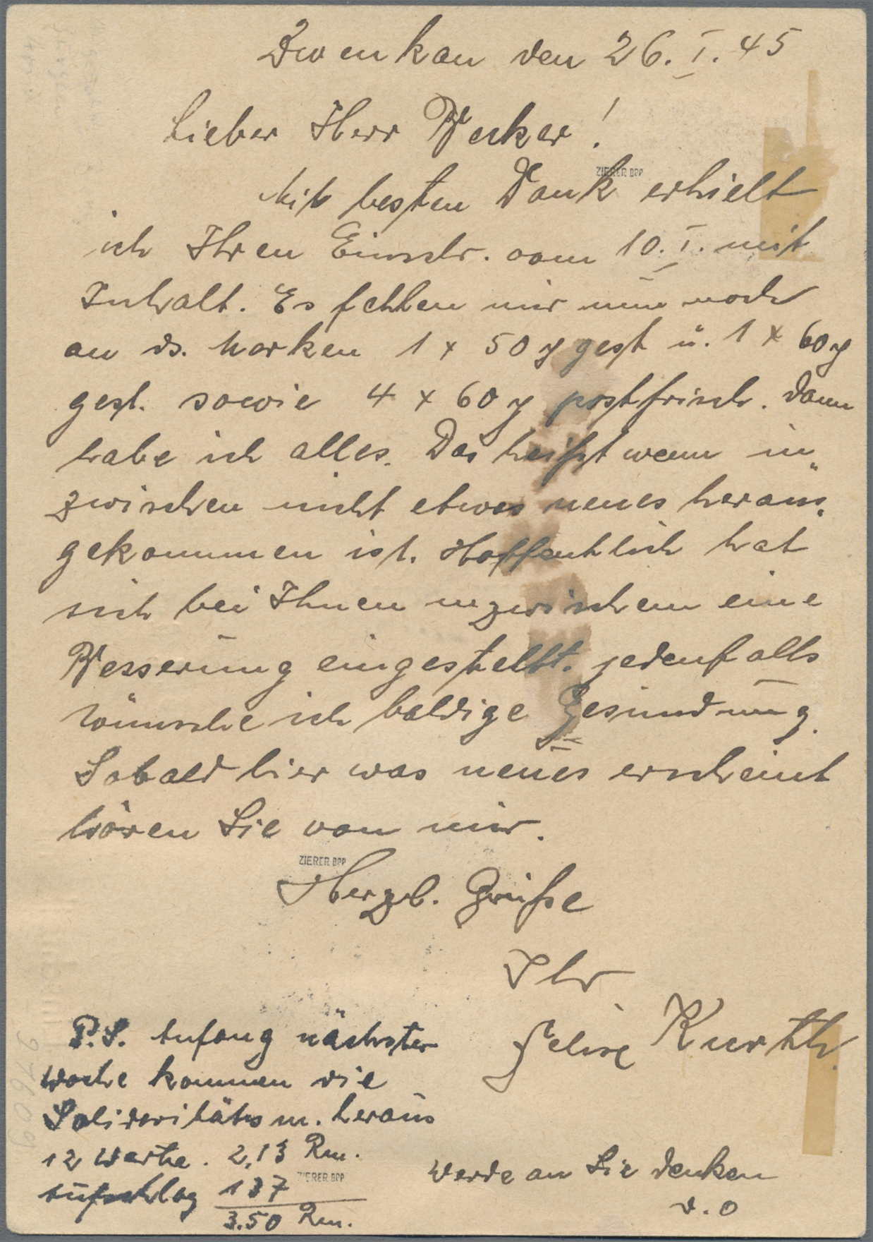 31.1.46. Diese Karte mit sehr viel Mitteiungstext hat tatsächlich den POSTVERKEHR ORDNUNGSGEMÄSS durchlaufen! Rückseitig leichte Falzreste aus der Zeit, als man solche Belege nicht besser aufzubewahren wußte. Ebenfalls rückseitig spätere kompetente