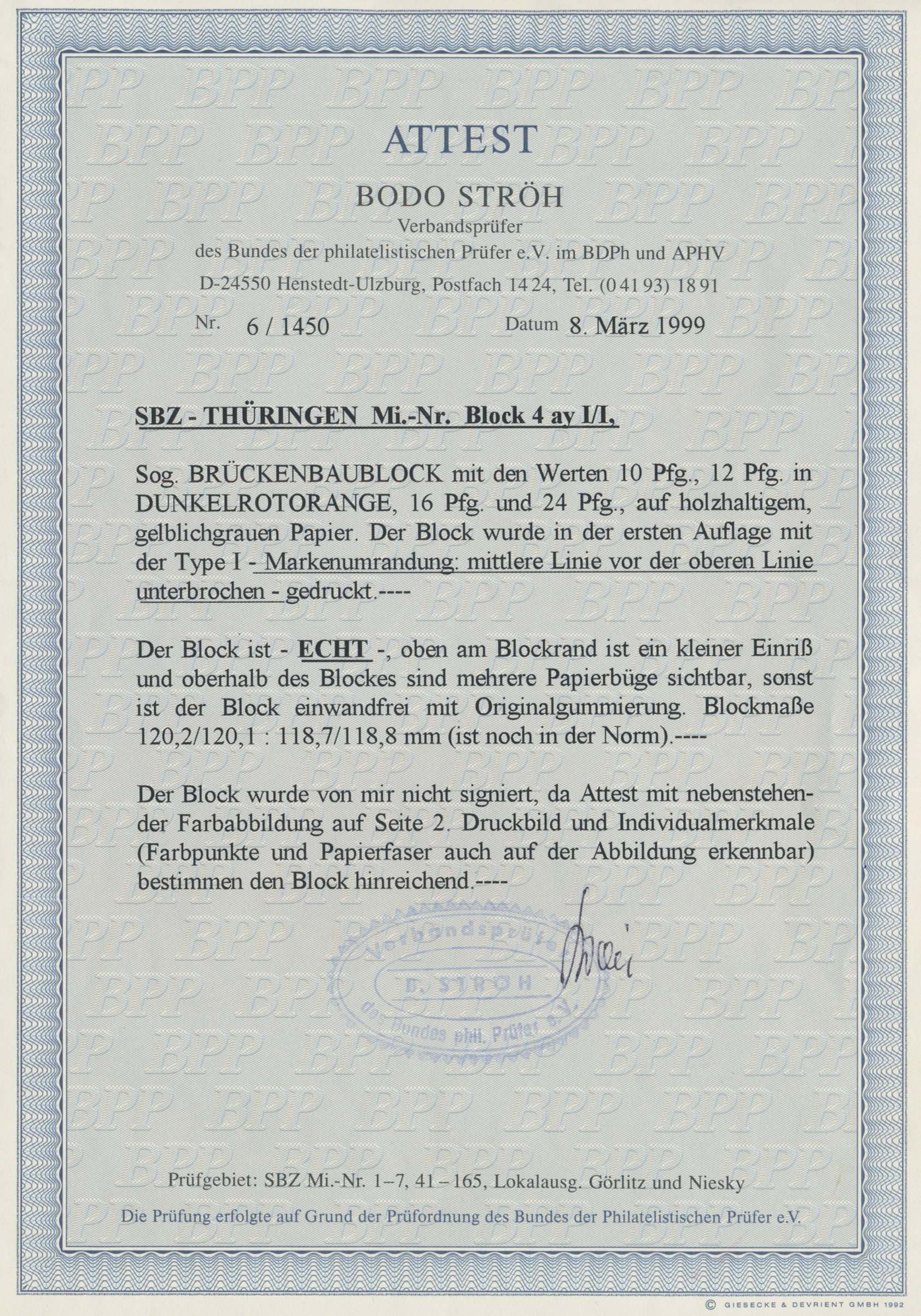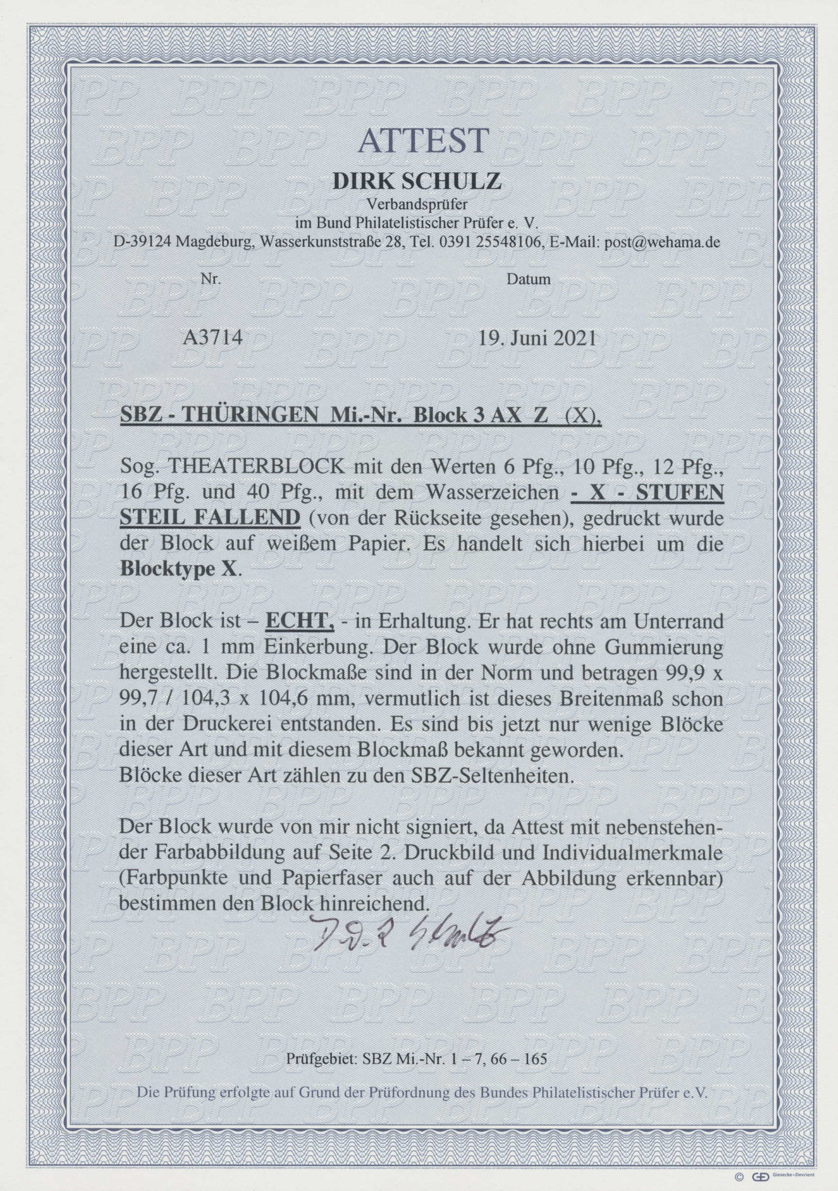 BPP(2021): "Der Block ist echt...Er hat rechts am Unterrand eine ca. 1 mm Einkerbung. Der Block wurde ohne Gummierung hergestellt. Die Blockmaße sind in der Norm...Es sind bis jetzt nur wenige Blöcke dieser Art und mit diesem Blockmaß bekannt