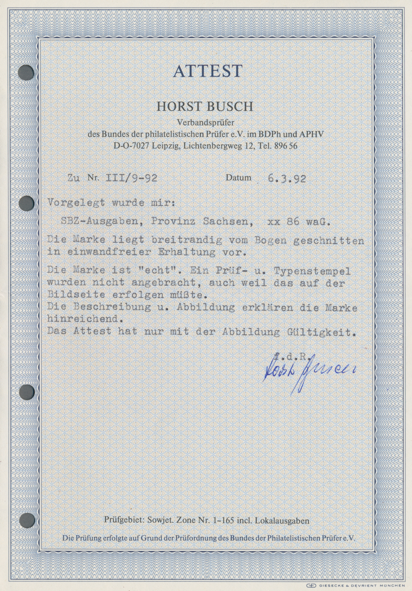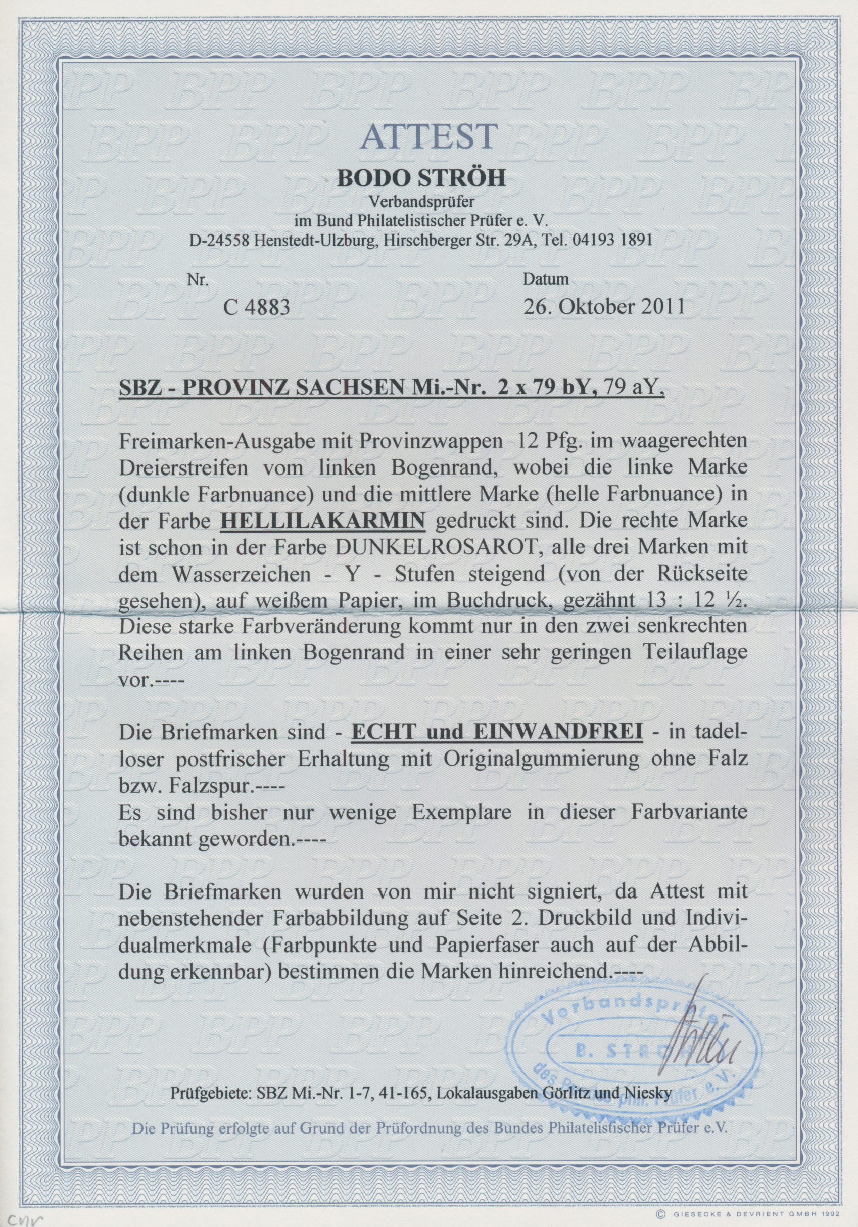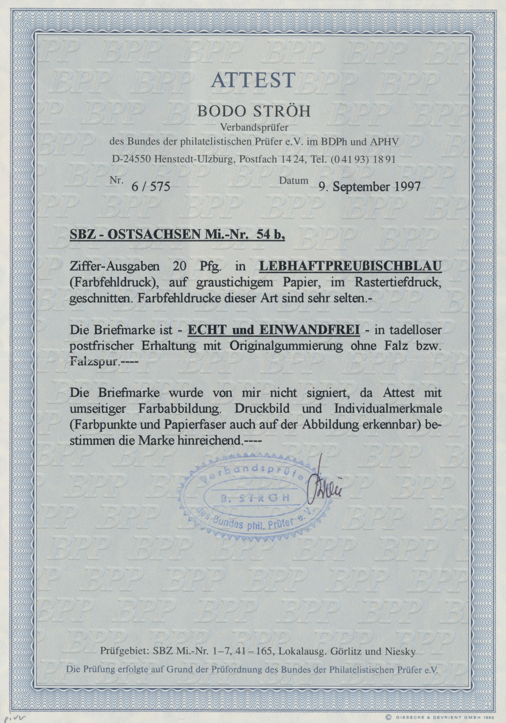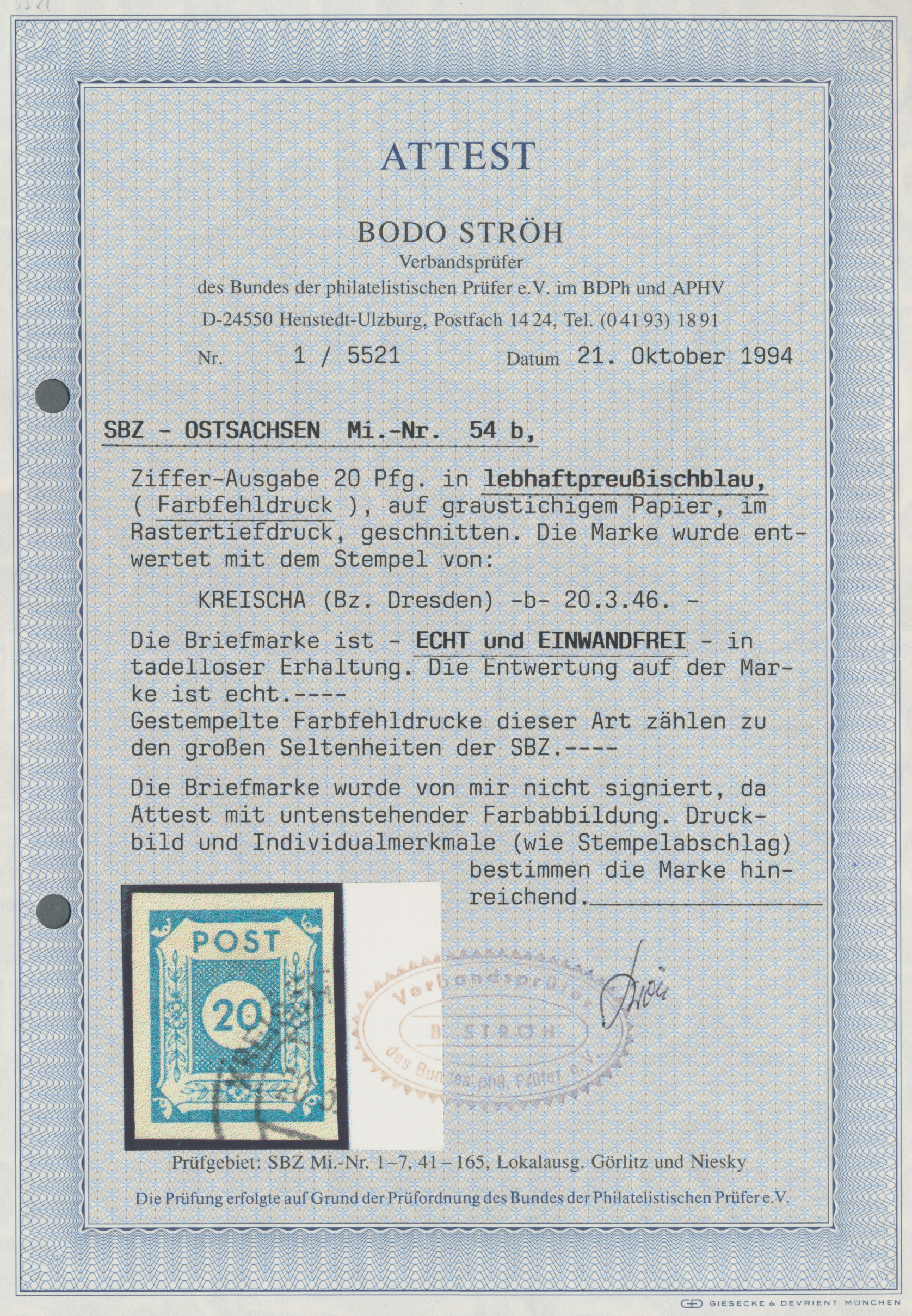20.3. (46), signiert Richter, Atteste Ströh und Jasch (2022). "Gestempelte Farbfehldrucke zählen zu den großen Seltenheiten der SBZ"