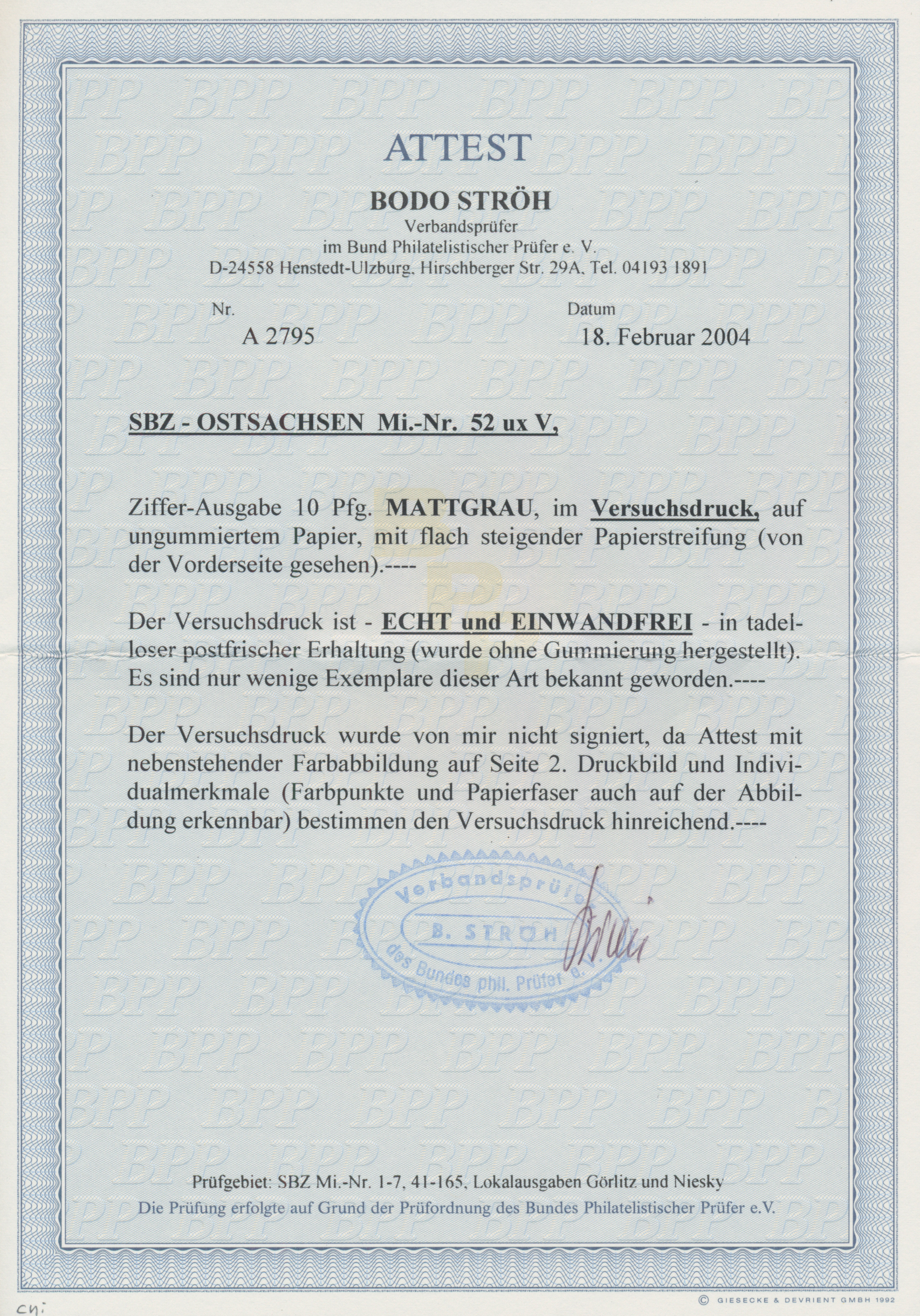 1945, 10 Pfg. mattgrau, sog. Versuchsdruck, postfrisch (wurde ohne Gummi verausgabt), tadellose Erhaltung, Foto-Attest Ströh BPP (2004), Mi 600,-