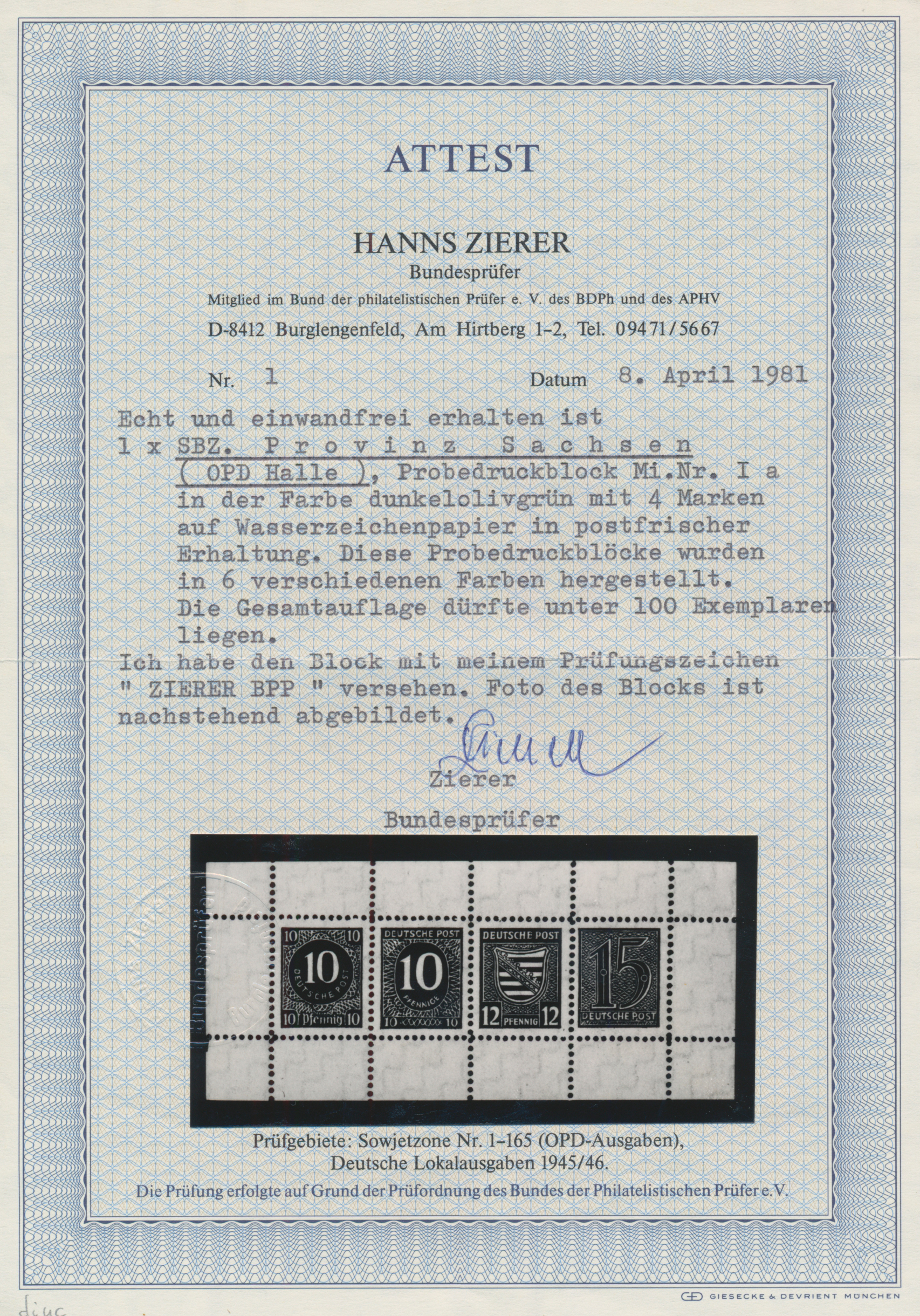1945, PROBEDRUCK mit 3 nicht angenommenen sowie dem angenommen Entwurf (Provinzwappen) in dunkelolivgrün, postfrisch, gepr. sowie Foto-Attest