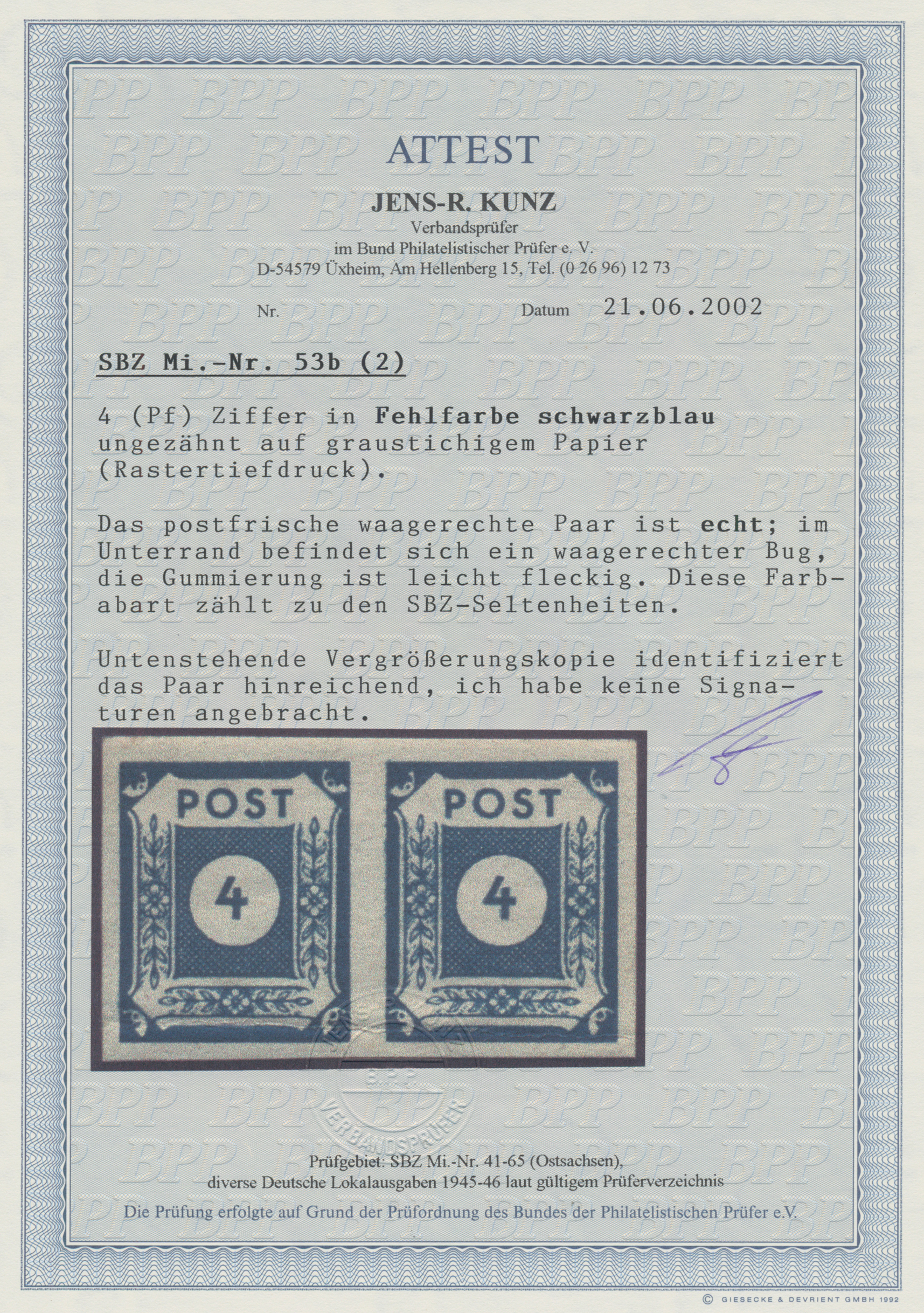 1945, Ziffern, 4 Pfg. schwarzblau, postfrisches waagerechtes Paar, im Unterrand waagerechter Bug bzw. Gummierung leicht fleckig, Foto-Attest Kunz BPP
