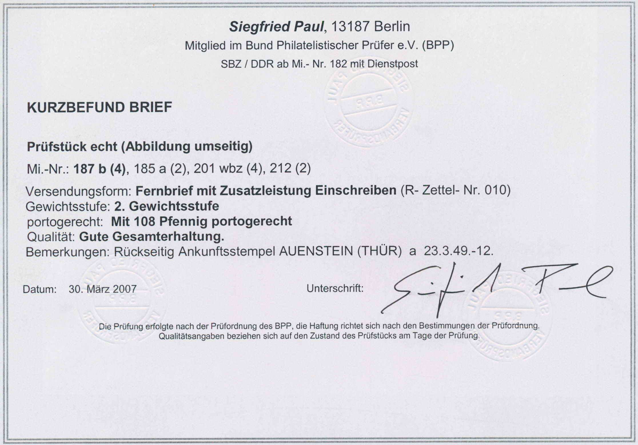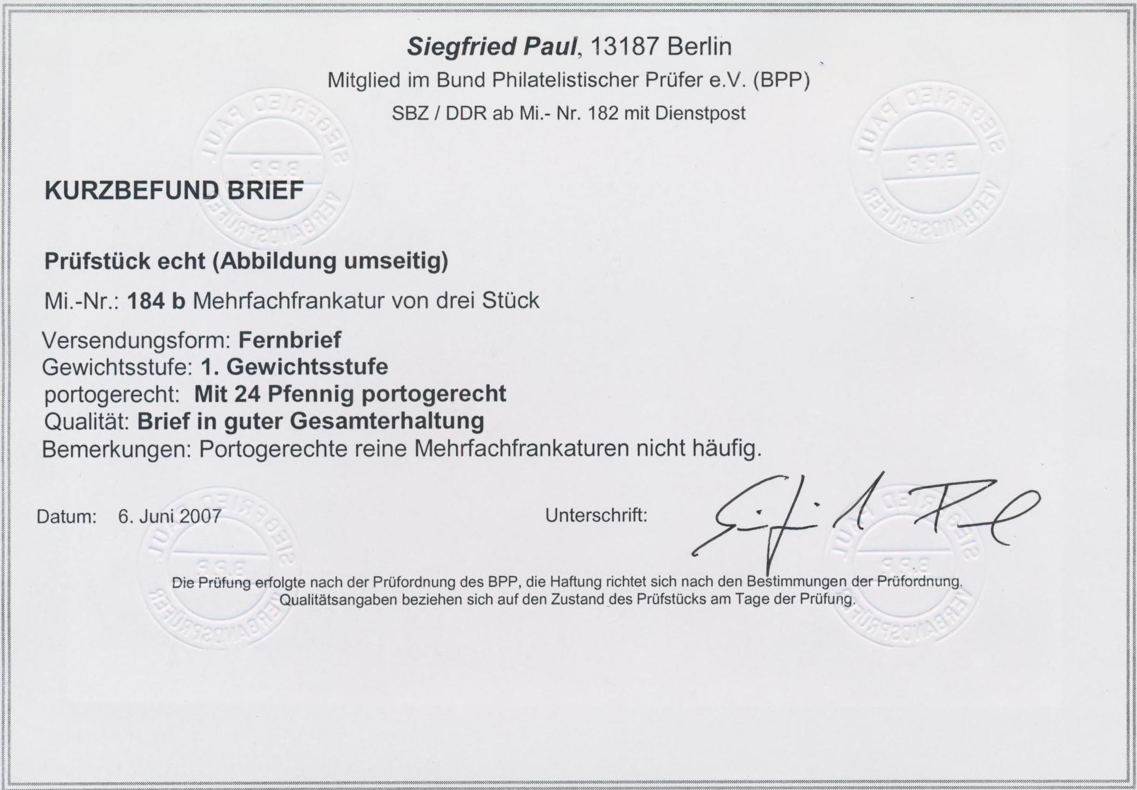 Firmenbrief von "LEIPZIG C2 27.7.48" nach Berlin, unsigniert. Kurzbefund Paul BPP "in guter Gesamterhaltung".