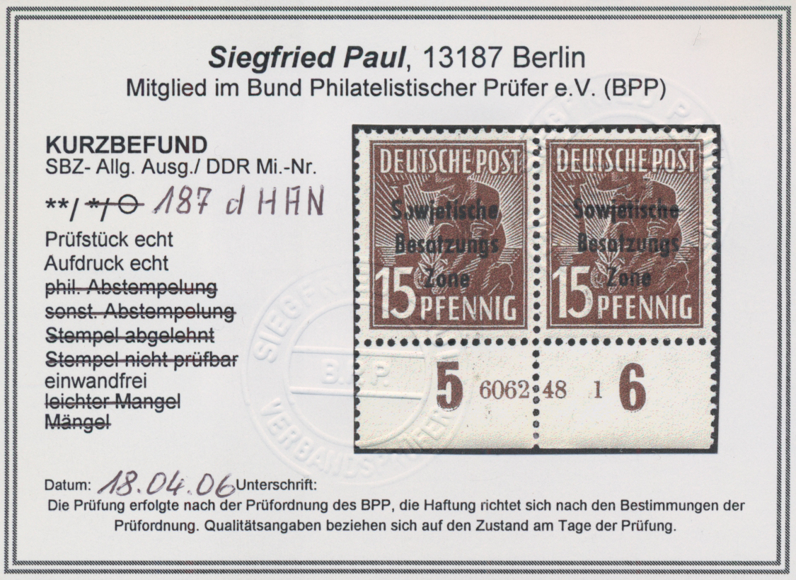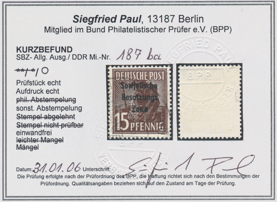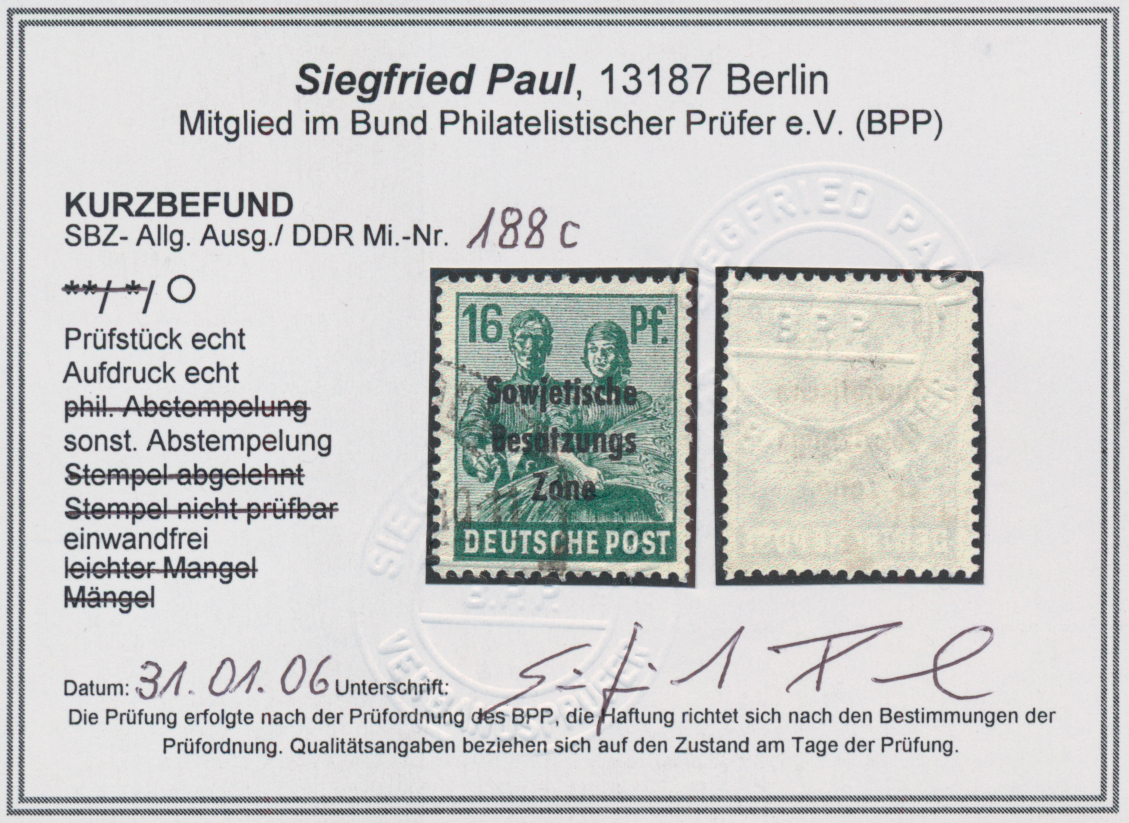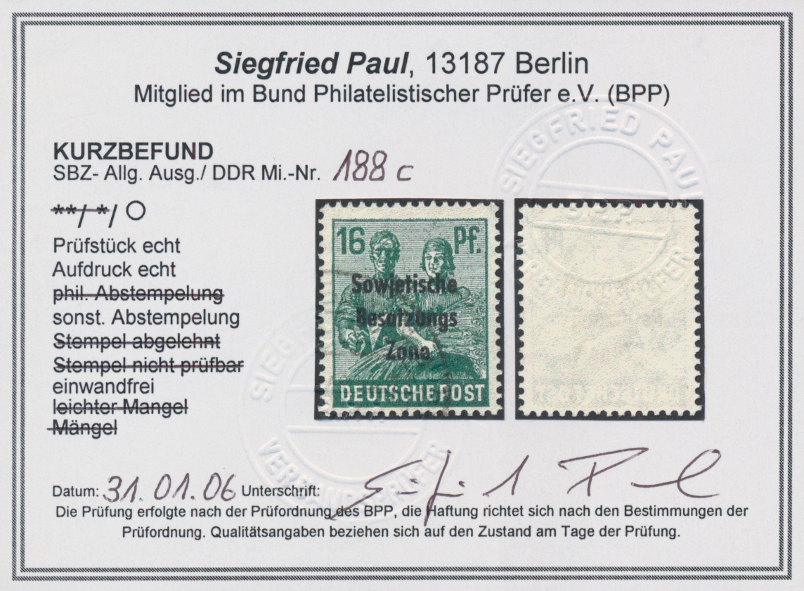 Paul, BPP(2017): "echt und einwandfrei". Sehr selten(war 2017 die erste geprüfte Vorlage!). Schöne Gelegenheit zum Erwerb dieser SBZ-Seltenheit! (Im Michel ohne Bewertung -.-)