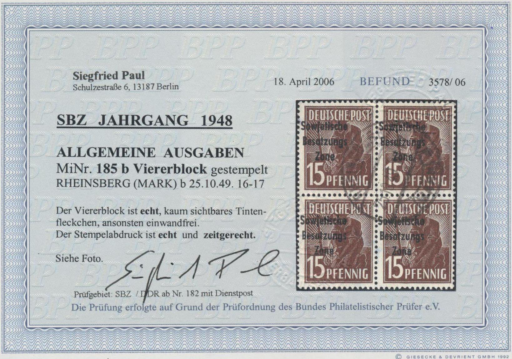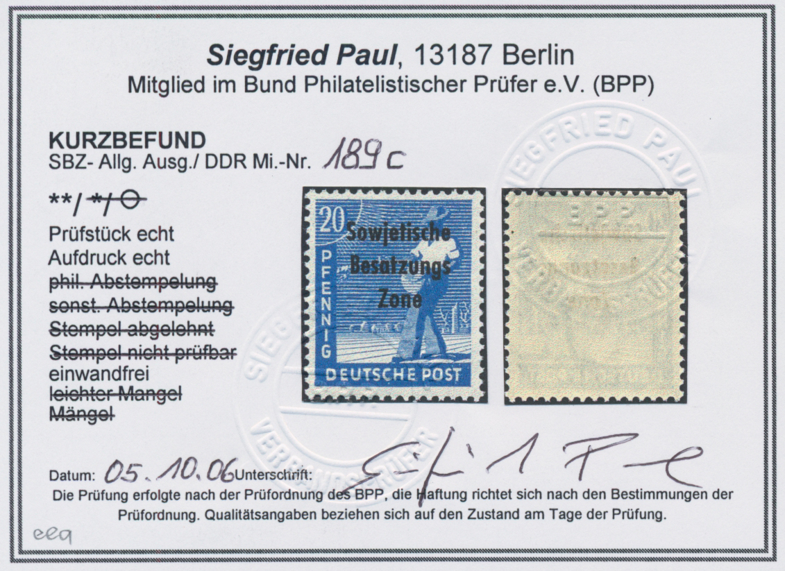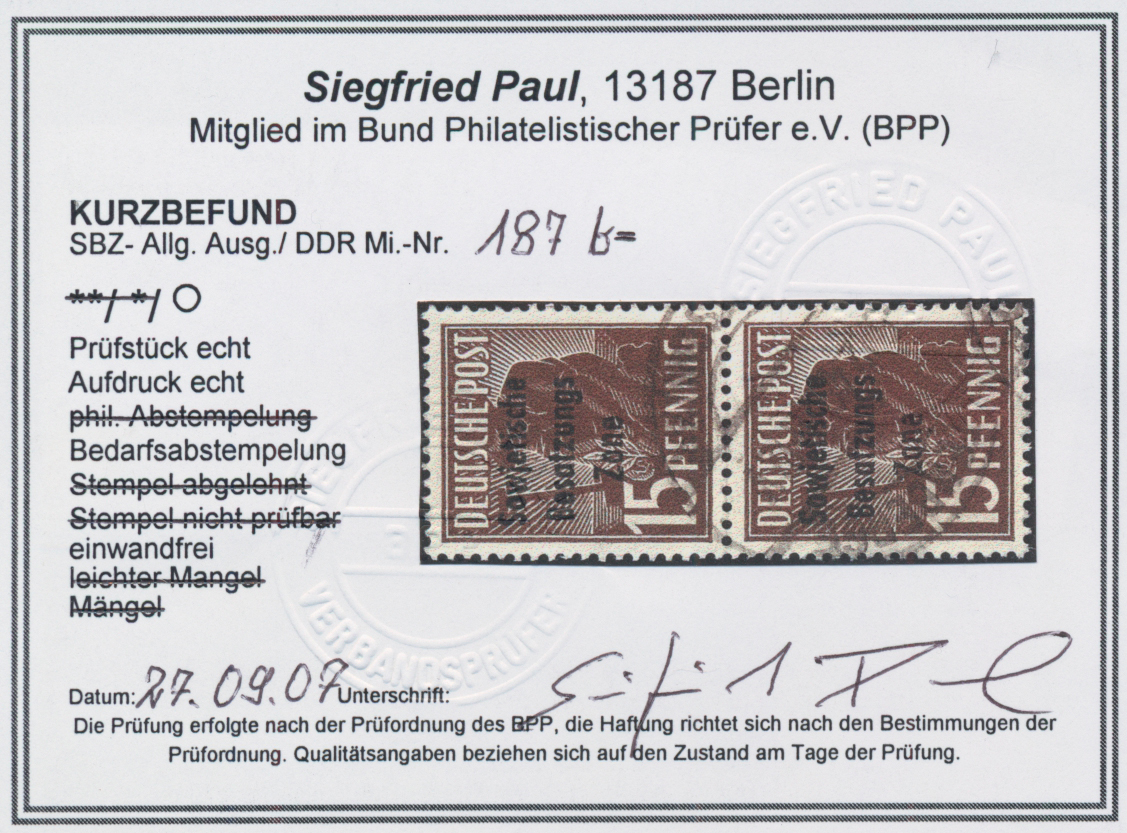 Paul, BPP(2017): "echt und einwandfrei". Sehr selten(war 2017 die erste geprüfte Vorlage!). Schöne Gelegenheit zum Erwerb dieser SBZ-Seltenheit! (Im Michel ohne Bewertung -.-)
