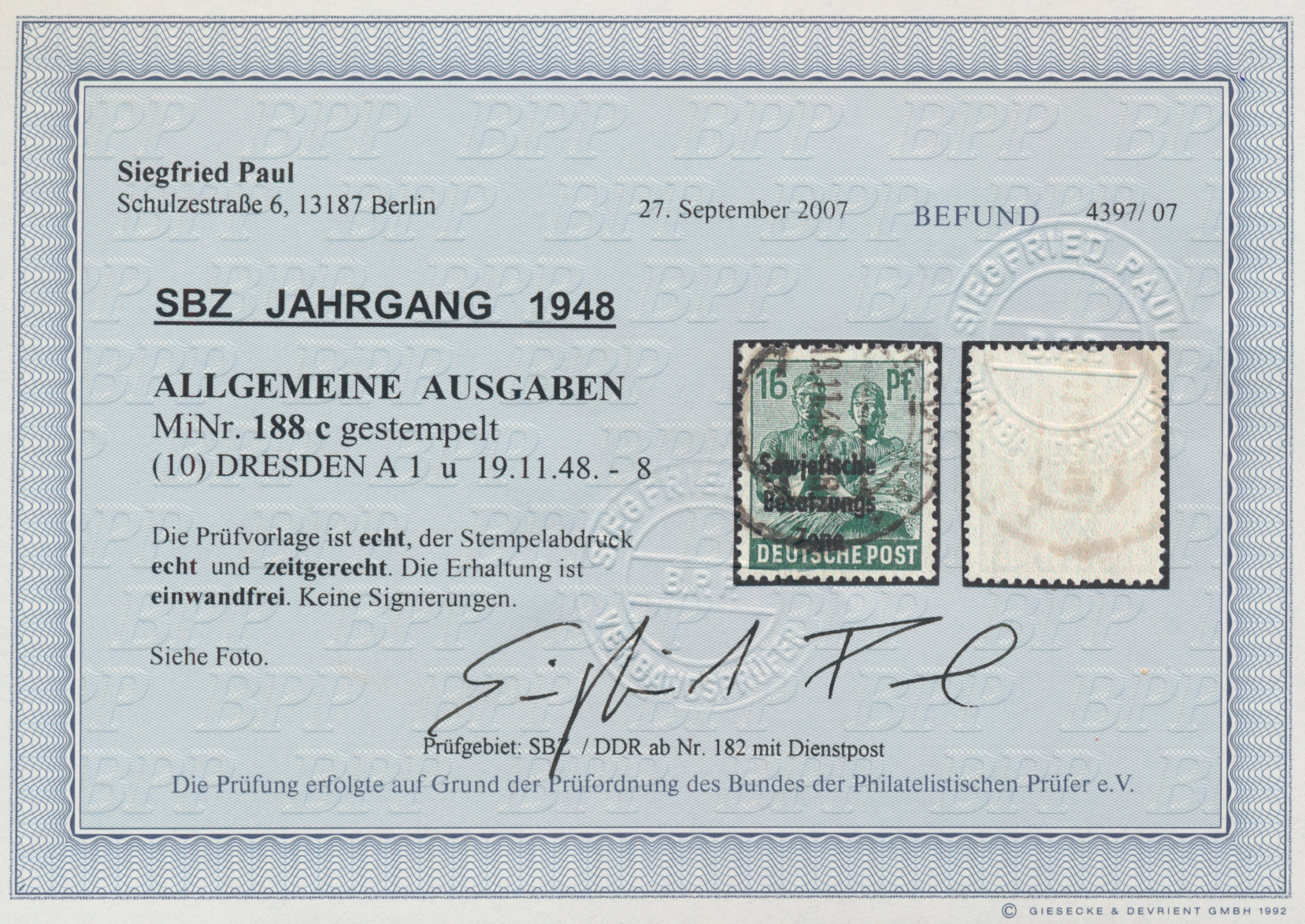1948, Maschinenaufdruck auf Arbeiter 16 Pfg. schwärzlichopalgrün sauber gestempelt "DRESDEN A1 19.11.48", unsigniert. Fotobefund Paul BPP
