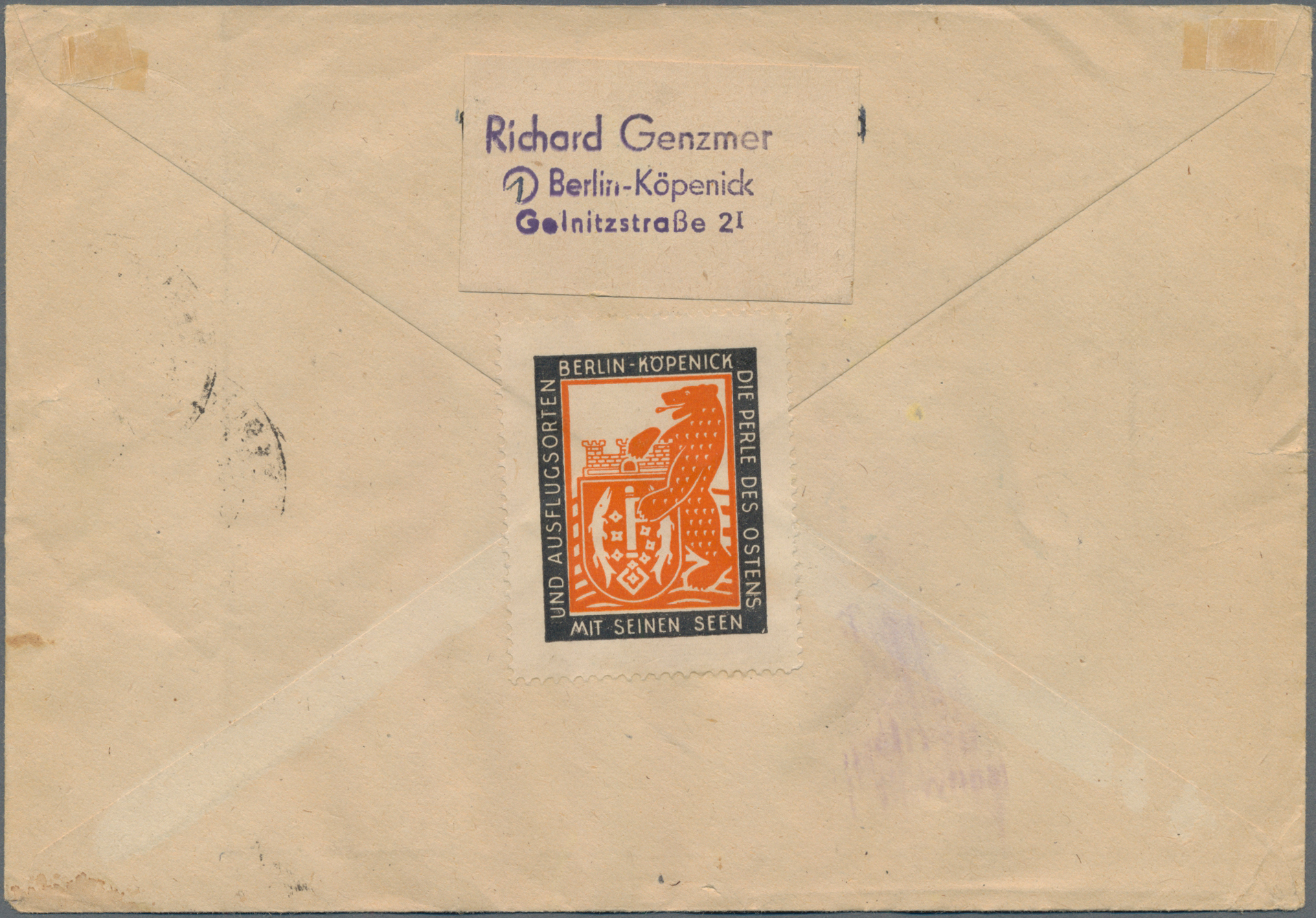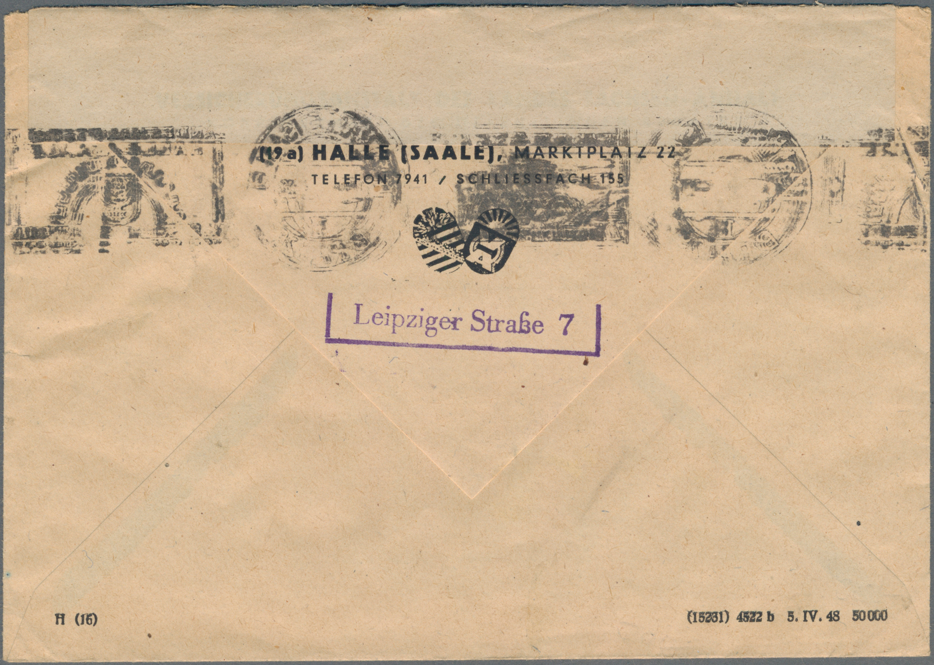 1948, Maschinenaufdruck auf Arbeiter 6 Pfg. violett im Plattendruck-Oberrand-4er-Block als portogerechte Mehrfachfrankatur auf Brief von