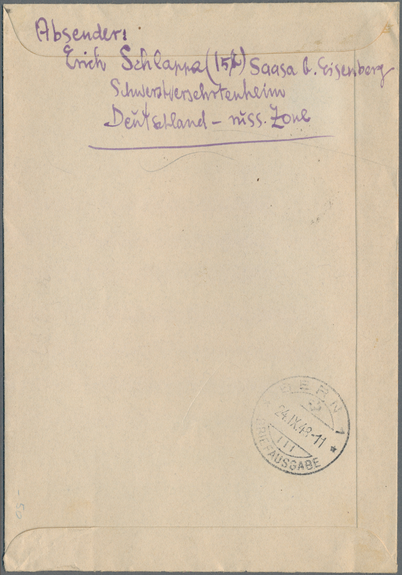 schwarz als portogerechte Frankatur auf Brief von "Eisenberg 15.9.48" nach Bern/Schweiz.