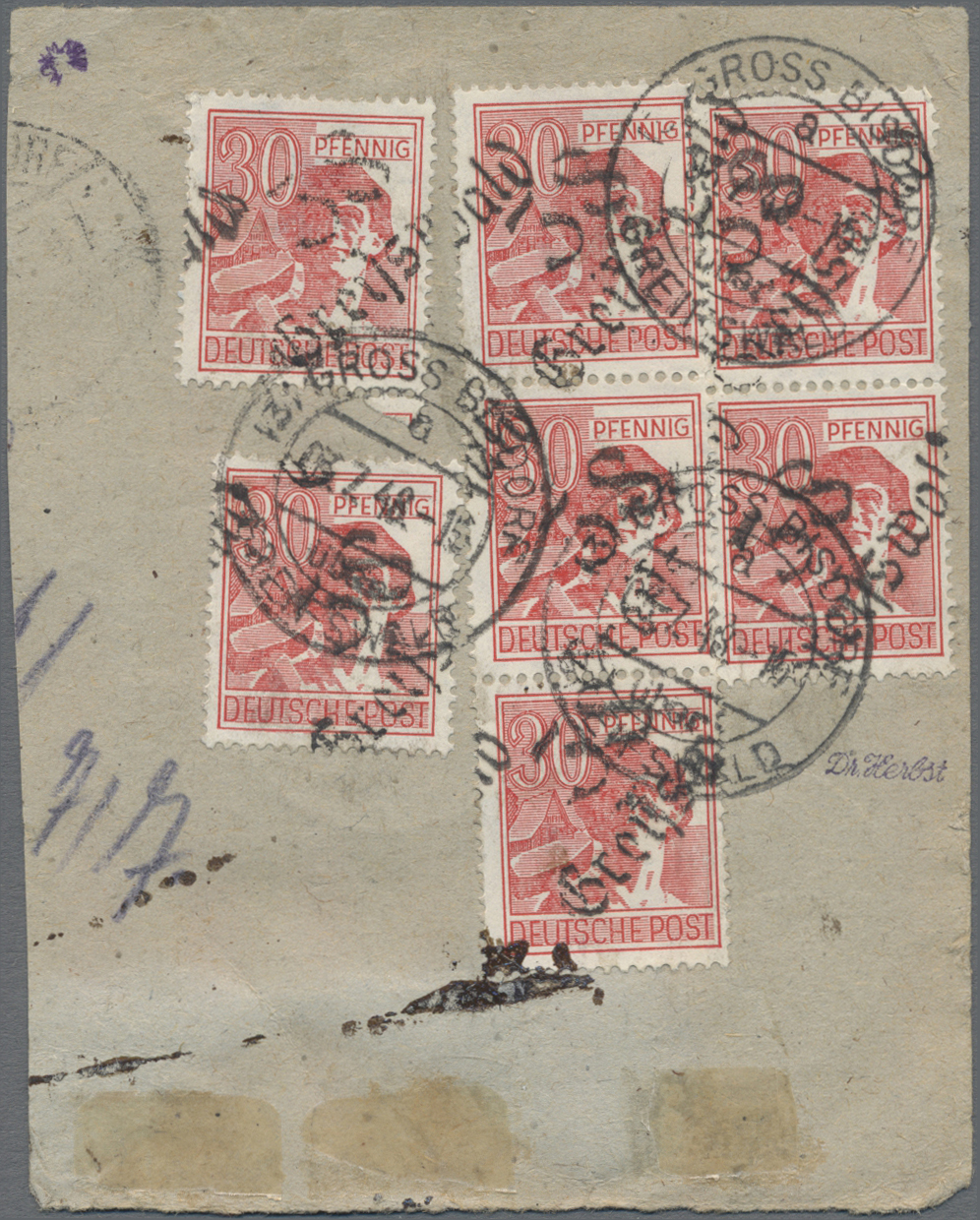 1948, "38 Greifswald", Handstempelaufdruck auf 30 Pfg. Arbeiter, zwölf Werte als Mehrfachfrankatur auf großem Teil