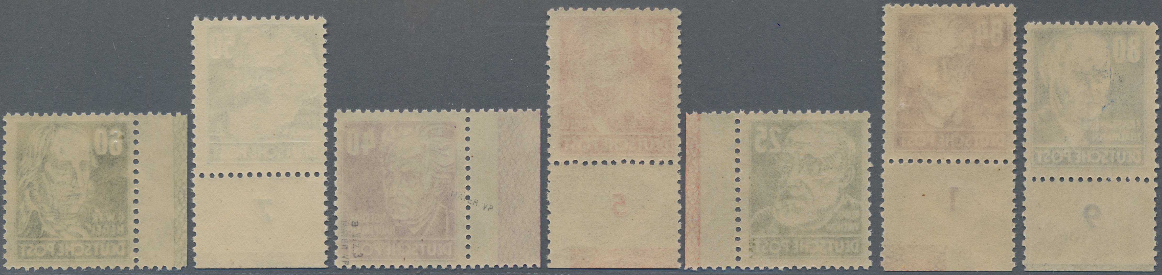 1948, 50 Pf Leipziger Herbstmesse mir waagerechter Borekengummierung sowie 6 Werte Köpfe mit senkrechter Borkengummierung, und zwar die Werte