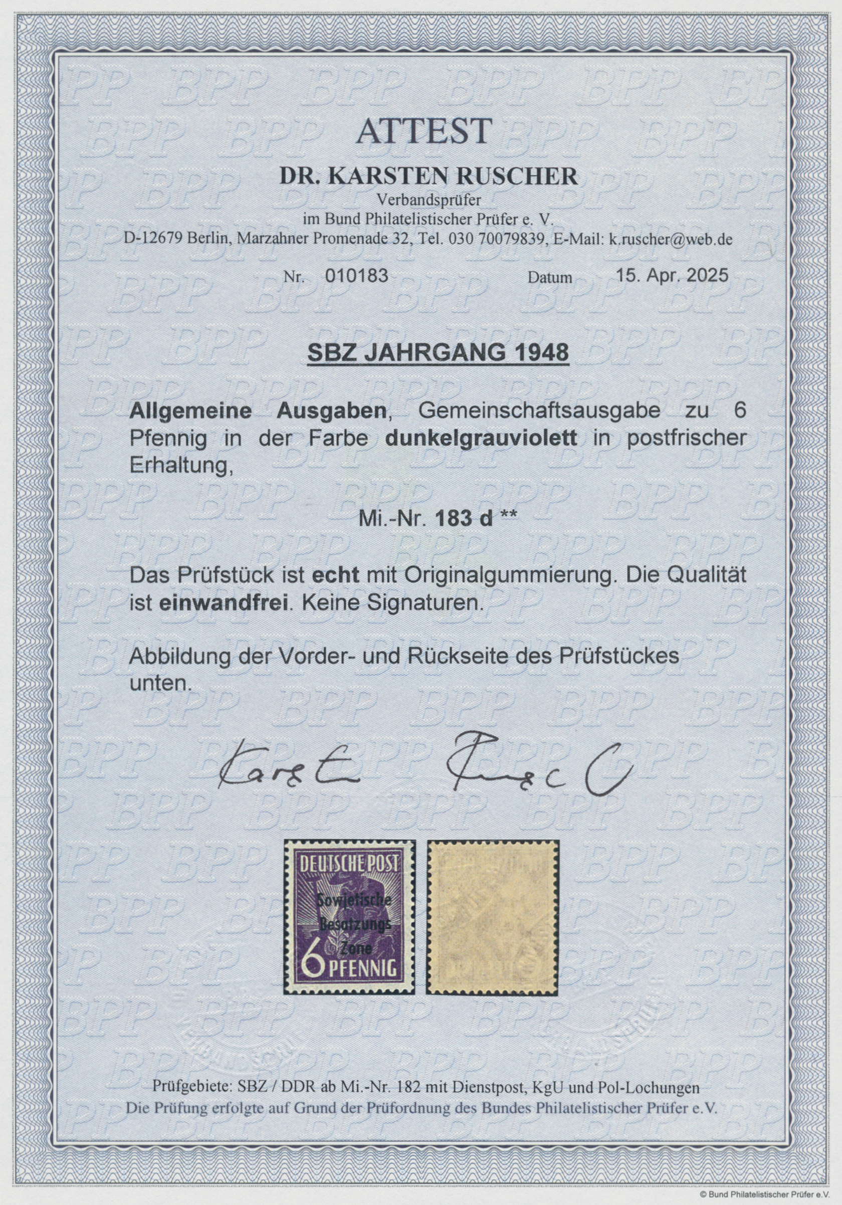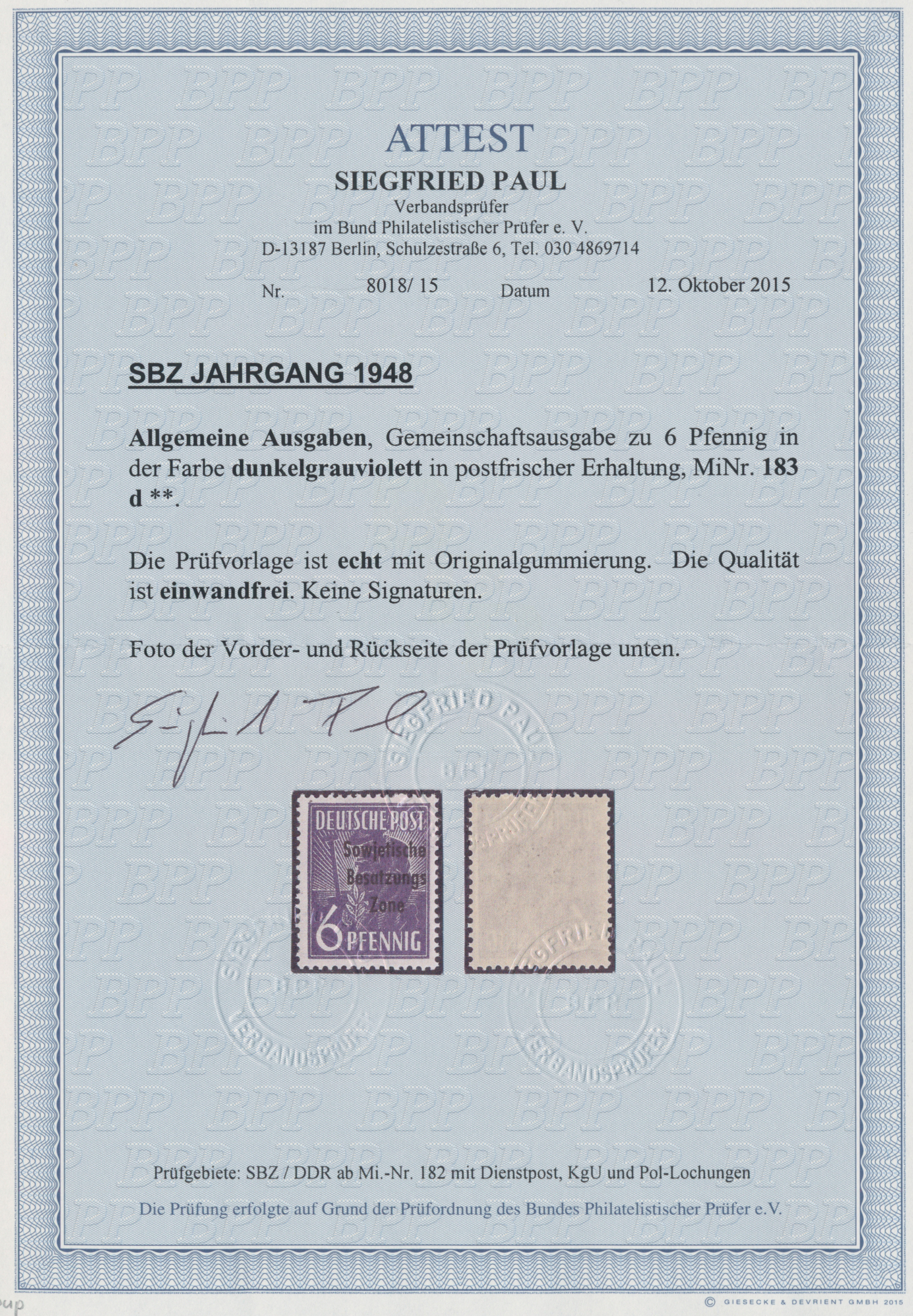 1948, Aufdruck-Ausgabe, 6 Pfg. dunkelgrauviolett, postfrisch, Foto-Attest Paul BPP (2015), Mi 650,-