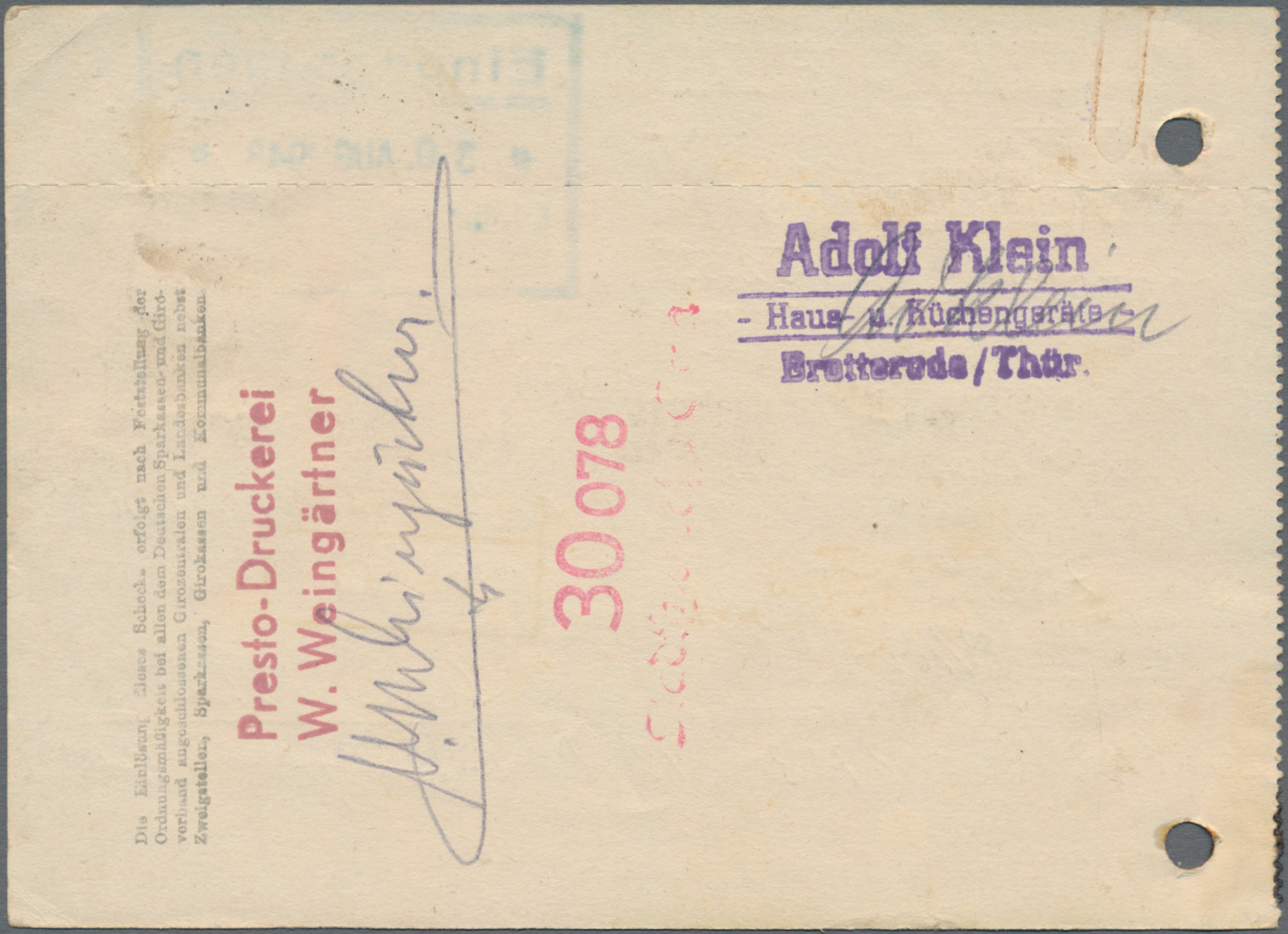 1948, 6 Pf. Maschinenaufdruck als Einzelfrankatur auf Verrechnungsscheck über 52,50 RM, entwertet mit Sonderstempel "BROTTERODE 27.8.48",