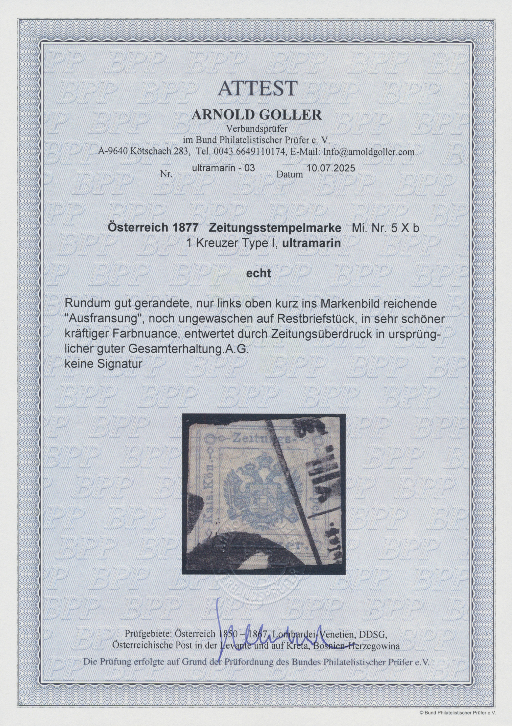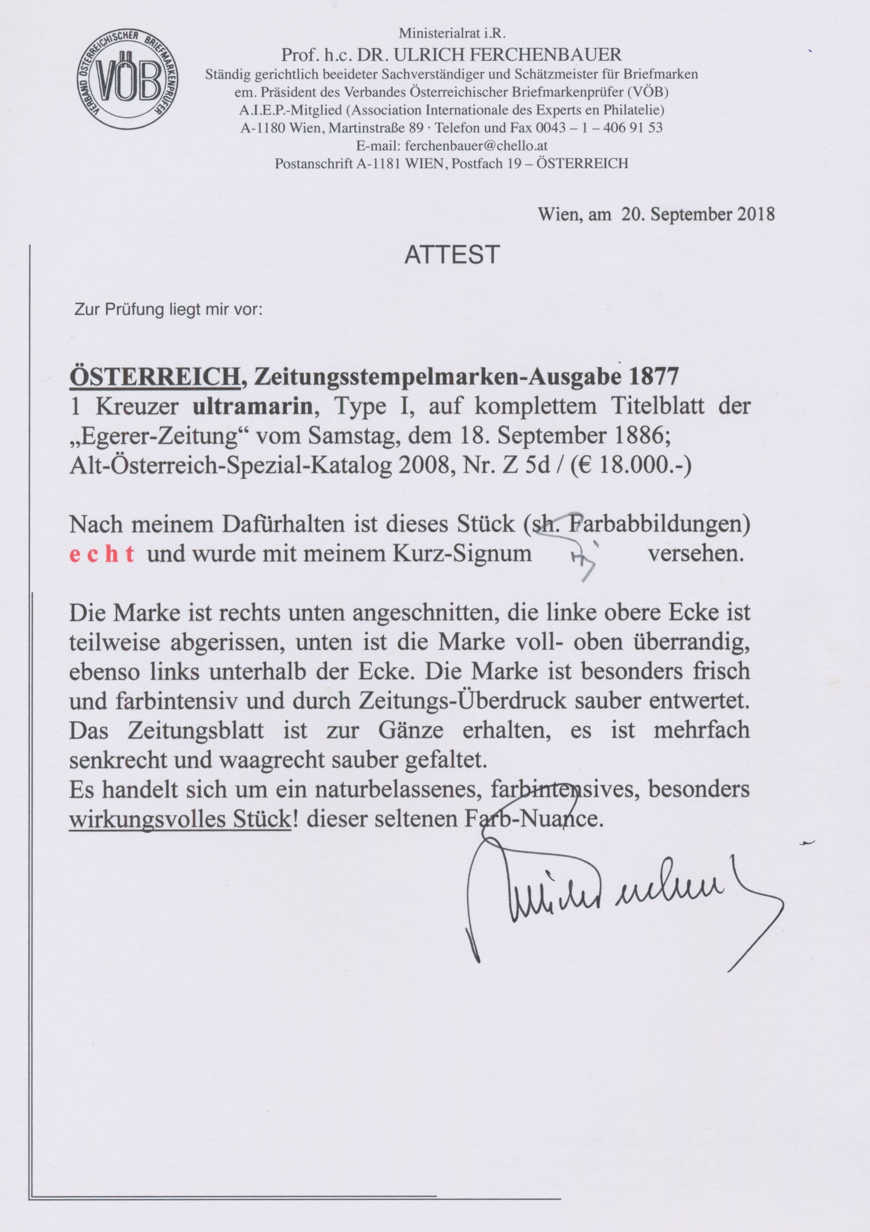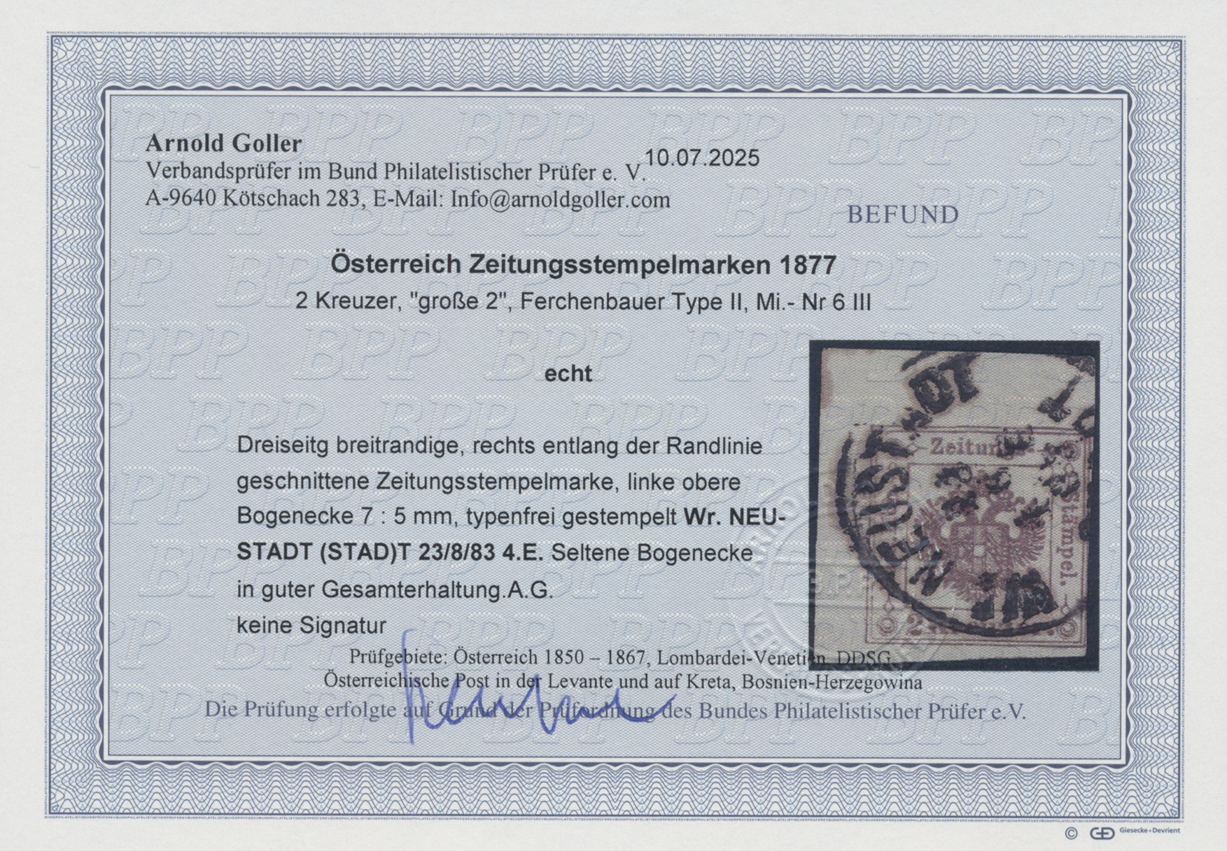 Randlinien der linken obere Ecke teils abgetrennt, sonst voll- bis überrandig in besonders farbfrischer, ursprünglicher Erhaltung, sauber entwertet durch Zeitungsüberdruck. Rarität der österreichischen Zeitungsstempelmarken. Fotoattest Ferchenbauer.