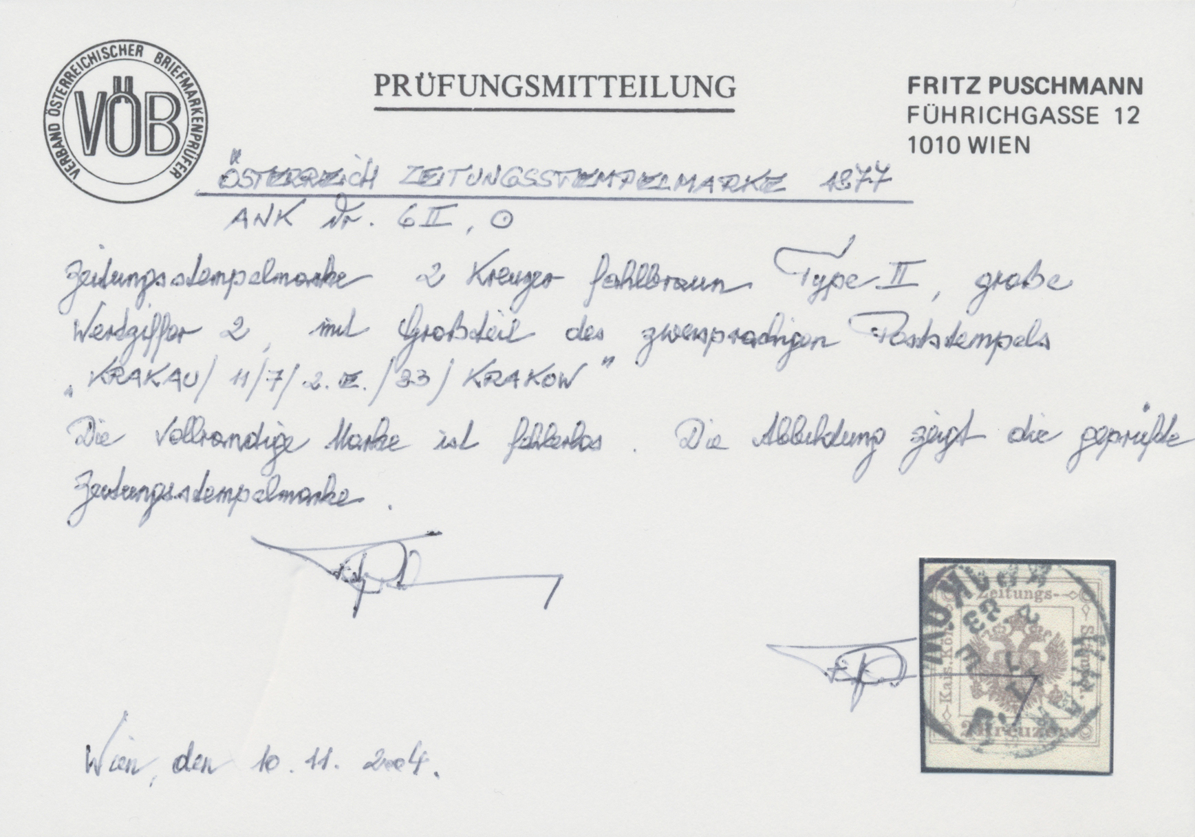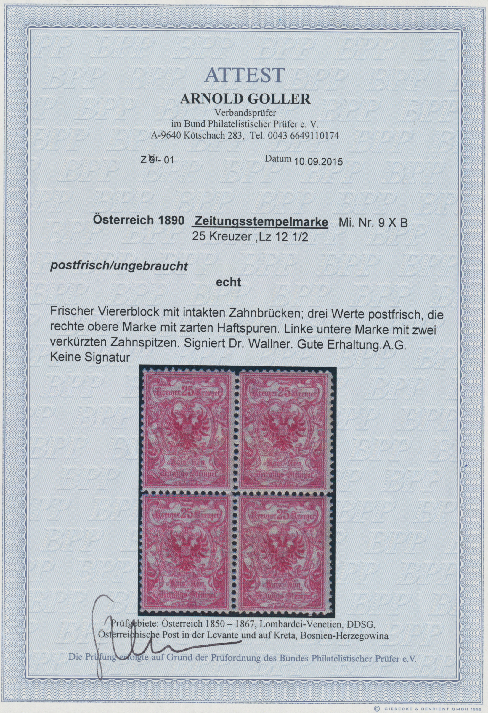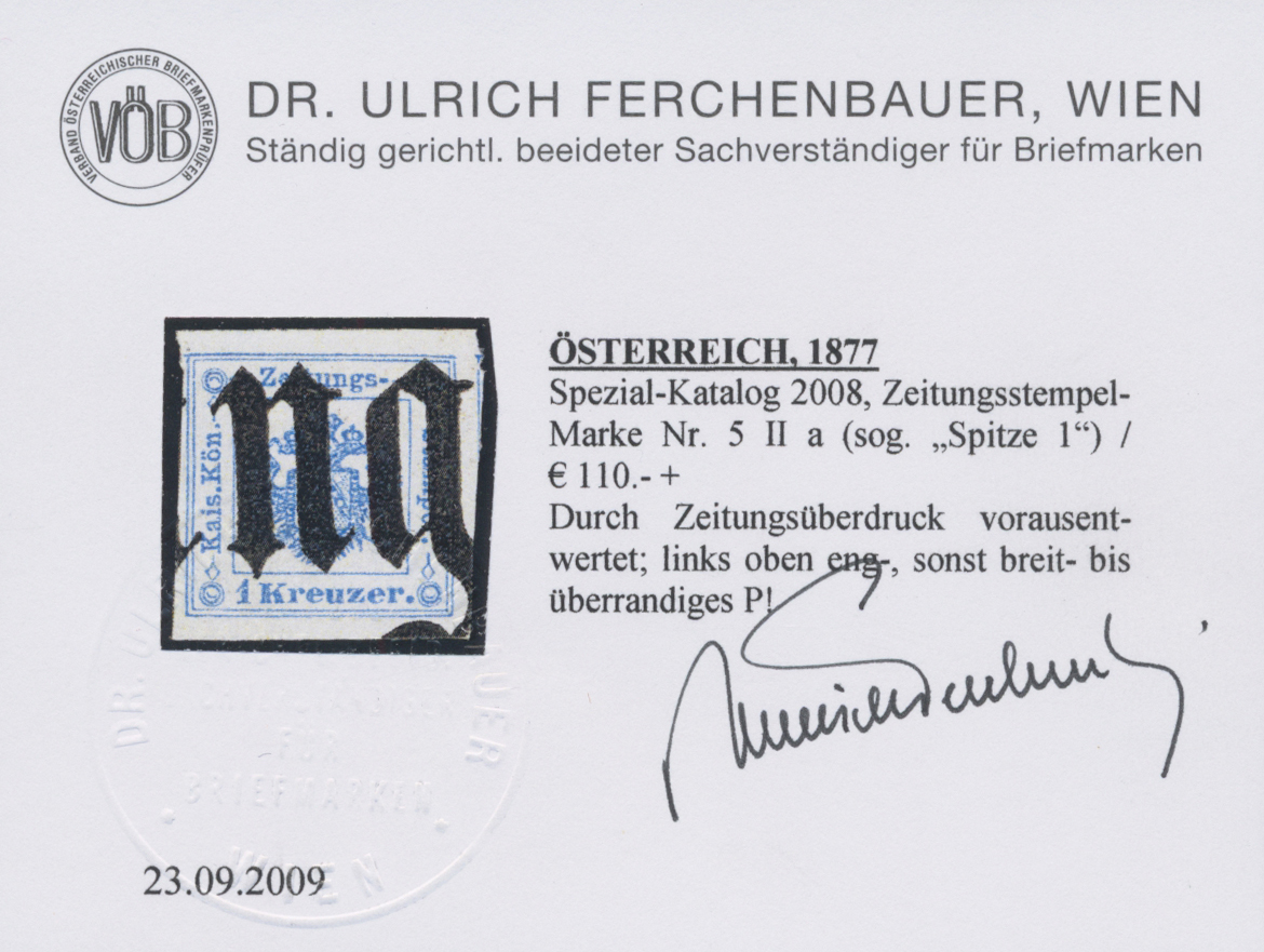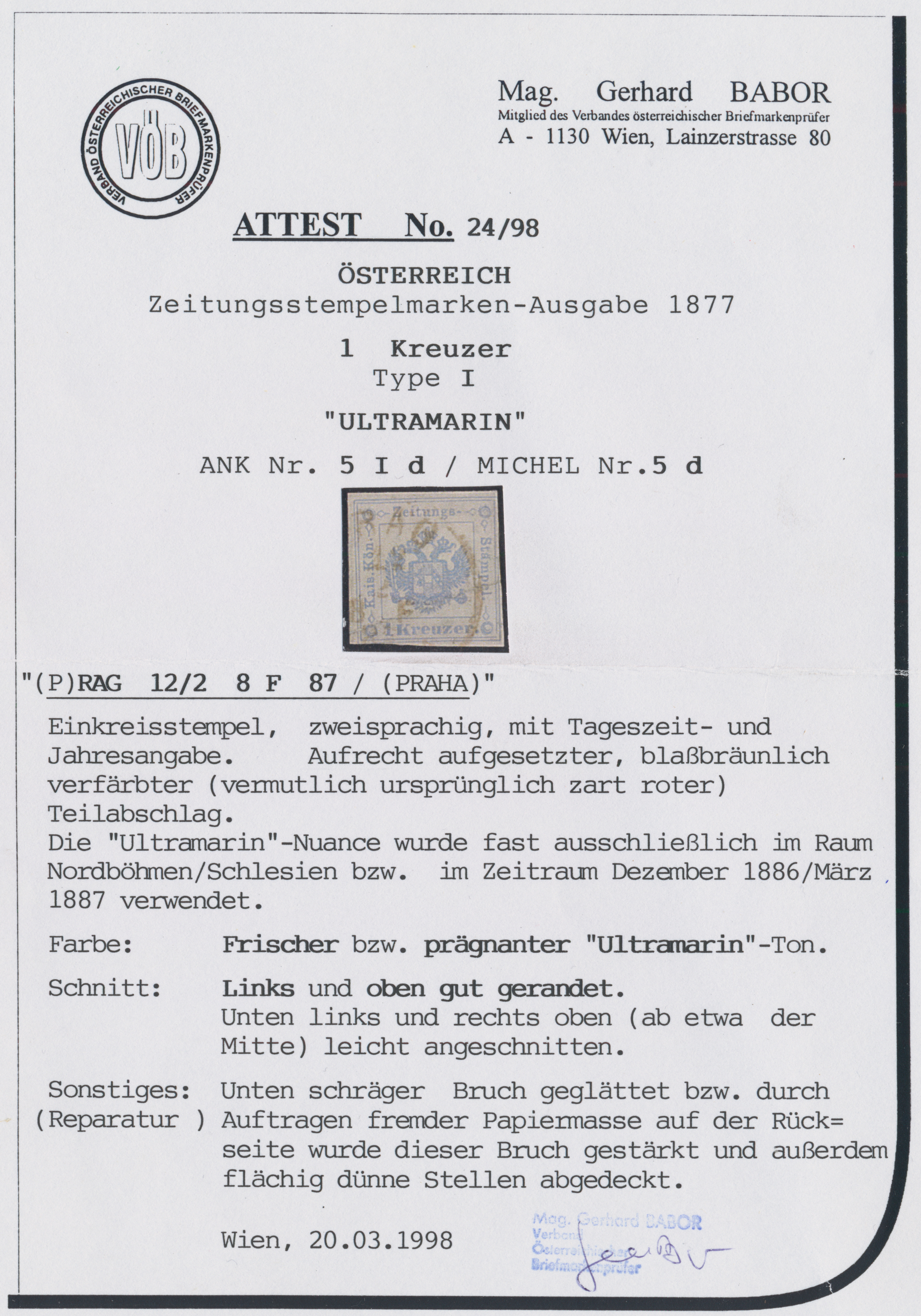 Randlinien der linken obere Ecke teils abgetrennt, sonst voll- bis überrandig in besonders farbfrischer, ursprünglicher Erhaltung, sauber entwertet durch Zeitungsüberdruck. Rarität der österreichischen Zeitungsstempelmarken. Fotoattest Ferchenbauer.