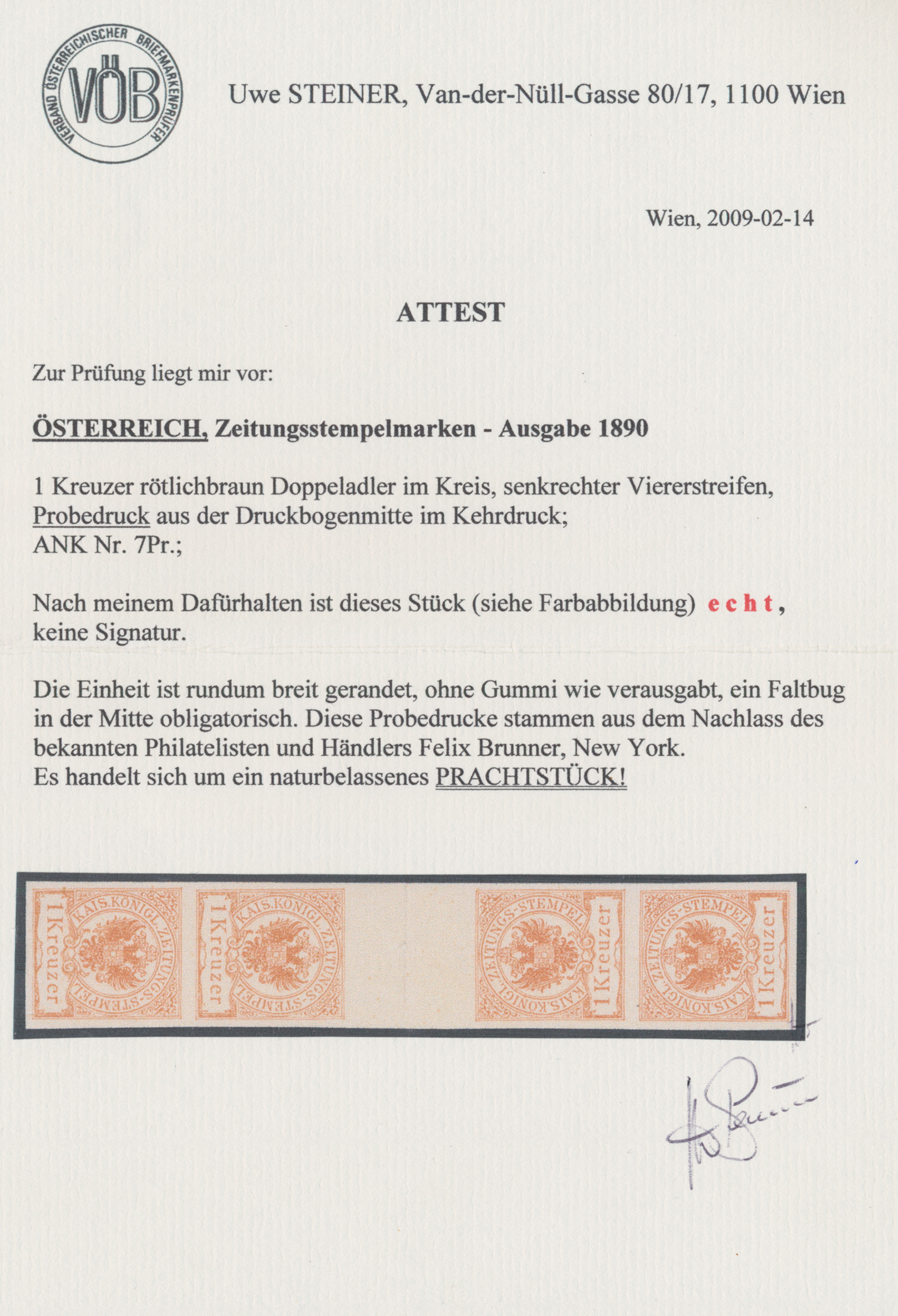 1890, 1 Kr rötlichbraun, senkrechter 4er-Streifen, Probedruck mit senkrechtem Kehrdruckpaar aus der Bogenmitte, ungebraucht ohne Gummierung wie