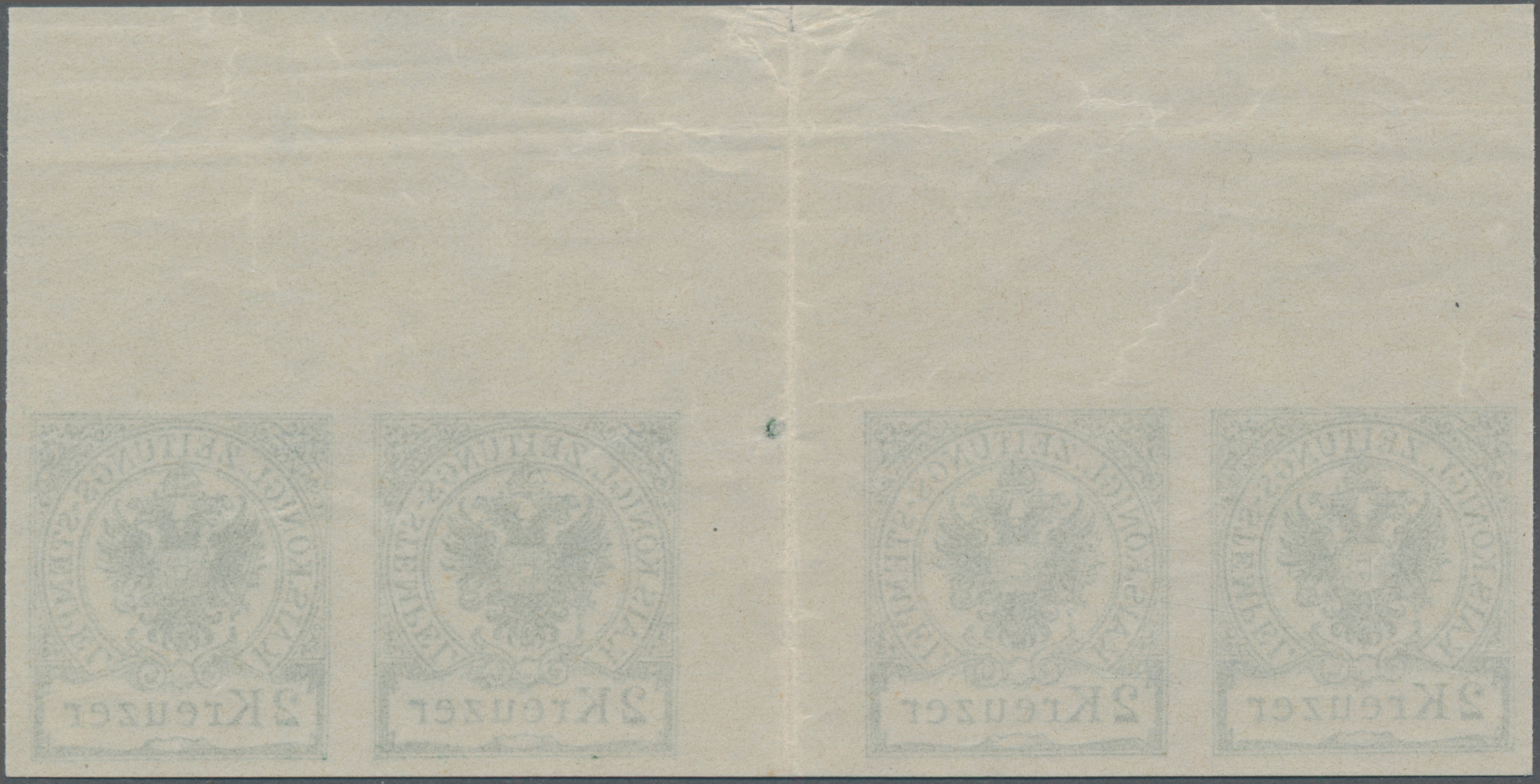1890, 2 Kr grün, PROBEDRUCK als waagerechter 4er-Streifen mit Zwischensteg vom Oberrand mit grünem Nadelpunkt, wie hergestellt ohne Gummierung,