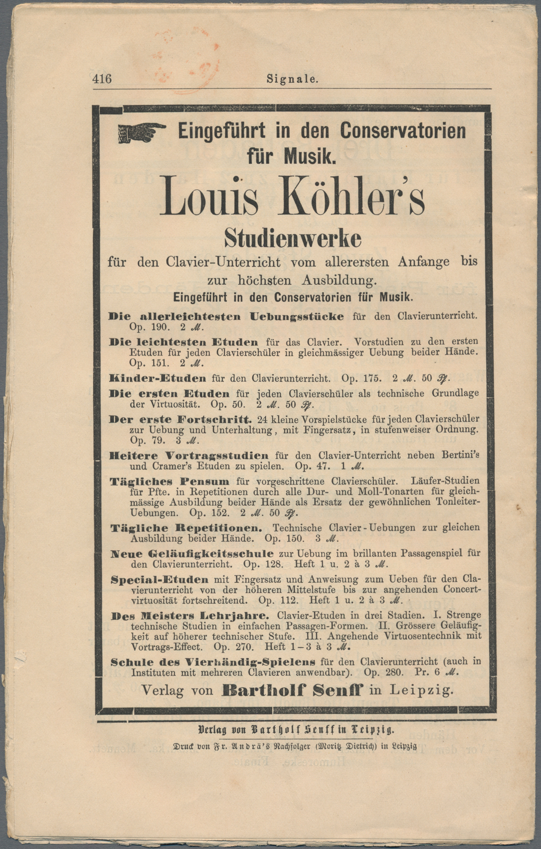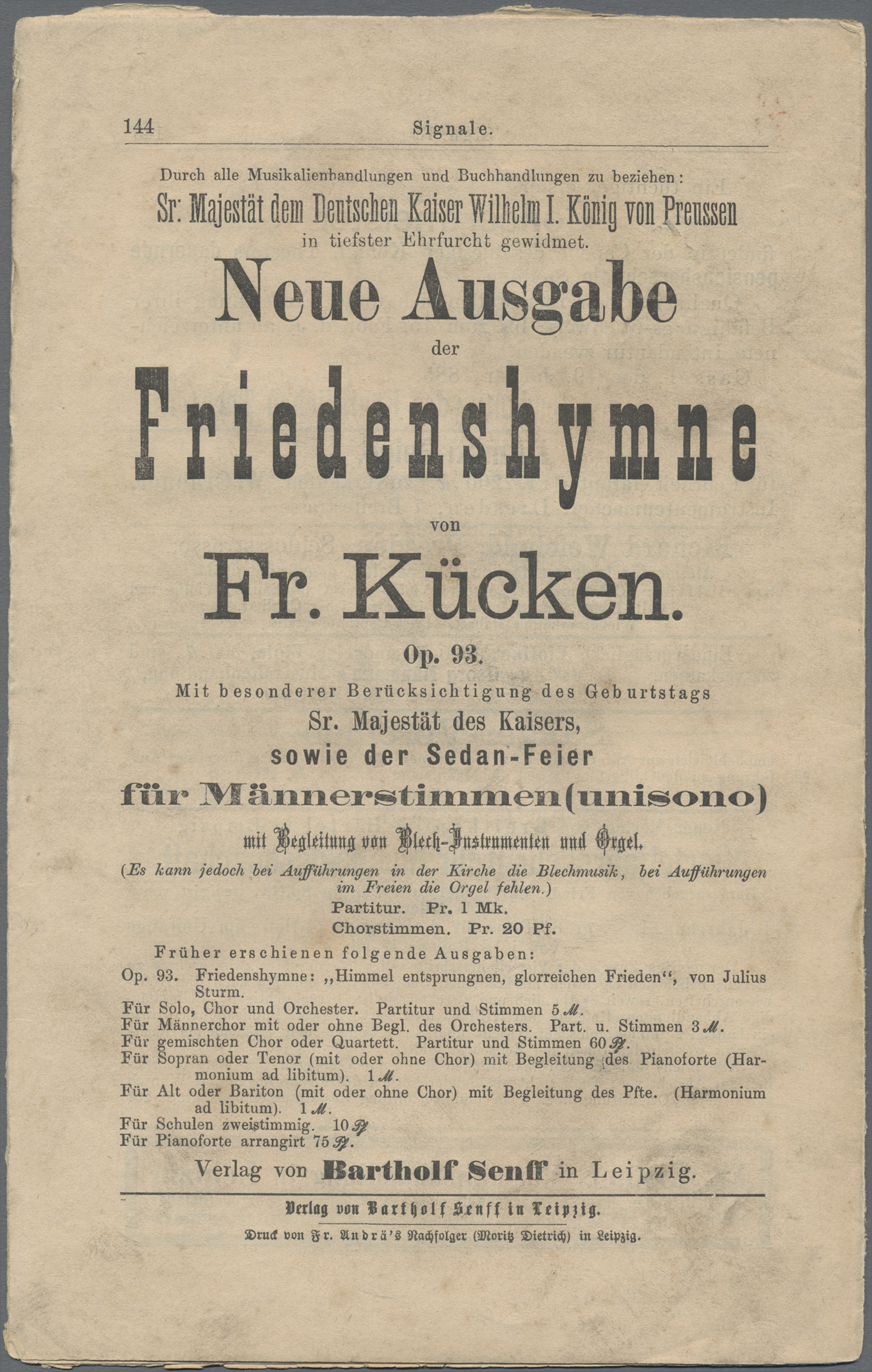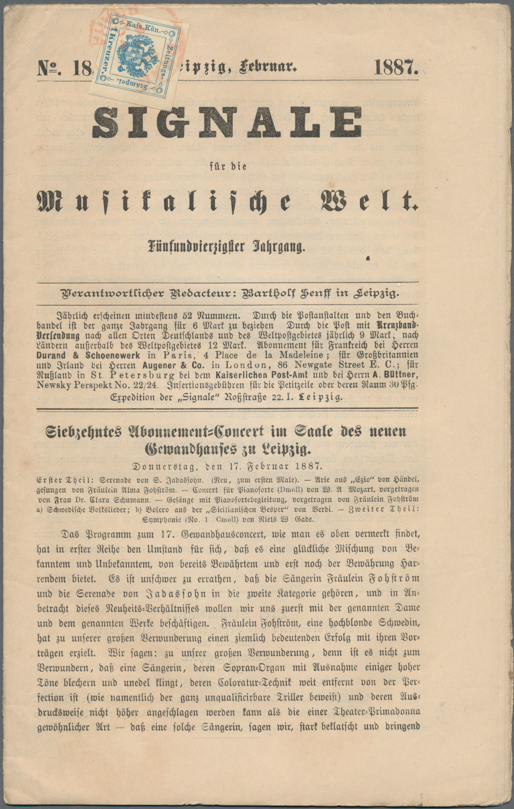 EF auf kompl. Zeitungsjournal "SIGNALE für die Musikalische Welt" Leipzig Nr.7 Januar 1887 bzw. Nr.18 Februar 1887. Attraktive und außergewöhnliche Kombination.