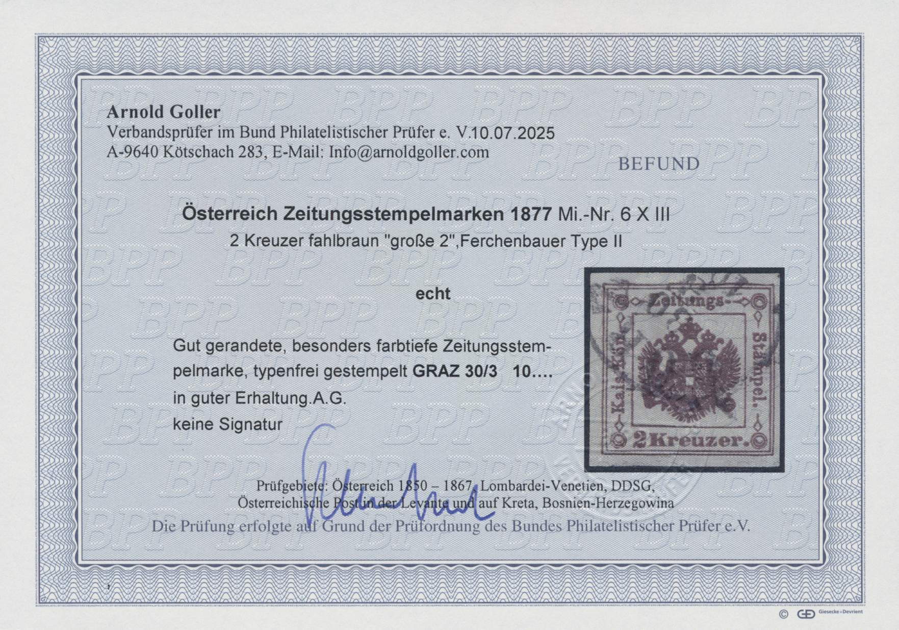 verschiedene Poststempel, Fiskalstempel bzw. durch Zeitungsüberdruck, violette u. blaue Stempel etc. Gute Erhaltung, eine Marke mit KB Ferchenbauer, Fe.-Katalog 1.500.-€+