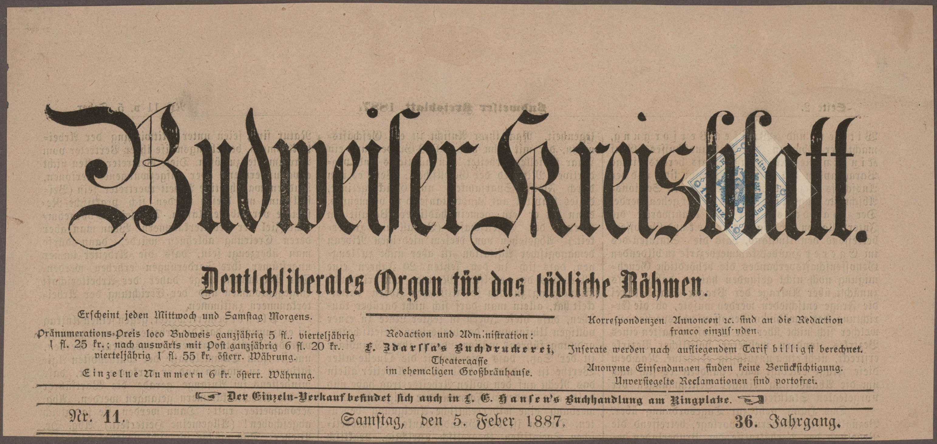 1886/1896, ECKRANDSTÜCKE auf Zeitung: 1 Kr blau, Type I, li. oberes ER-Stück mit Zeitungsentwertung auf Zeitungskopf 'Budweiser Kreisblatt' vom