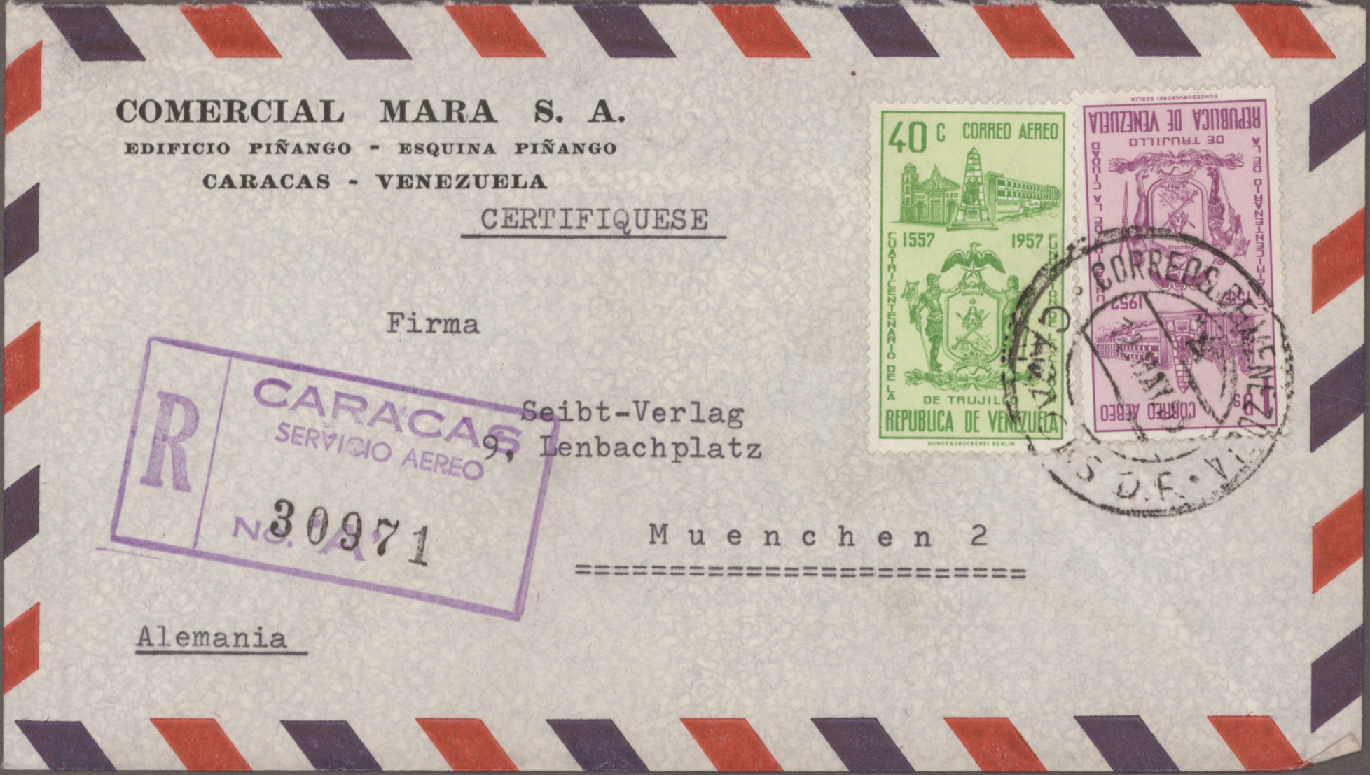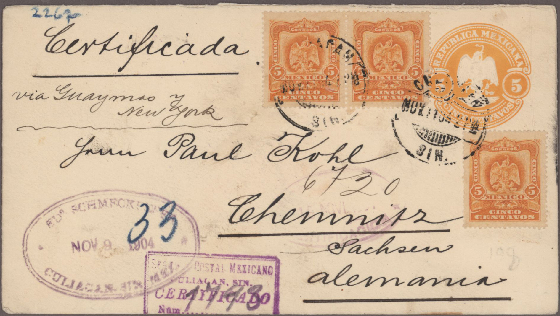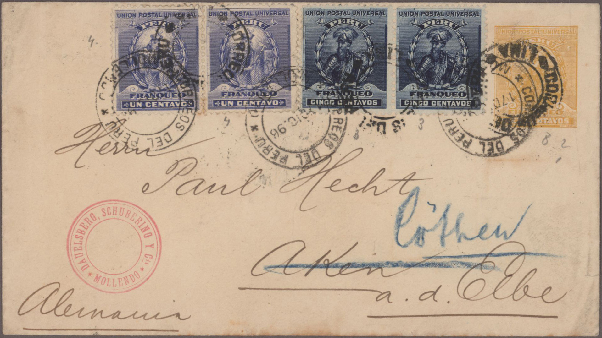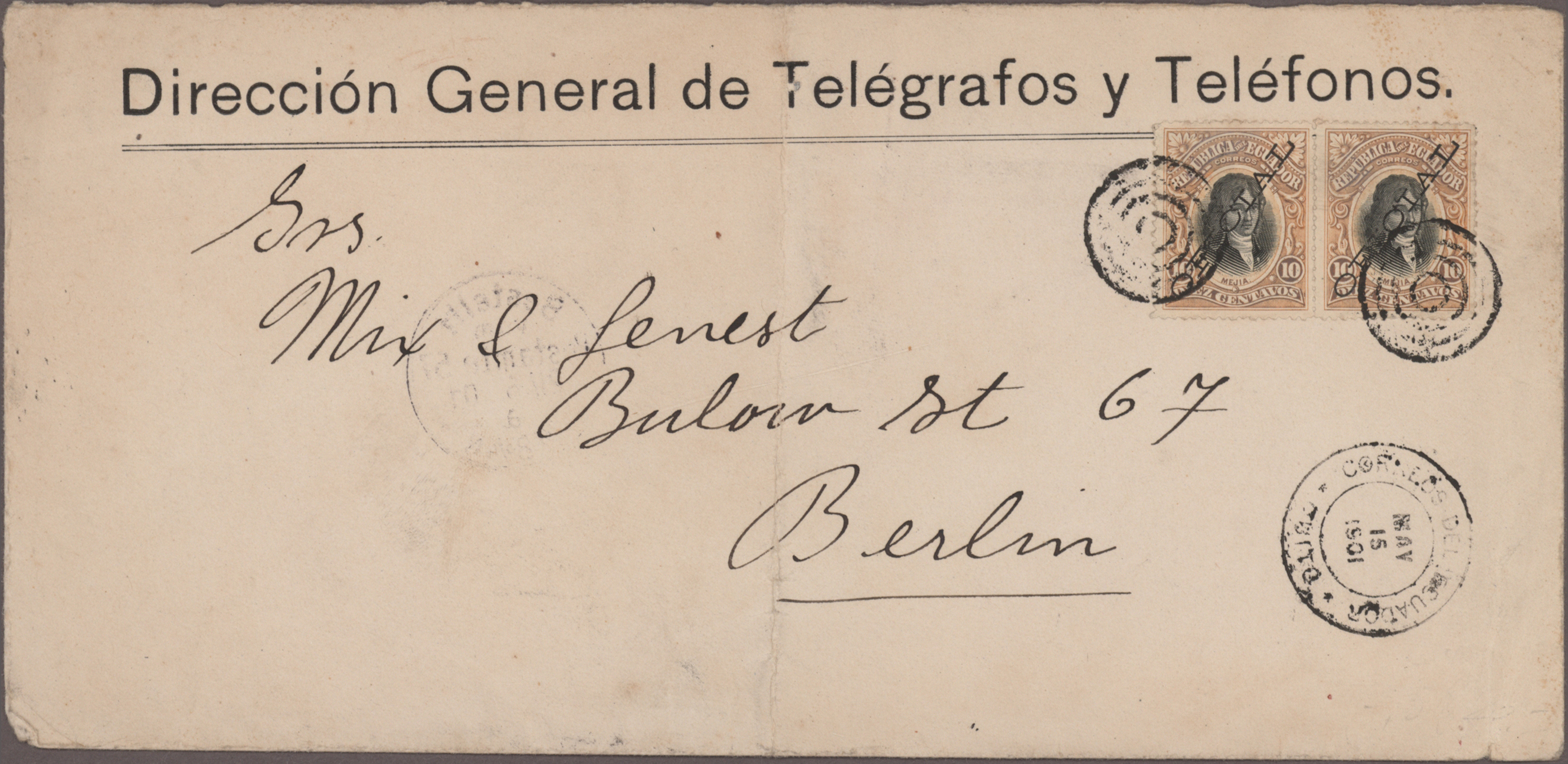 1880/1980 (ca.), sophisticated balance of apprx. 860 commercial covers/cards, comprising e.g. Mexico, Argentinia, Brazil, Chile, Peru, Venezuela, and others. Great range of interesting pieces, used stationeries, registered and airmail, etc.