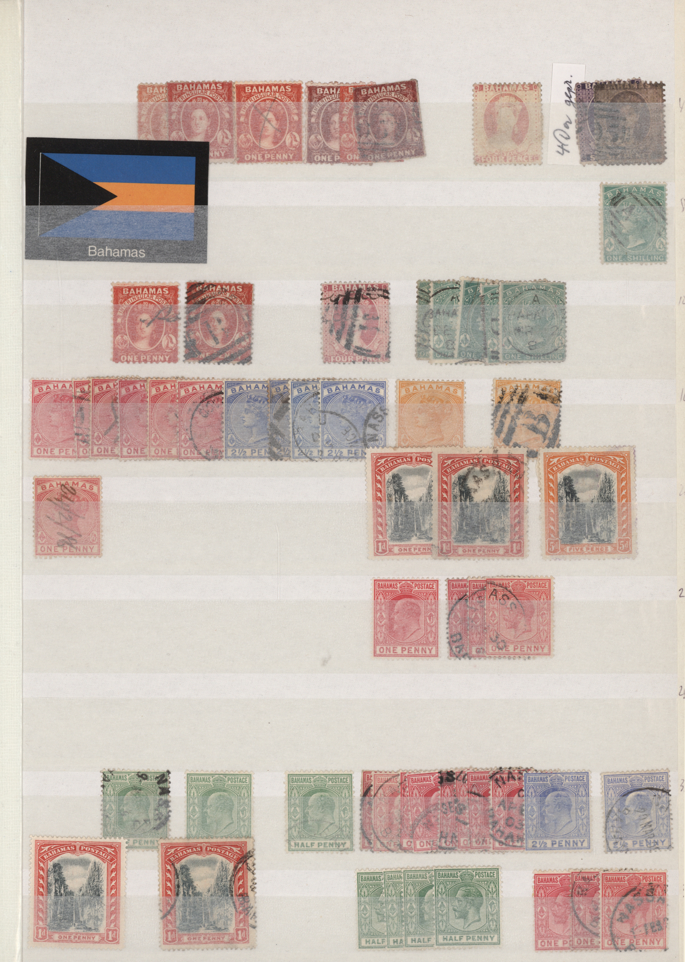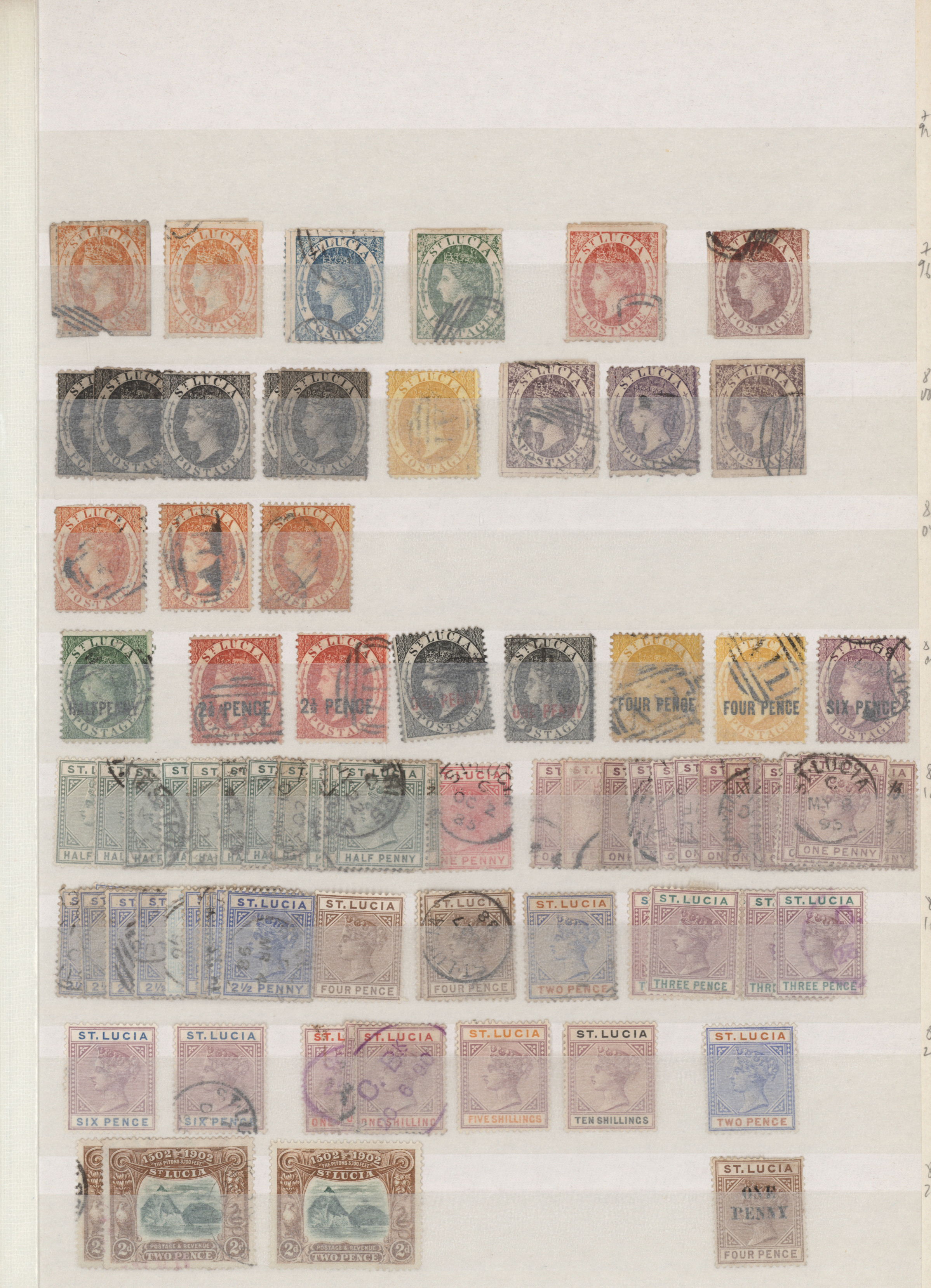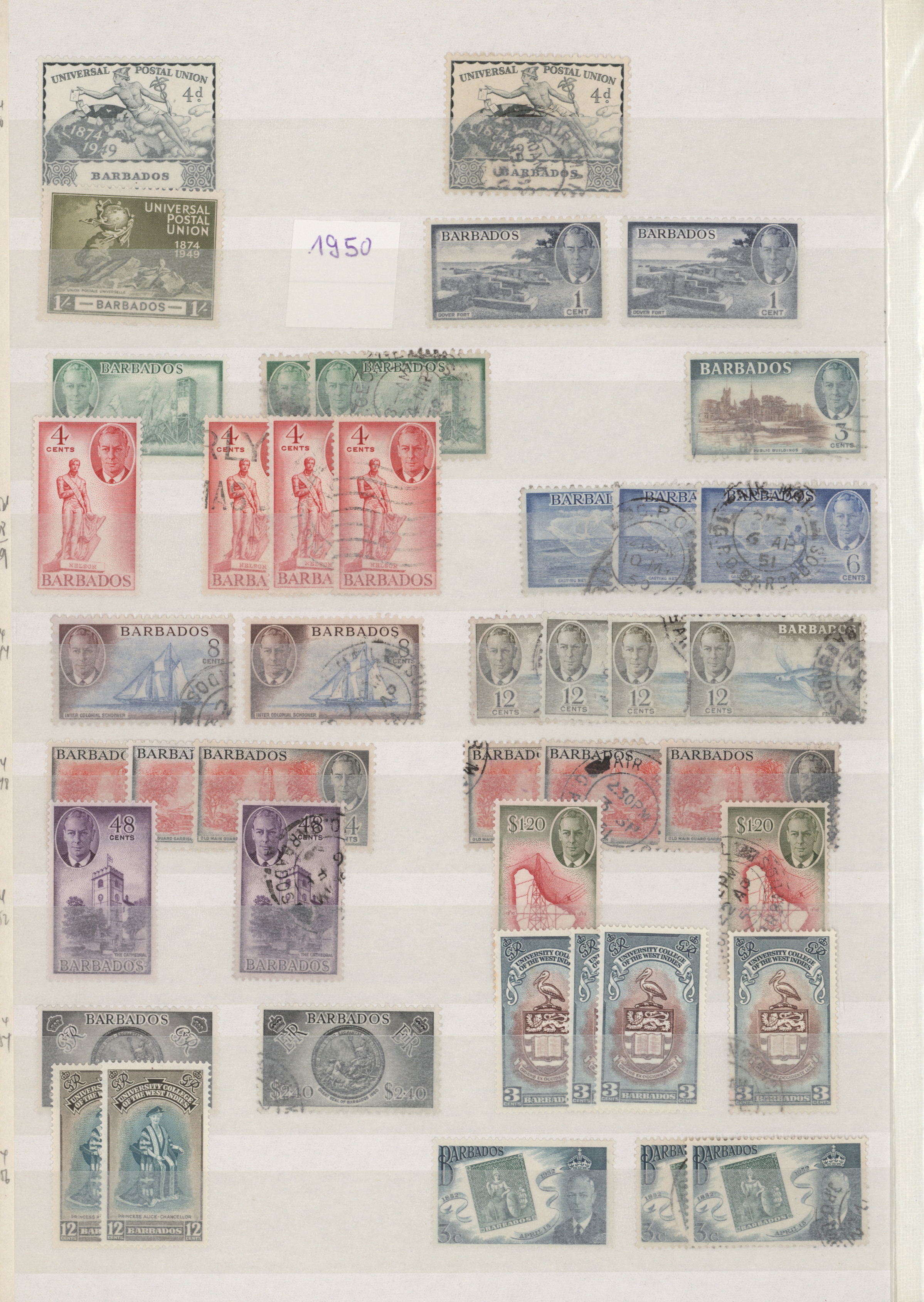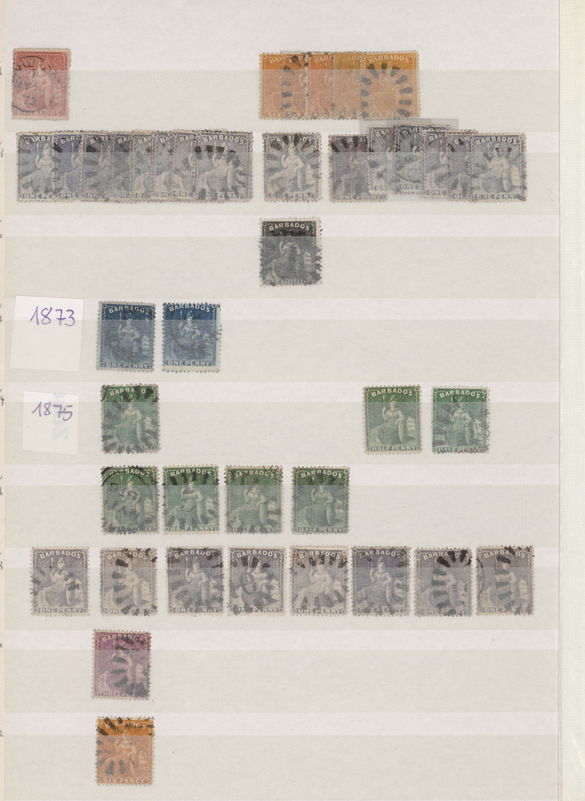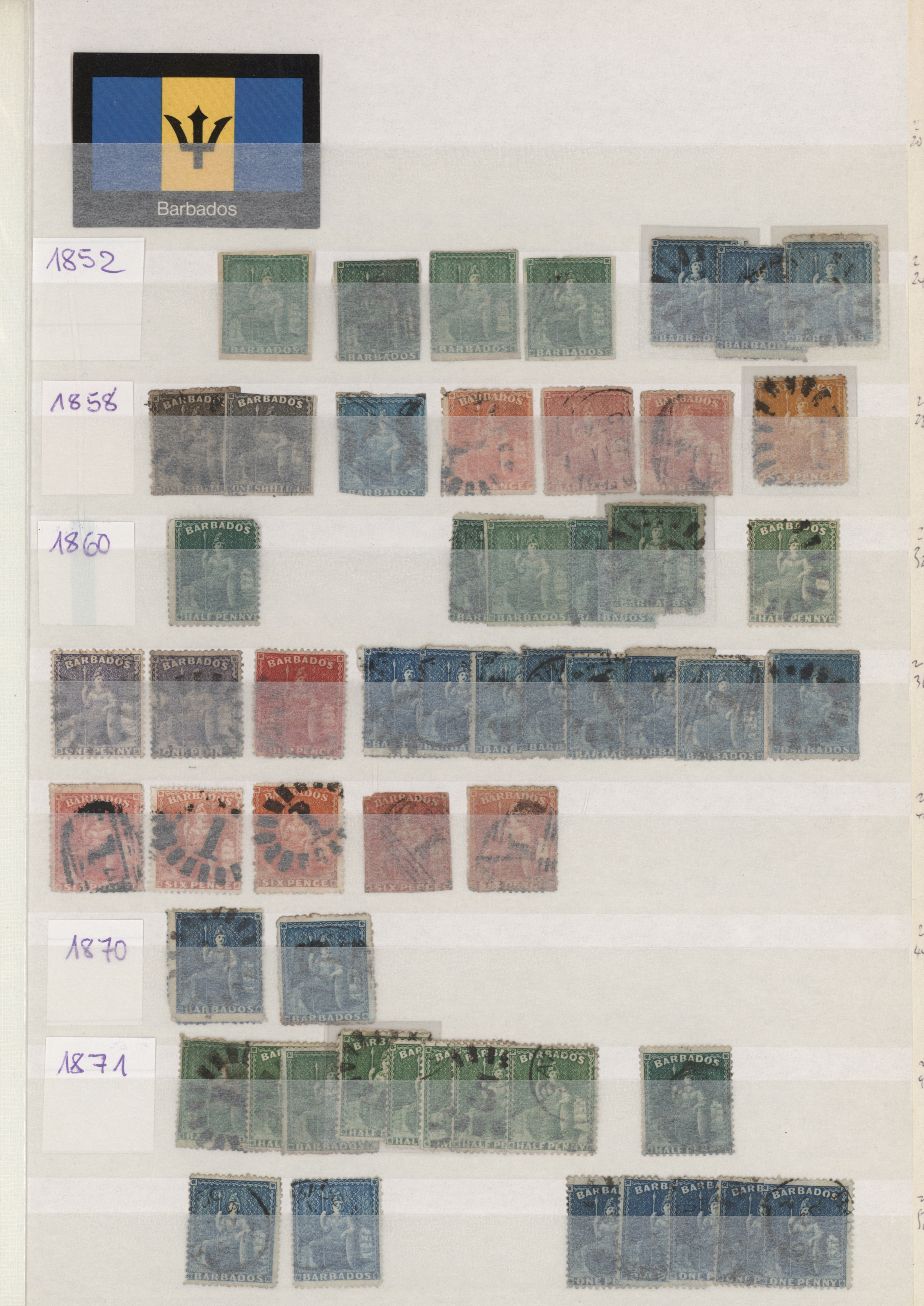1860/1960 (ca.), balance in four stockbooks and on stockcards mapping the issues of Caribbean British territories like Trinidad, Barbados, Bahamas, Bermuda, Cayman Islands, St. Vincent, Montserrat, Grenada, Antiqua, Guiana, Jamaica and others. Offers many early issues but is also sorted by cancellation (numerals, post offices etc.) including interesting pieces like Grand Cayman on a Jamaican stamp (forerunner), smaller places or offices, rail and route postmarks etc.