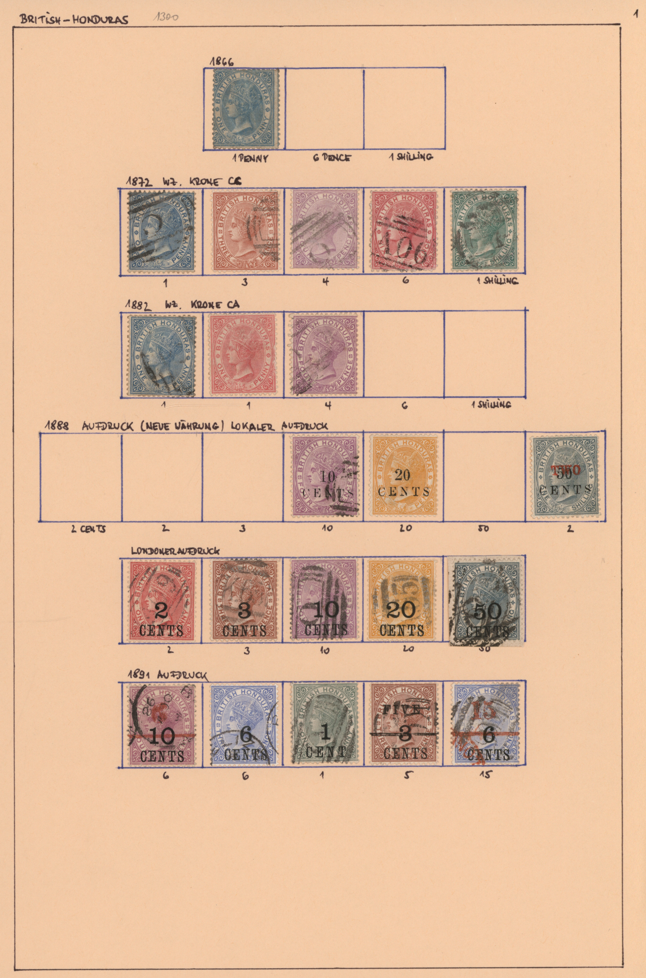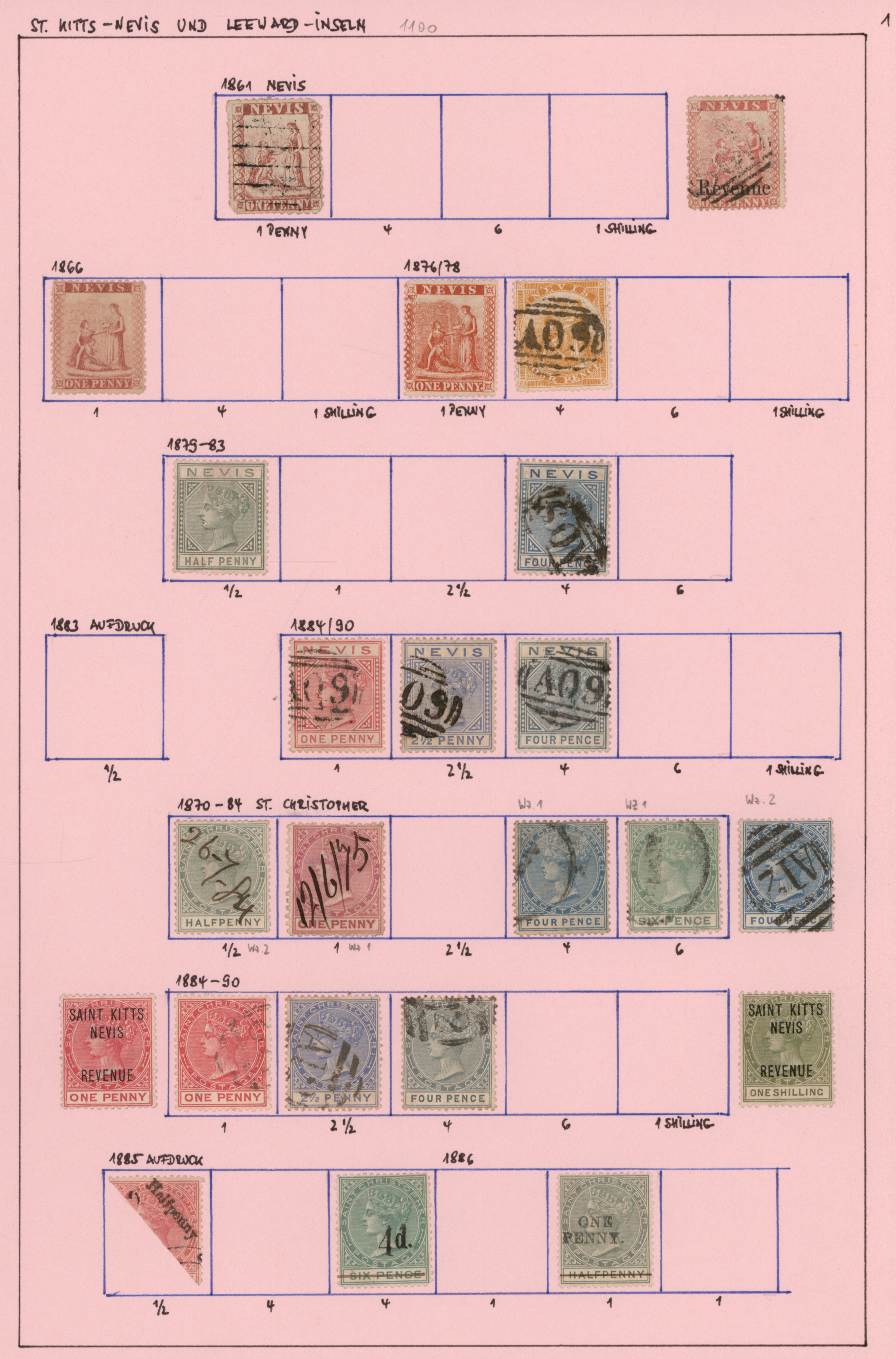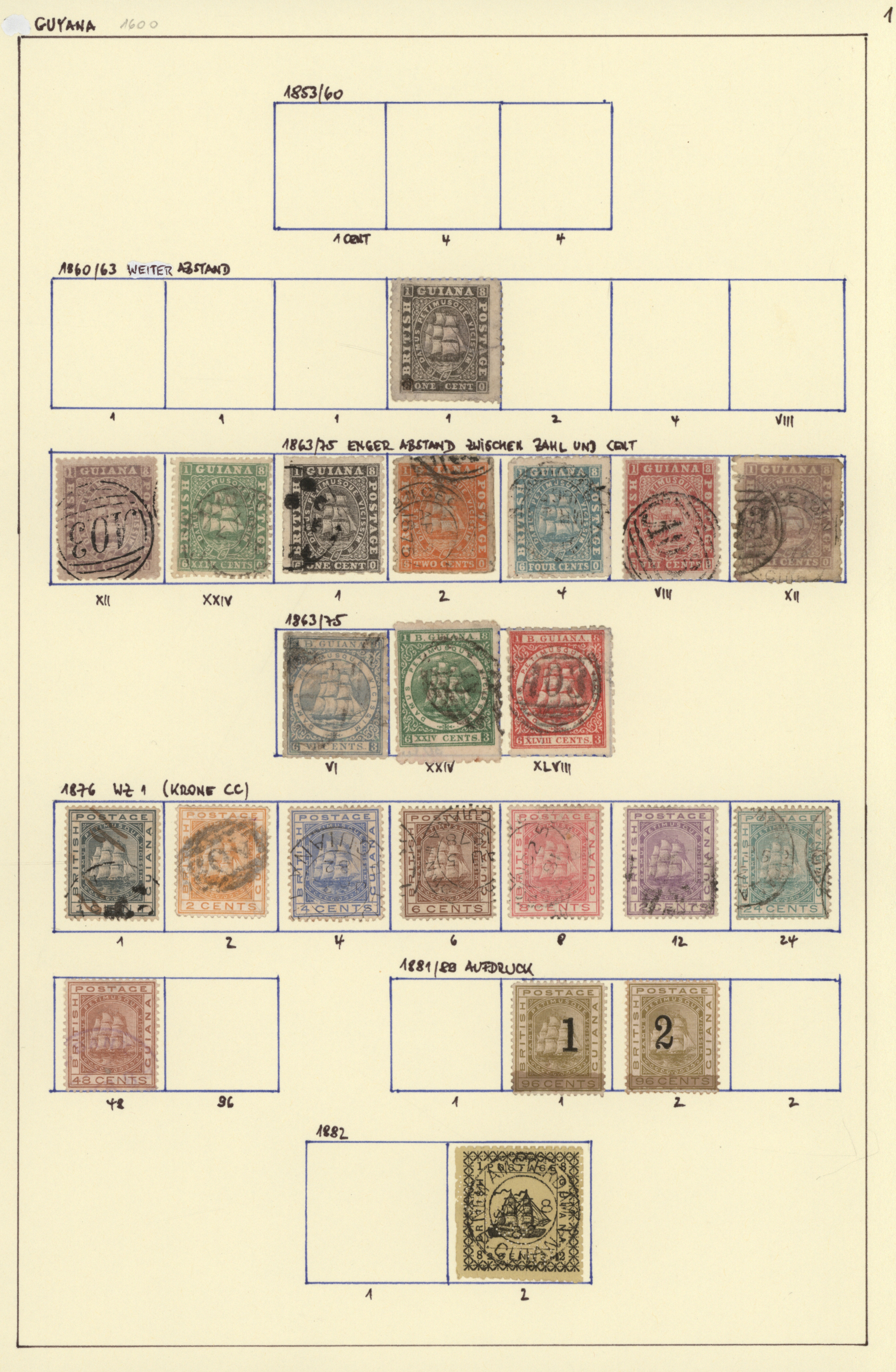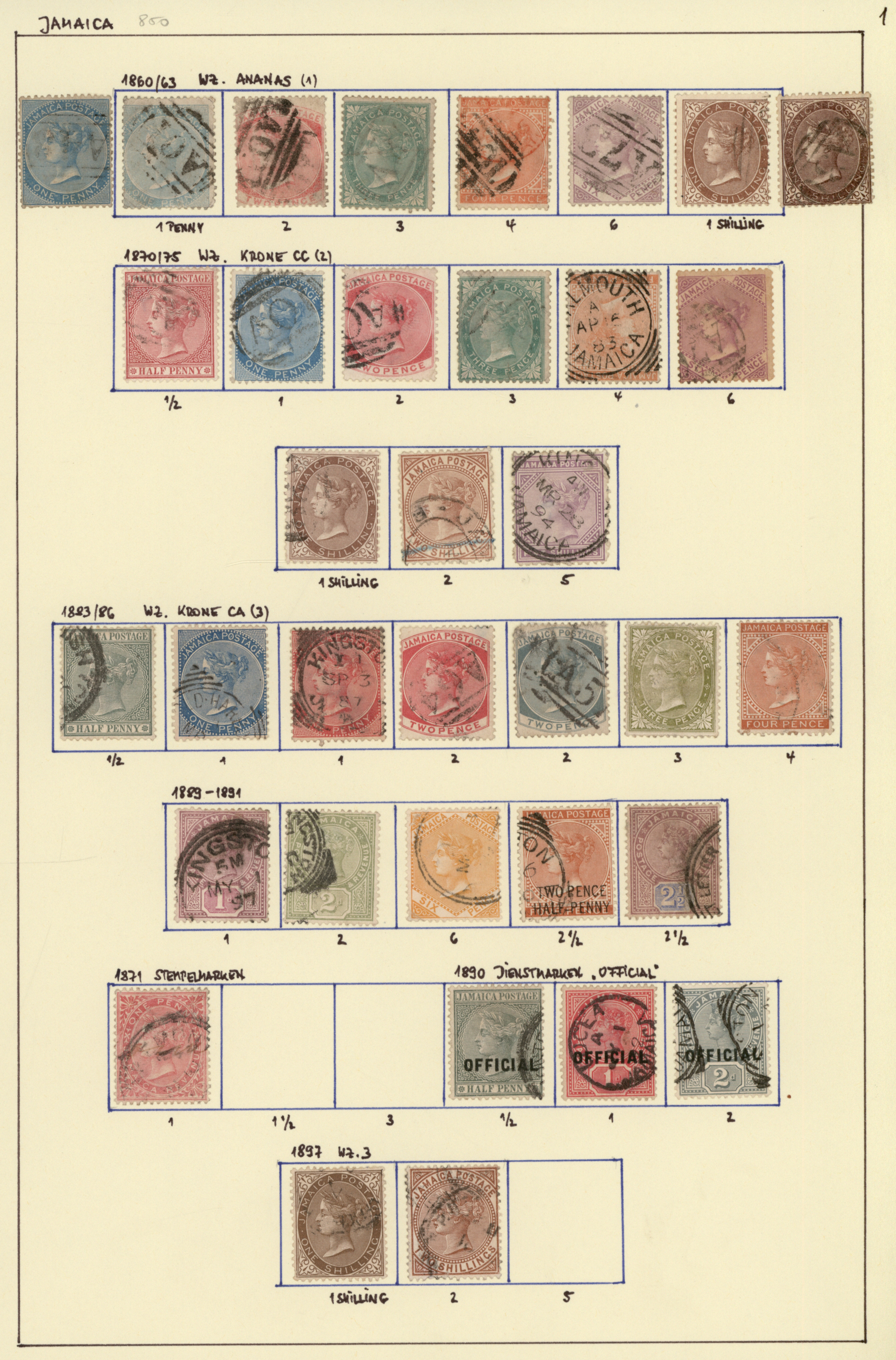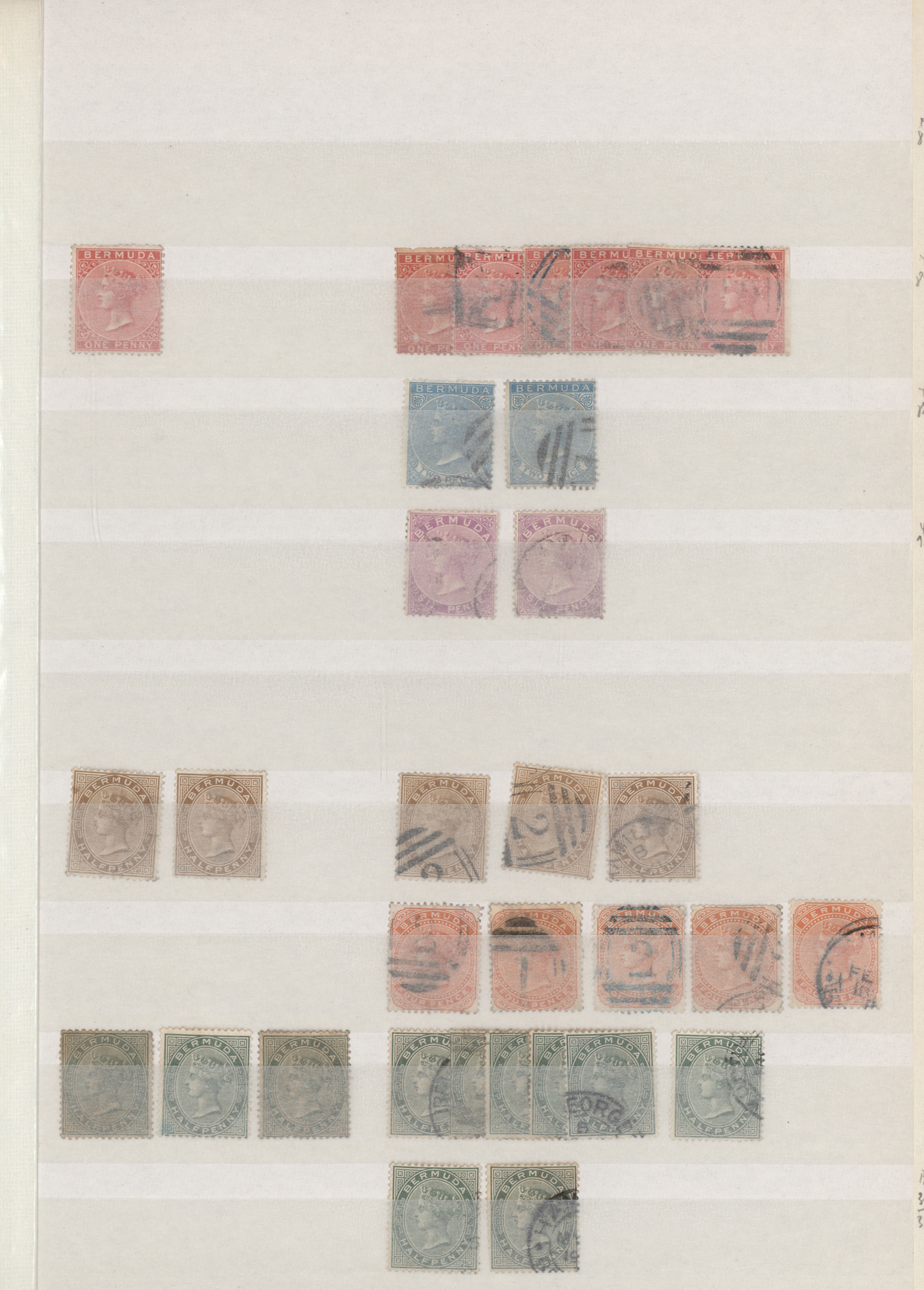 1860/1960 (ca.), balance in four stockbooks and on stockcards mapping the issues of Caribbean British territories like Trinidad, Barbados, Bahamas, Bermuda, Cayman Islands, St. Vincent, Montserrat, Grenada, Antiqua, Guiana, Jamaica and others. Offers many early issues but is also sorted by cancellation (numerals, post offices etc.) including interesting pieces like Grand Cayman on a Jamaican stamp (forerunner), smaller places or offices, rail and route postmarks etc.