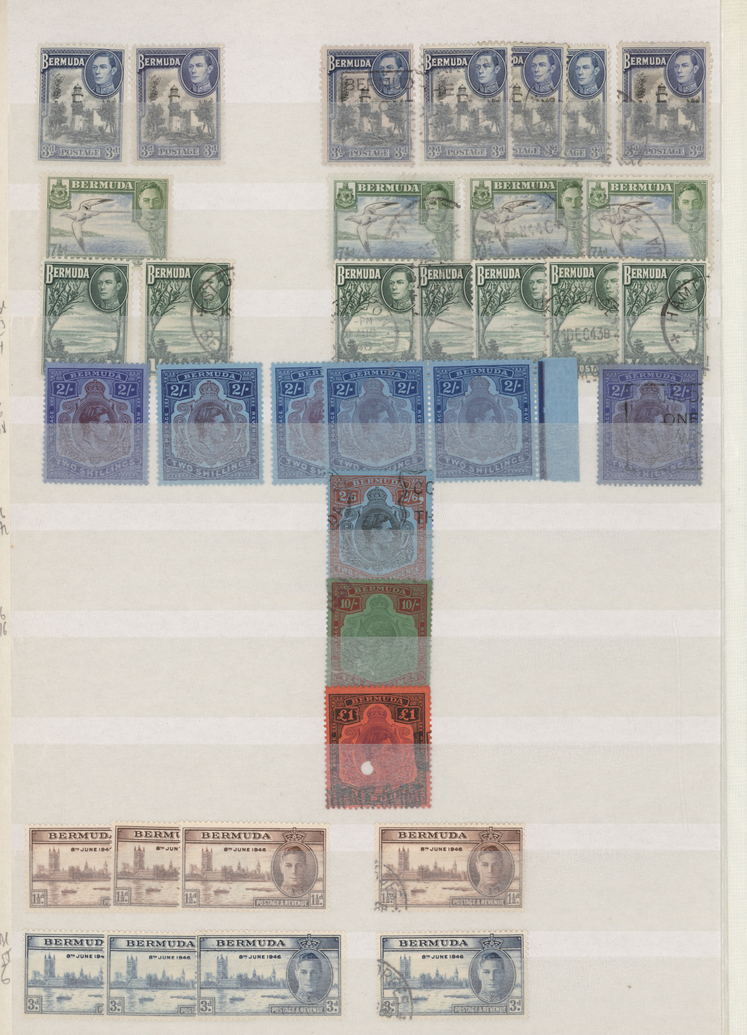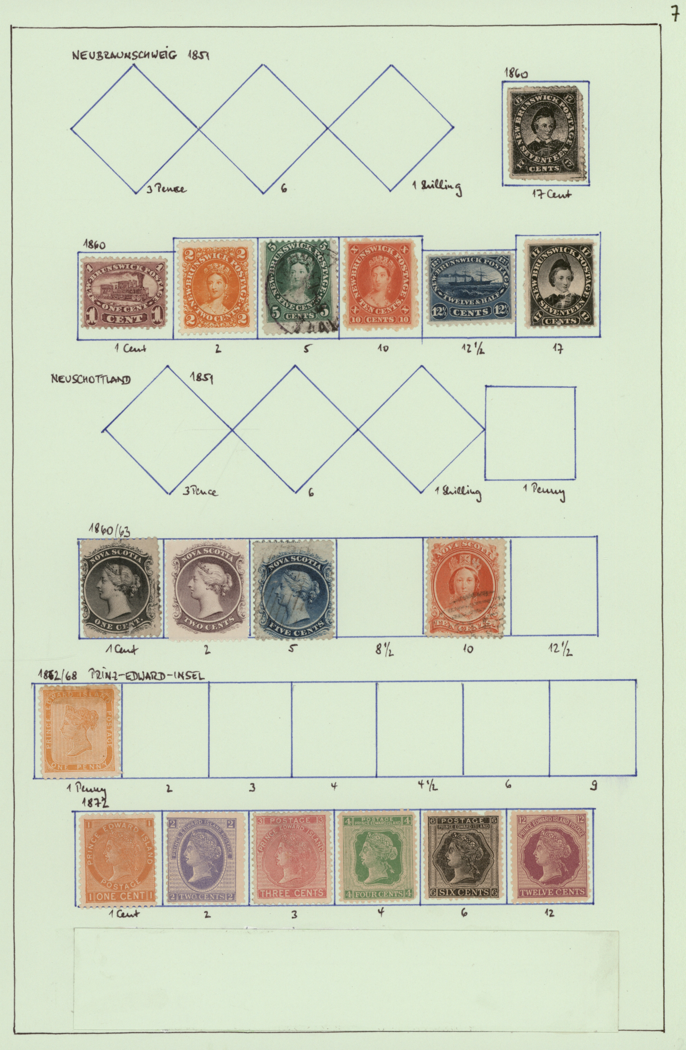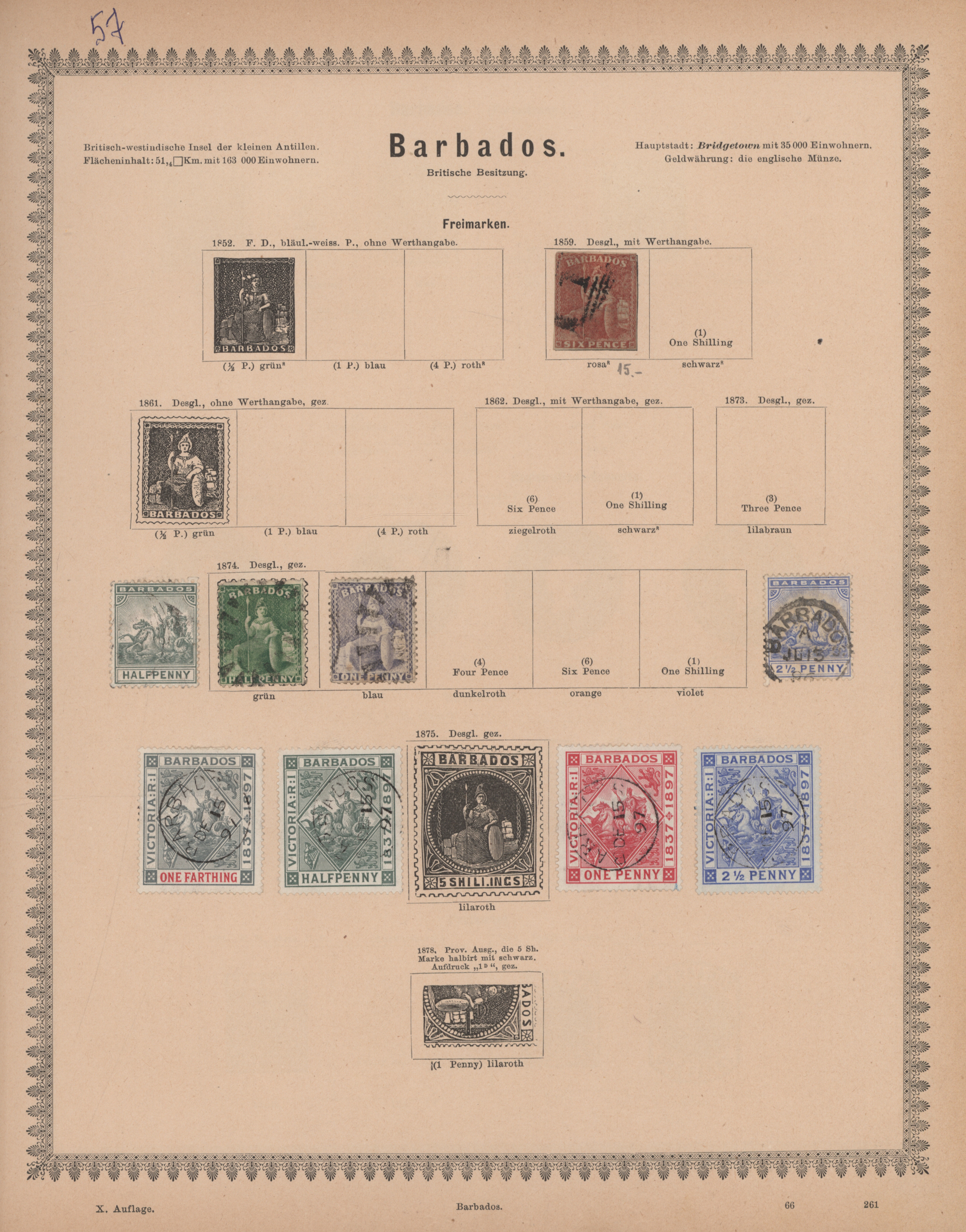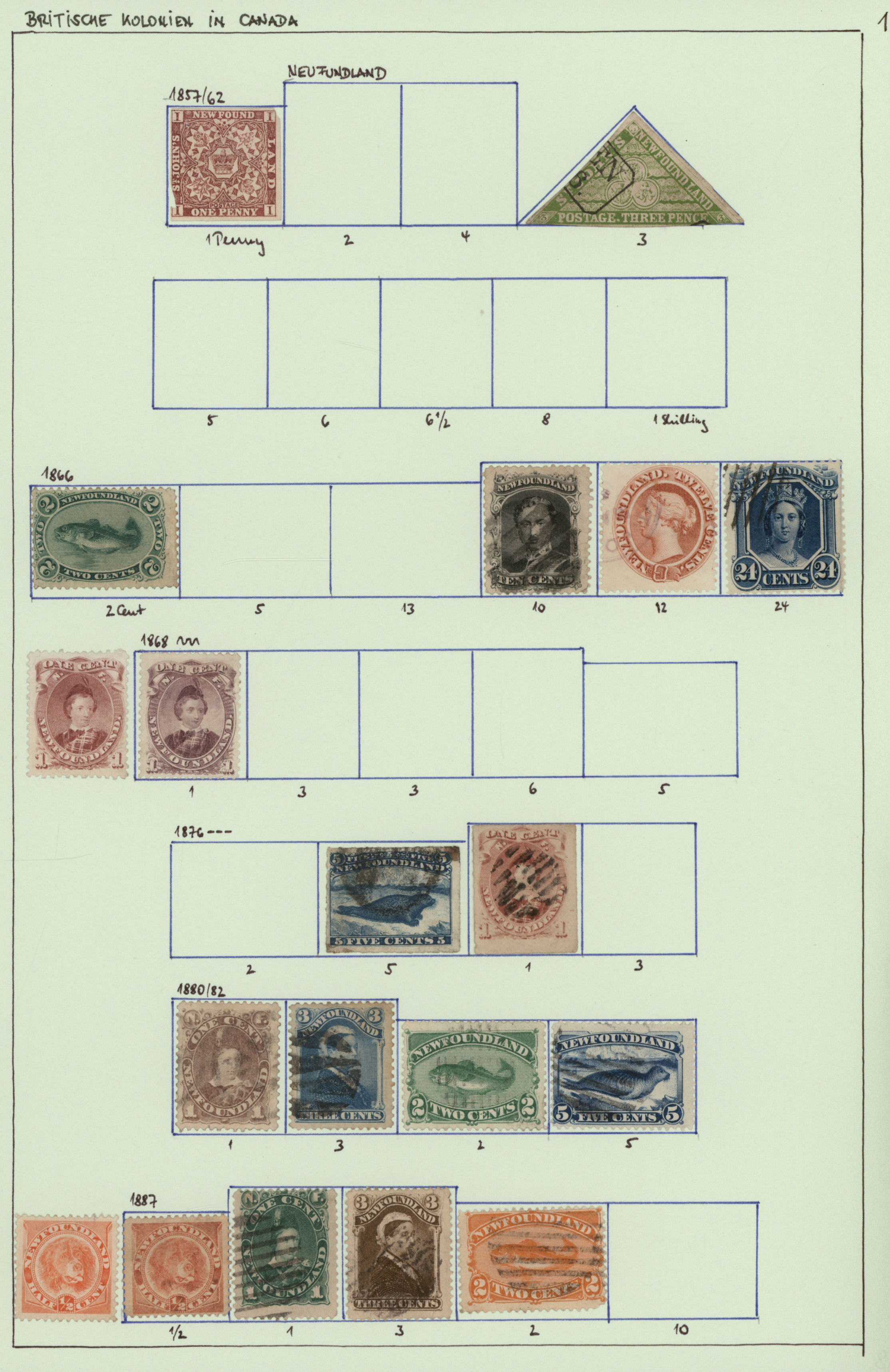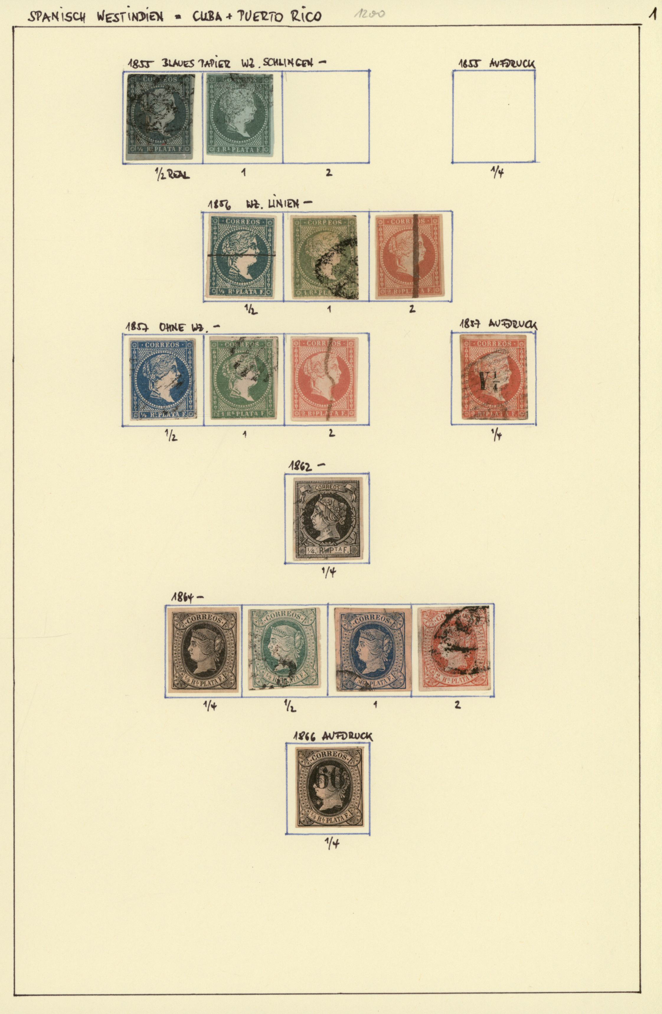 1860/1960 (ca.), balance in four stockbooks and on stockcards mapping the issues of Caribbean British territories like Trinidad, Barbados, Bahamas, Bermuda, Cayman Islands, St. Vincent, Montserrat, Grenada, Antiqua, Guiana, Jamaica and others. Offers many early issues but is also sorted by cancellation (numerals, post offices etc.) including interesting pieces like Grand Cayman on a Jamaican stamp (forerunner), smaller places or offices, rail and route postmarks etc.