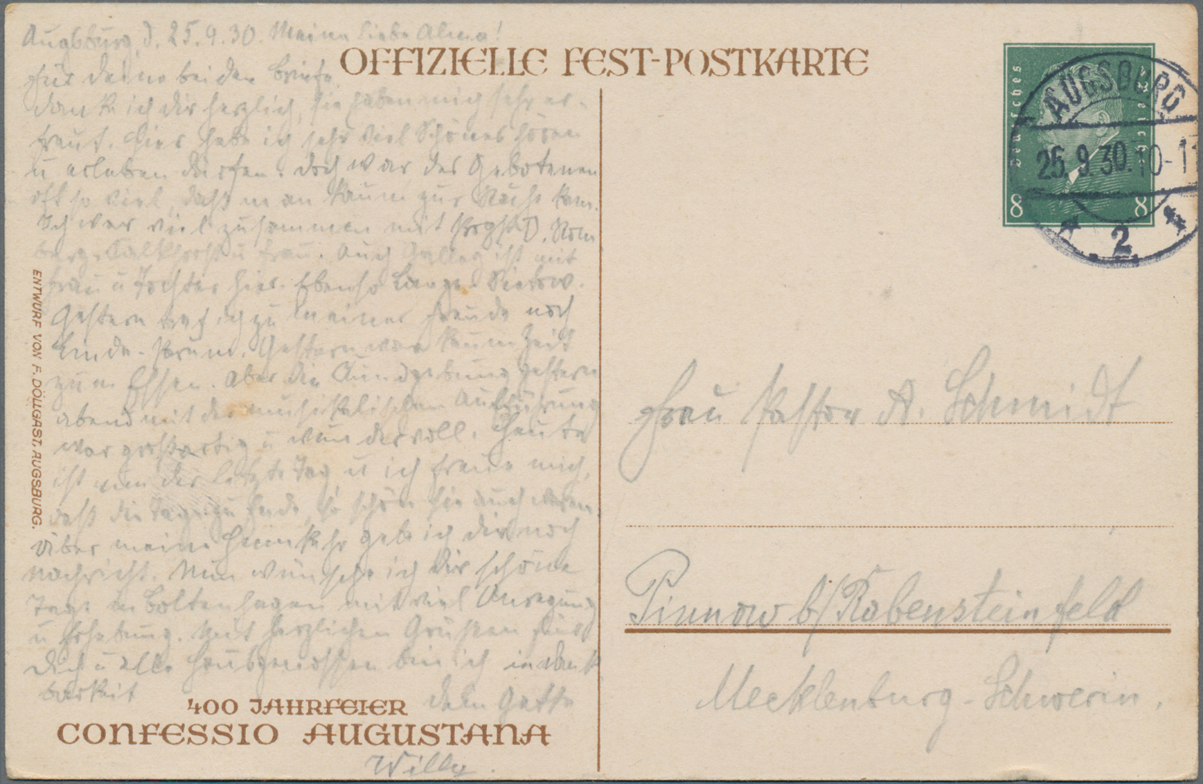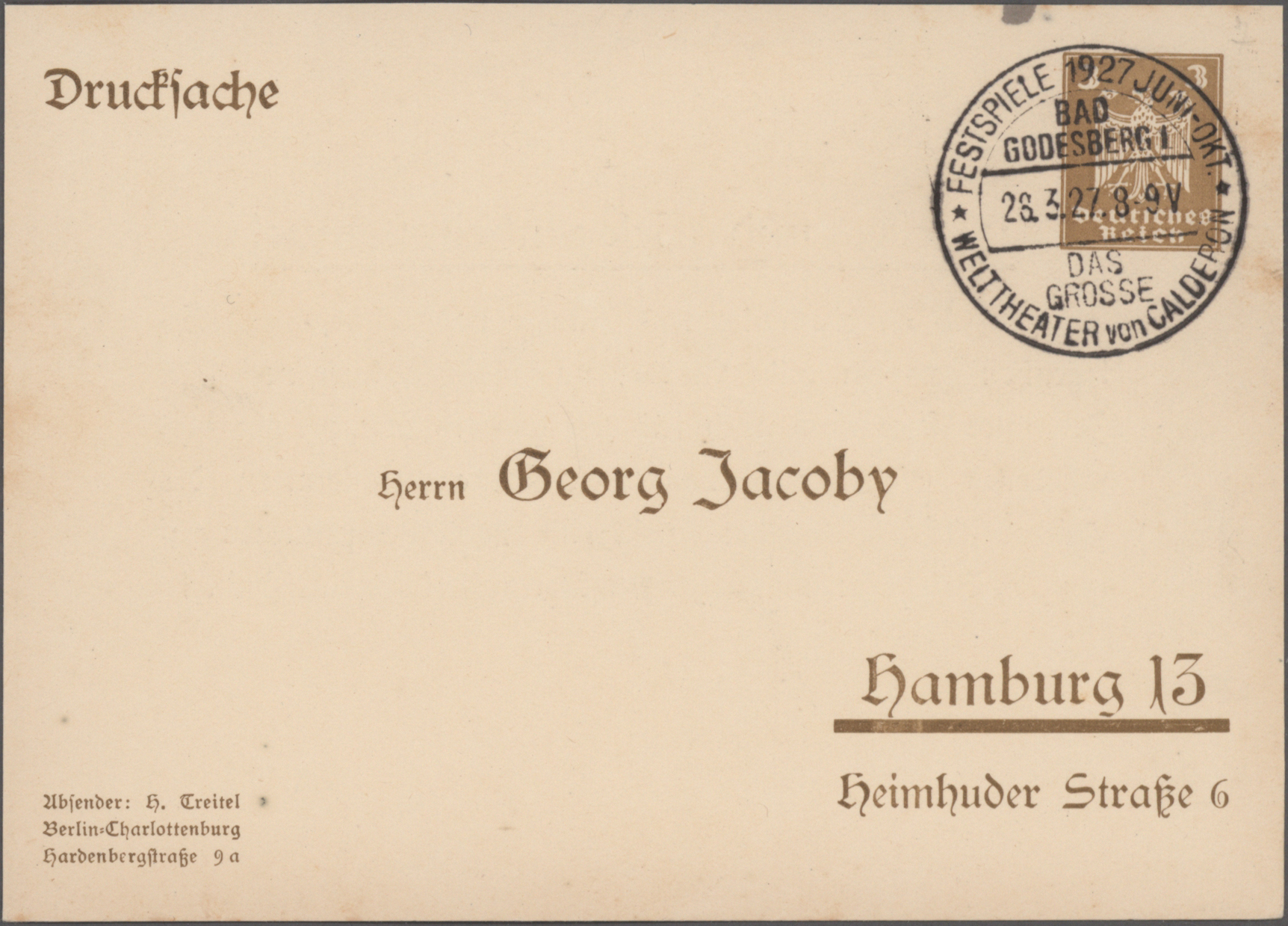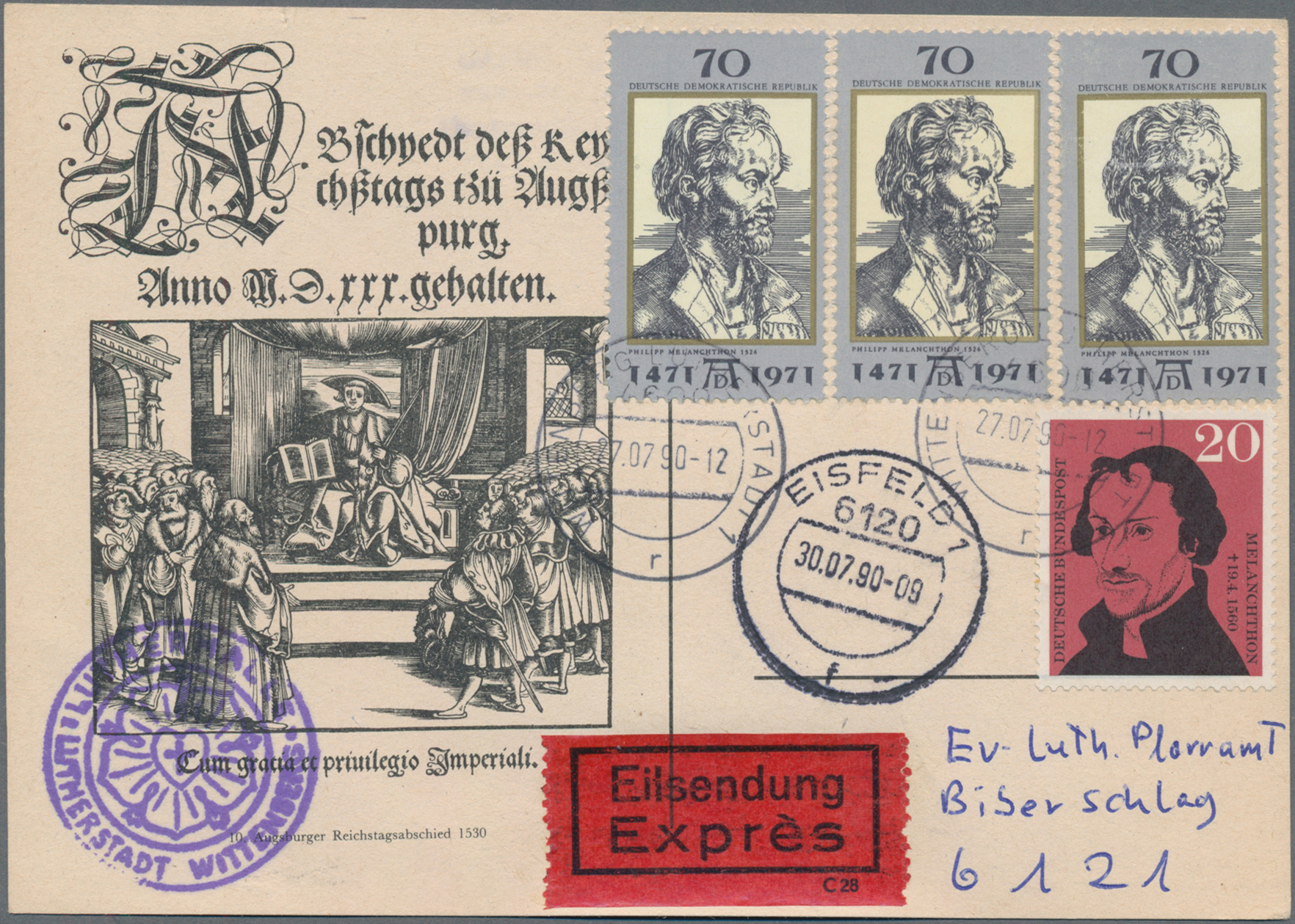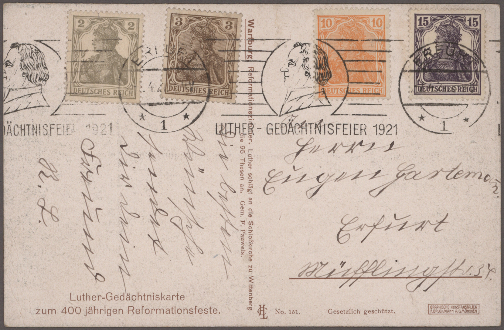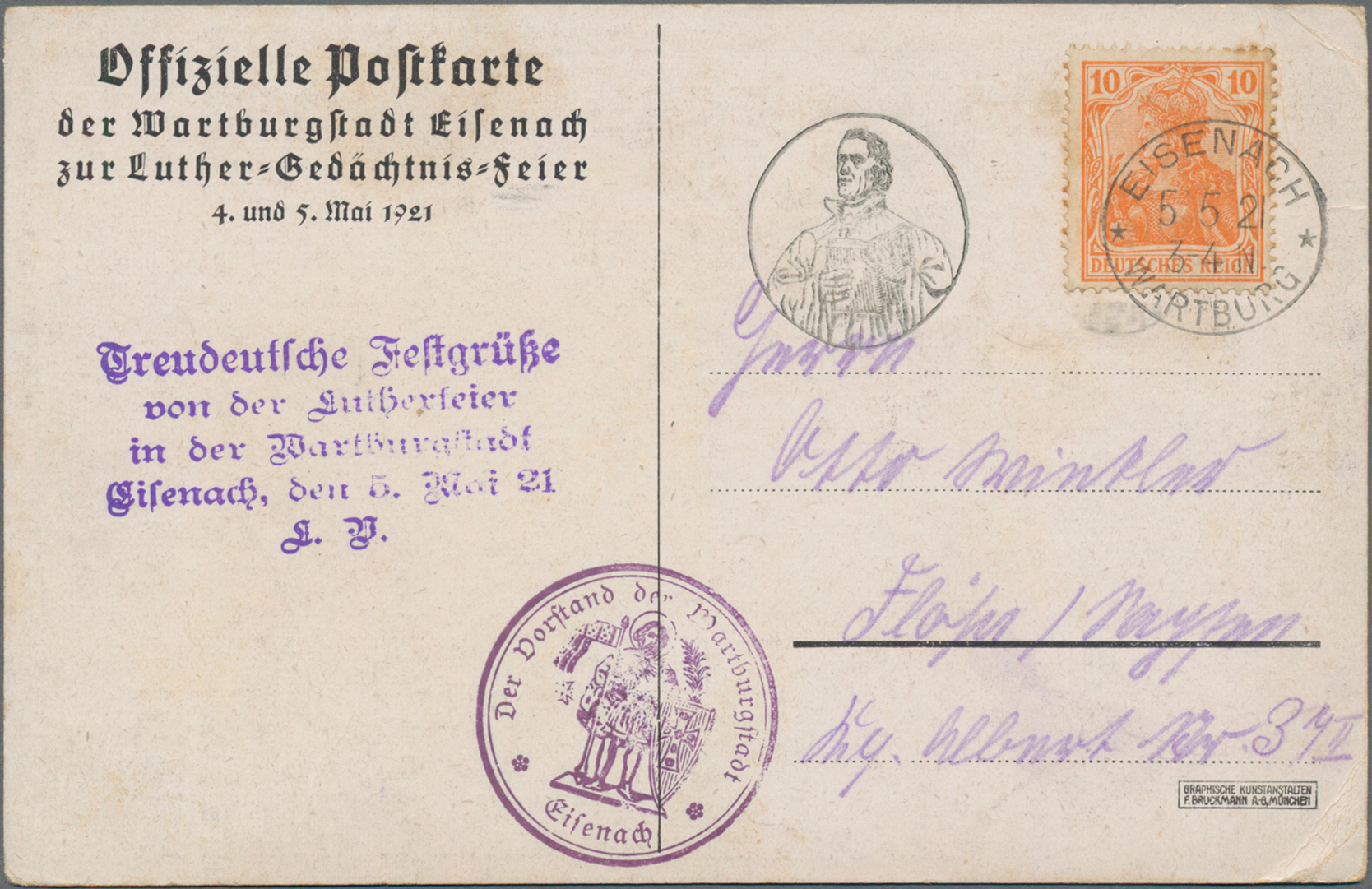 "EISLEBEN 6.11. nach Gotha mit ausführlicher Nachricht (Karte kl. Beanstandungen, u.a. fragil-eckbrüchig), weiterhin vier verschiedene ungebrauchte Karten "Lutherfestspiele 1924" in Jena.