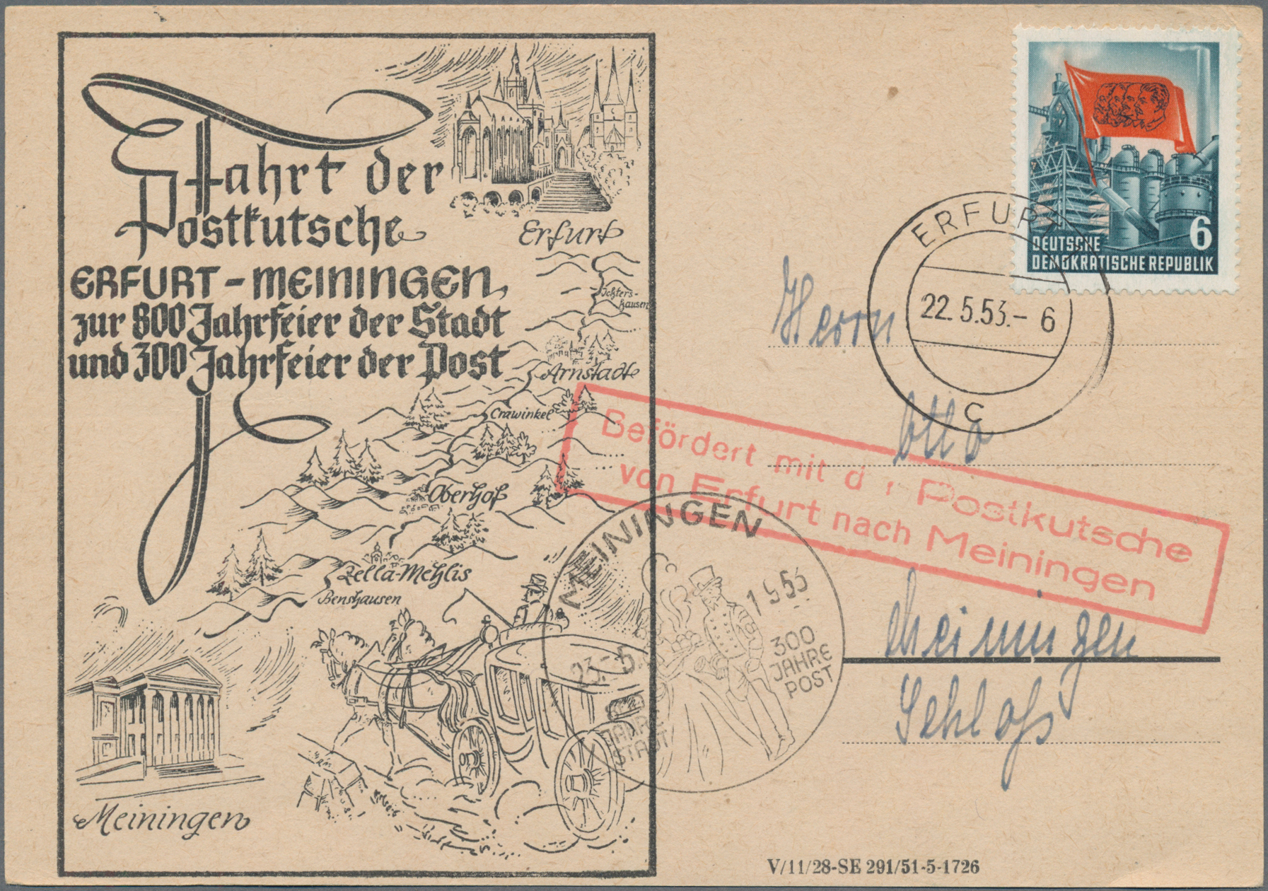 1888/1921, Partie von 18 Belegen, meist mit thematikbezogenen Maschinen-SST Eisenach-Wartburg und Erfurt entwertet, auch zwei gebrauchte Privatganzsachen