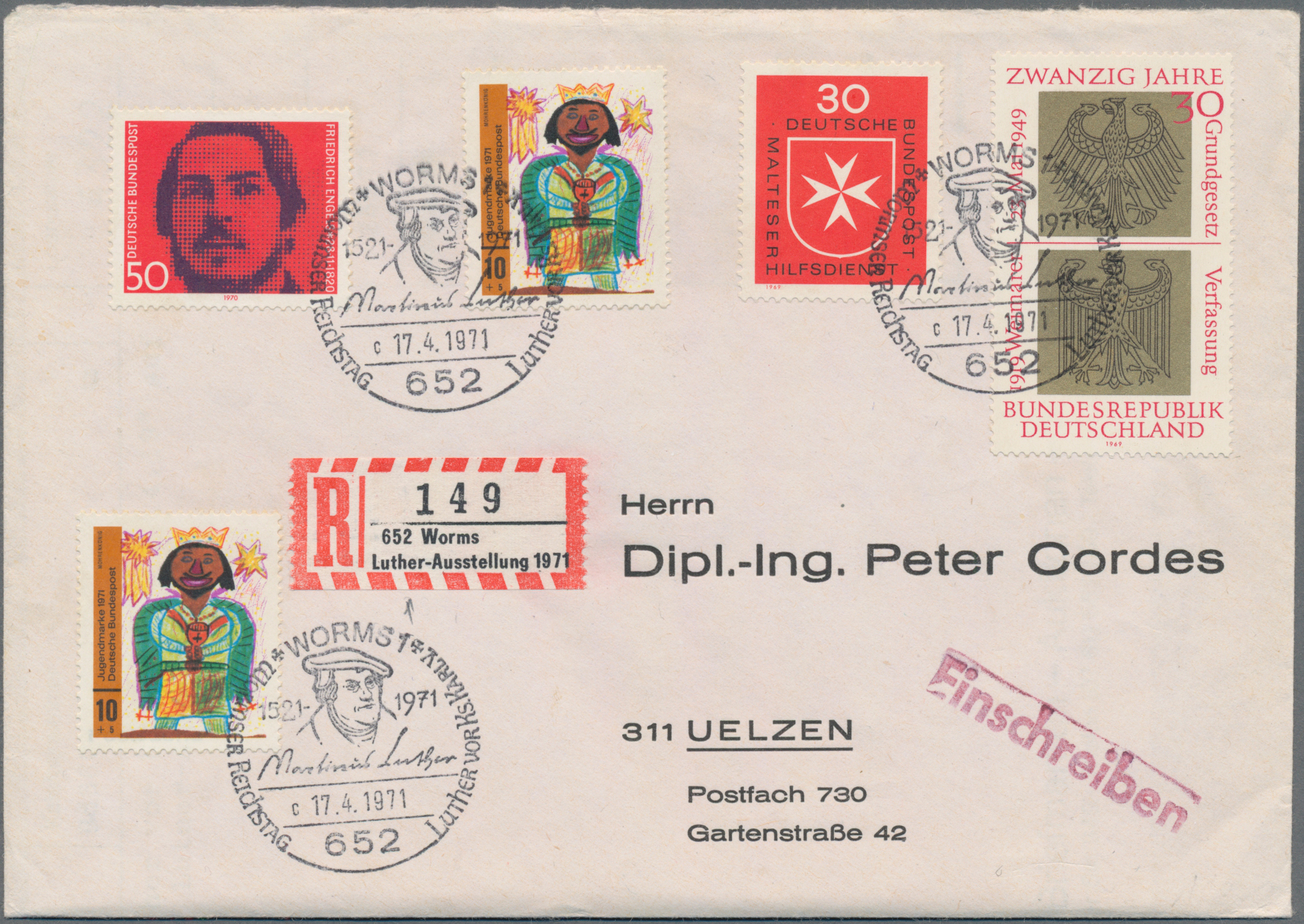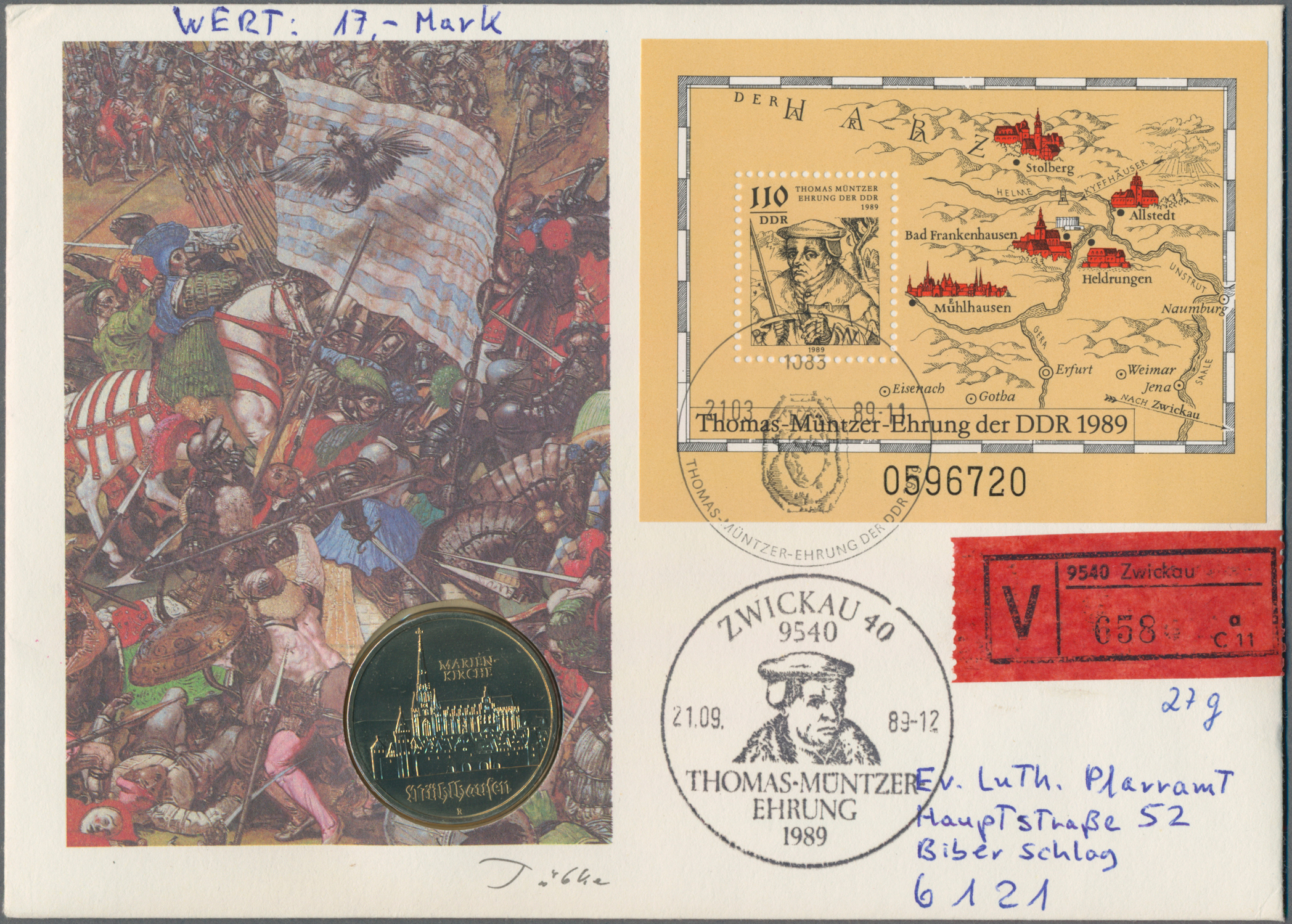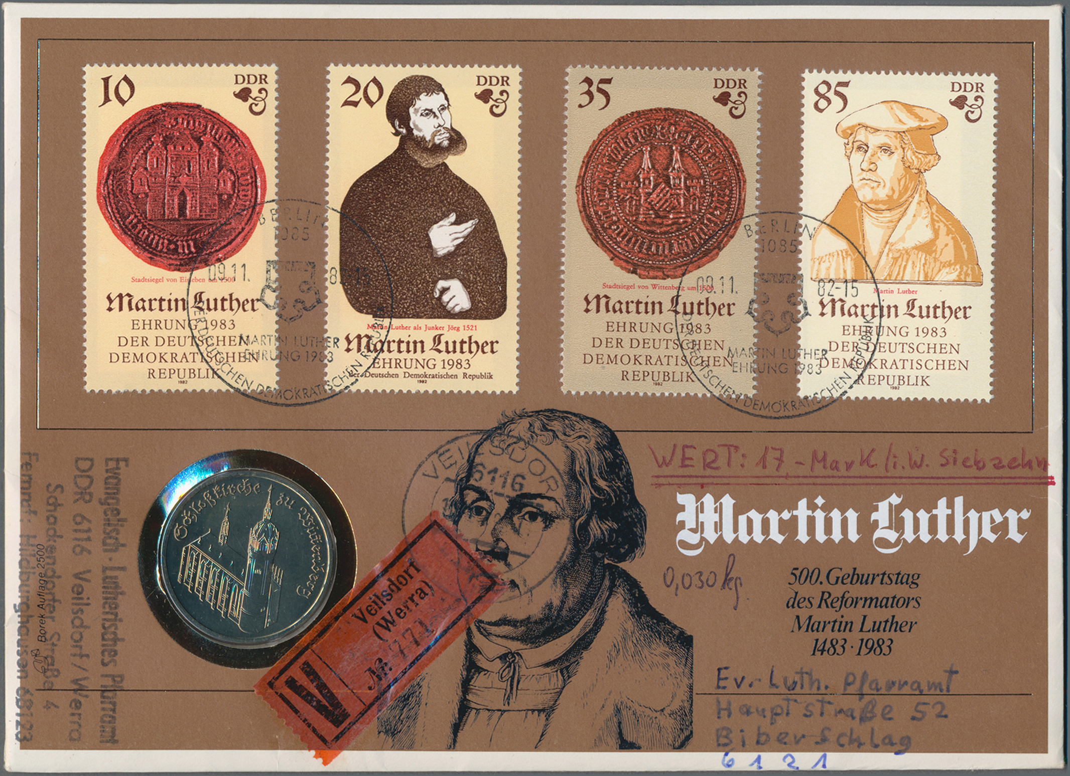Werbe-)Stempel, Ganzsachen, bessere Ansichtskarten, Numisbriefen, usw. Die Sammlung ist sehr breit angelegt und vielseitig strukturiert und enthält auch Material zu verwandten Thematiken wie Luthers Zeitgenossen, den Orten seines Wirkens und