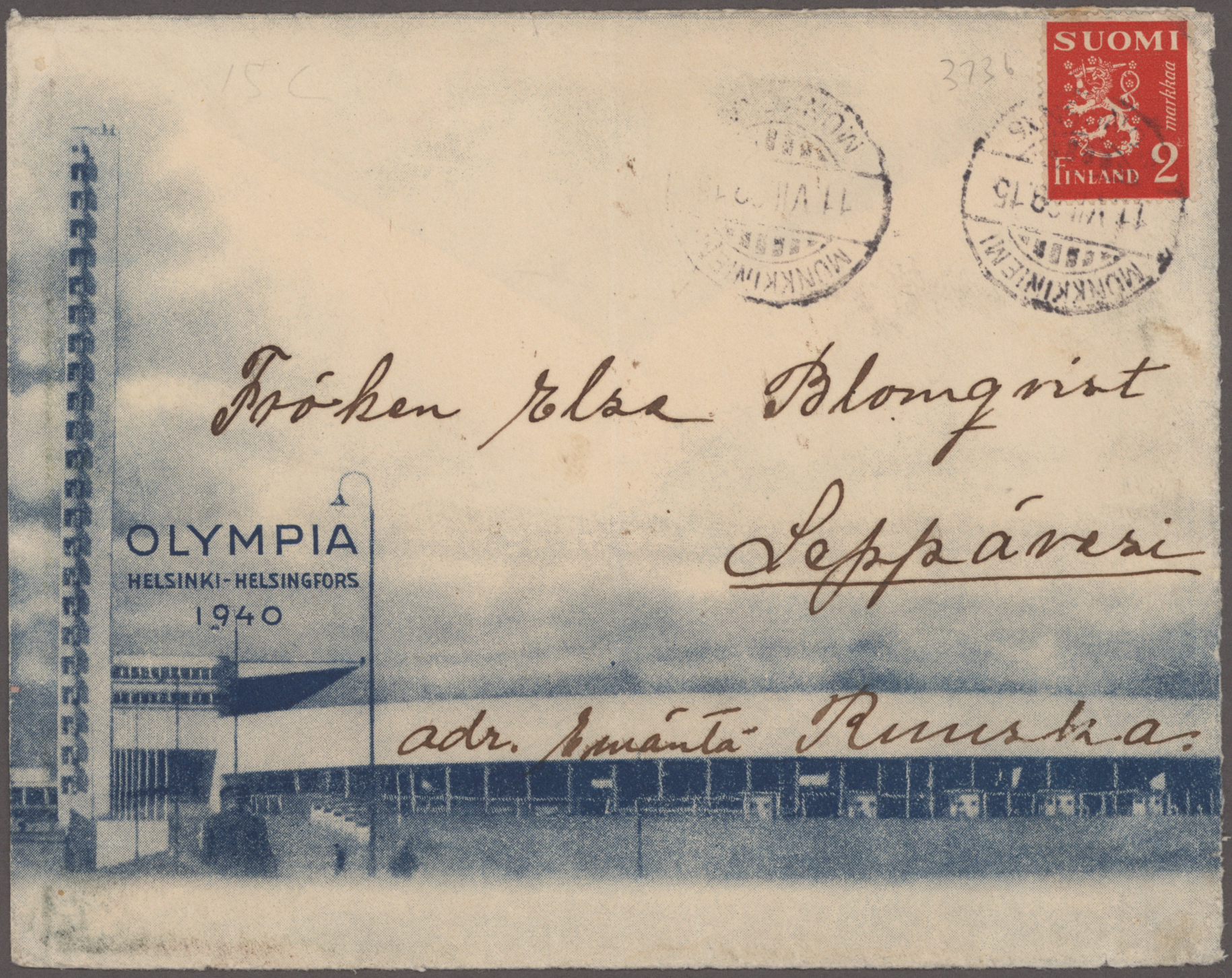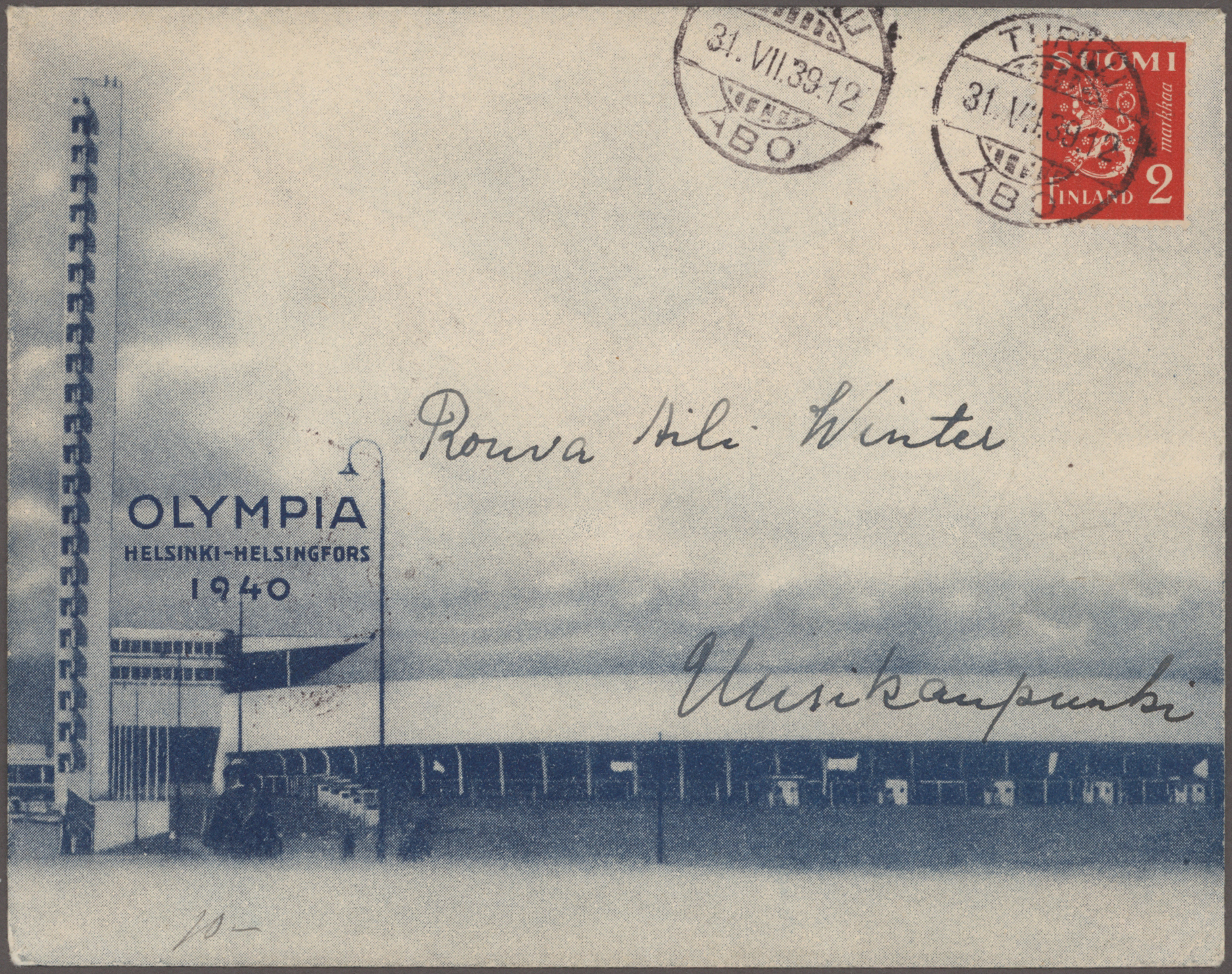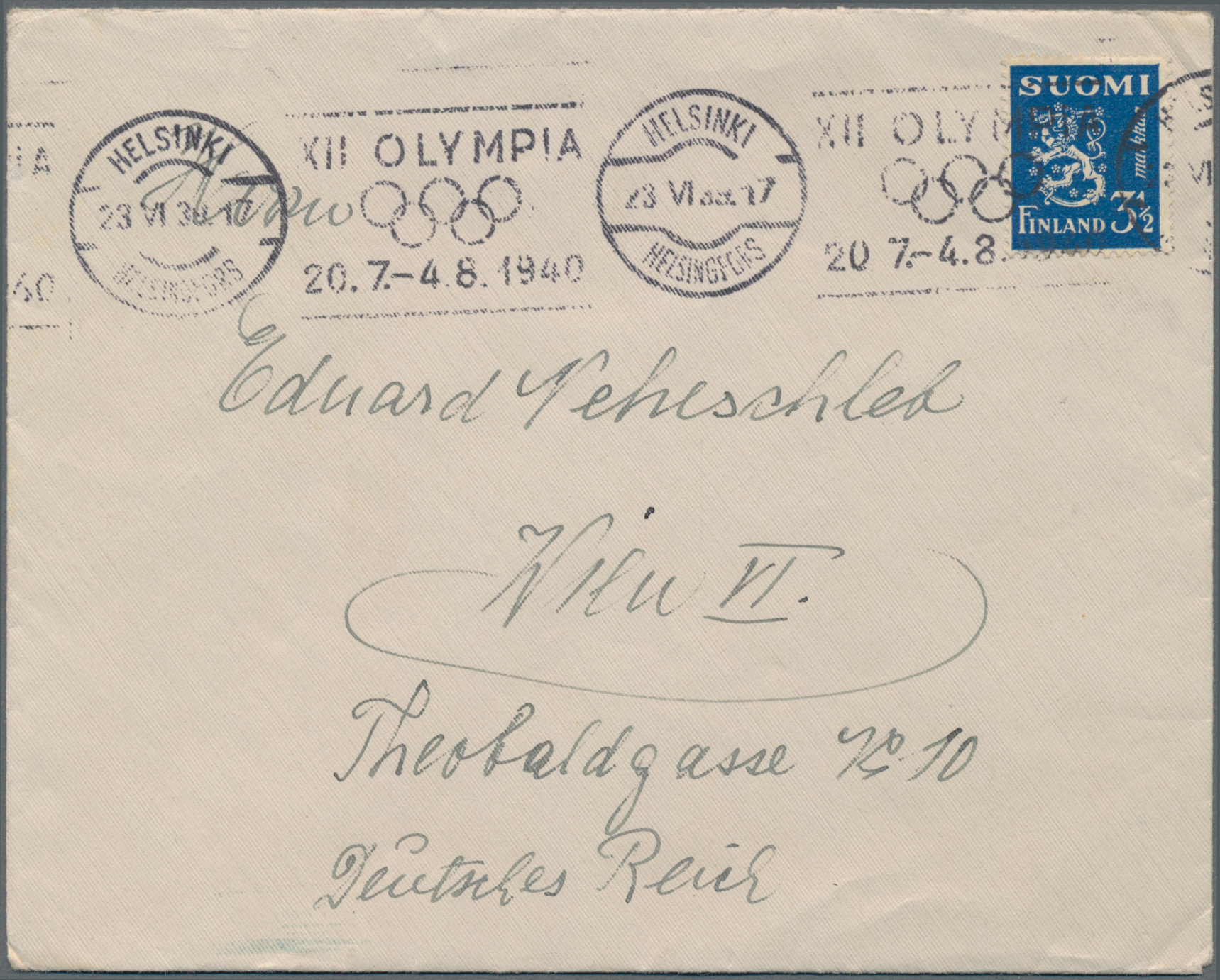 1940, Helsinki Games, planned but not conducted, lot of seven commercial covers/cards, incl. three blue advertisement envelopes (two domestic and one