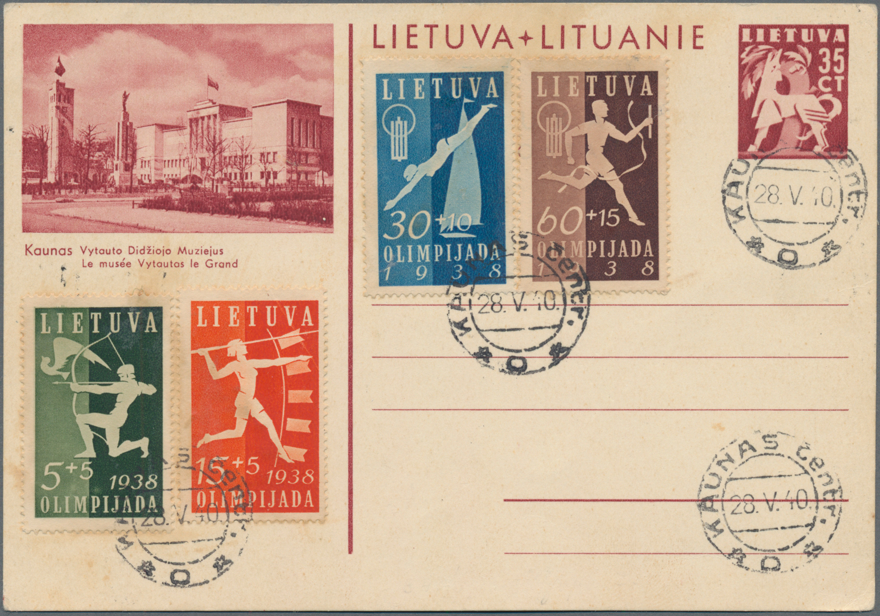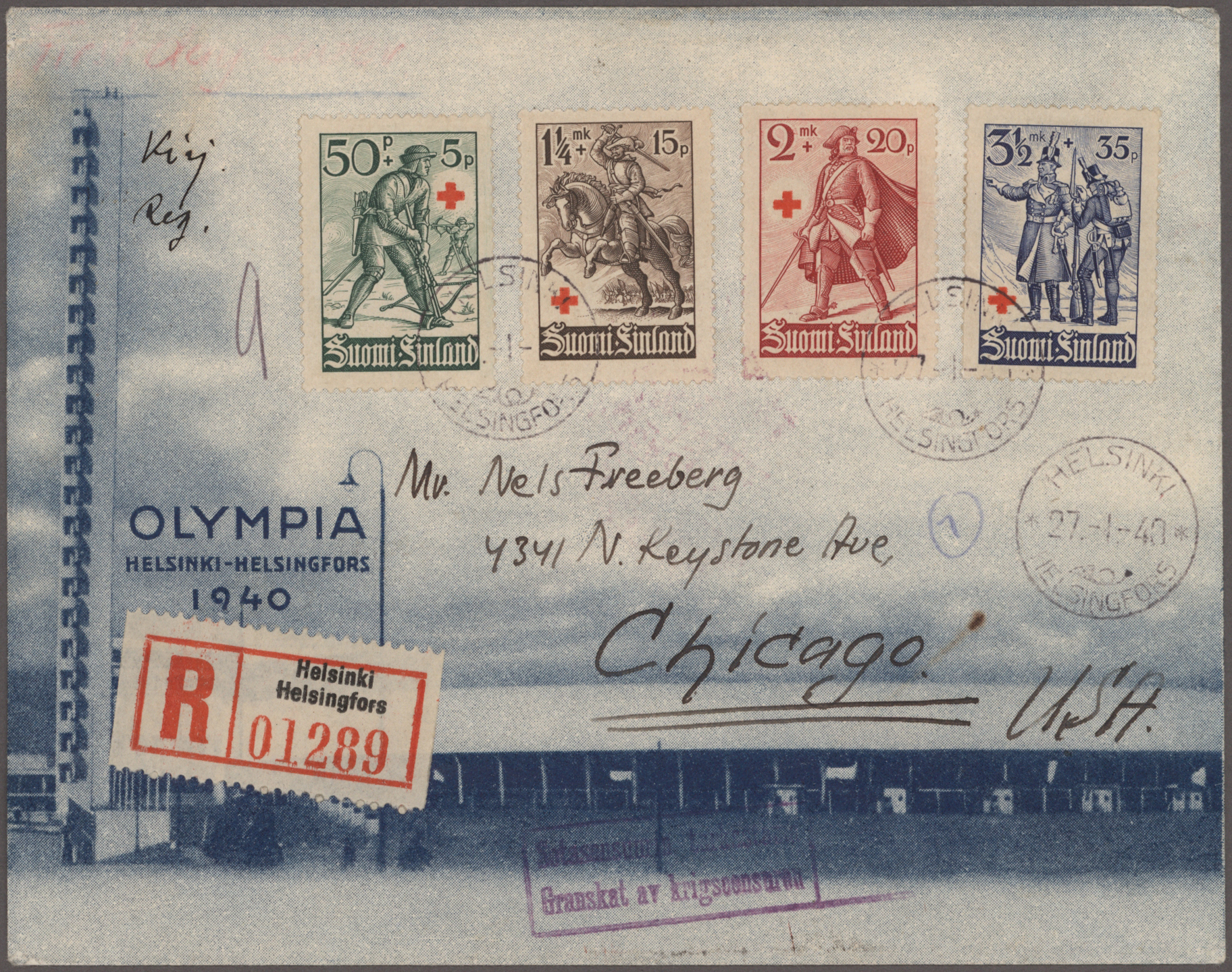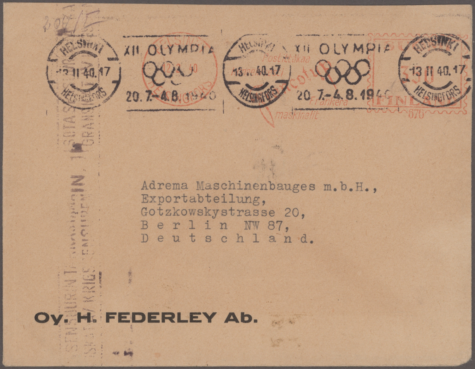 1940, Helsinki Games, planned but not conducted, lot of seven commercial covers/cards, incl. three blue advertisement envelopes (two domestic and one