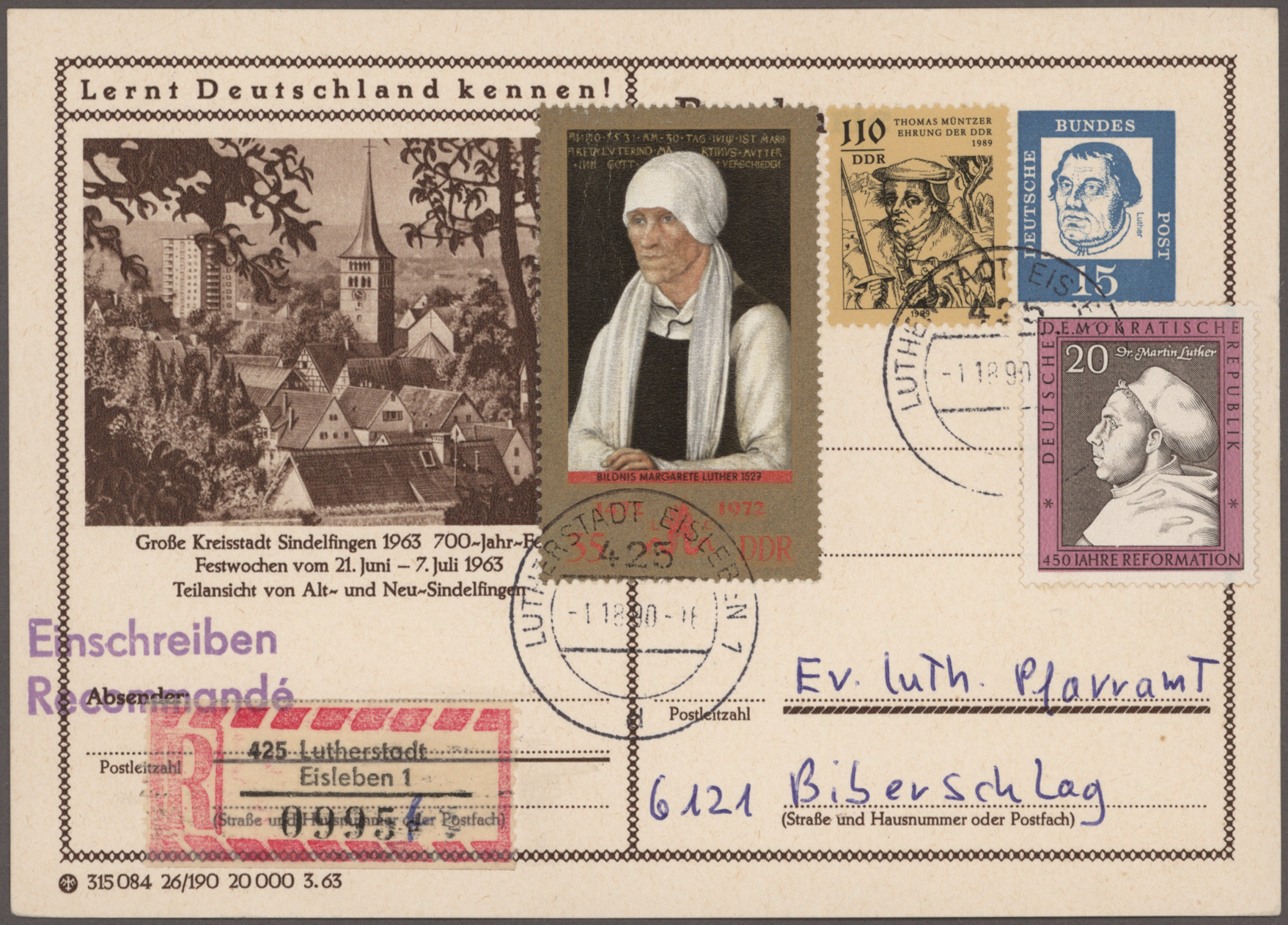1883/1924, Lot von fünf Ansichtskarten mit seltener früher Karte "400jähriges Jubelfest 1483-1883. / zwei Medaillons Luther und Bora" gebraucht ab