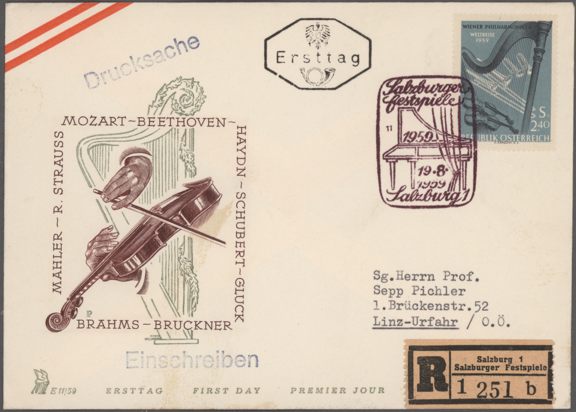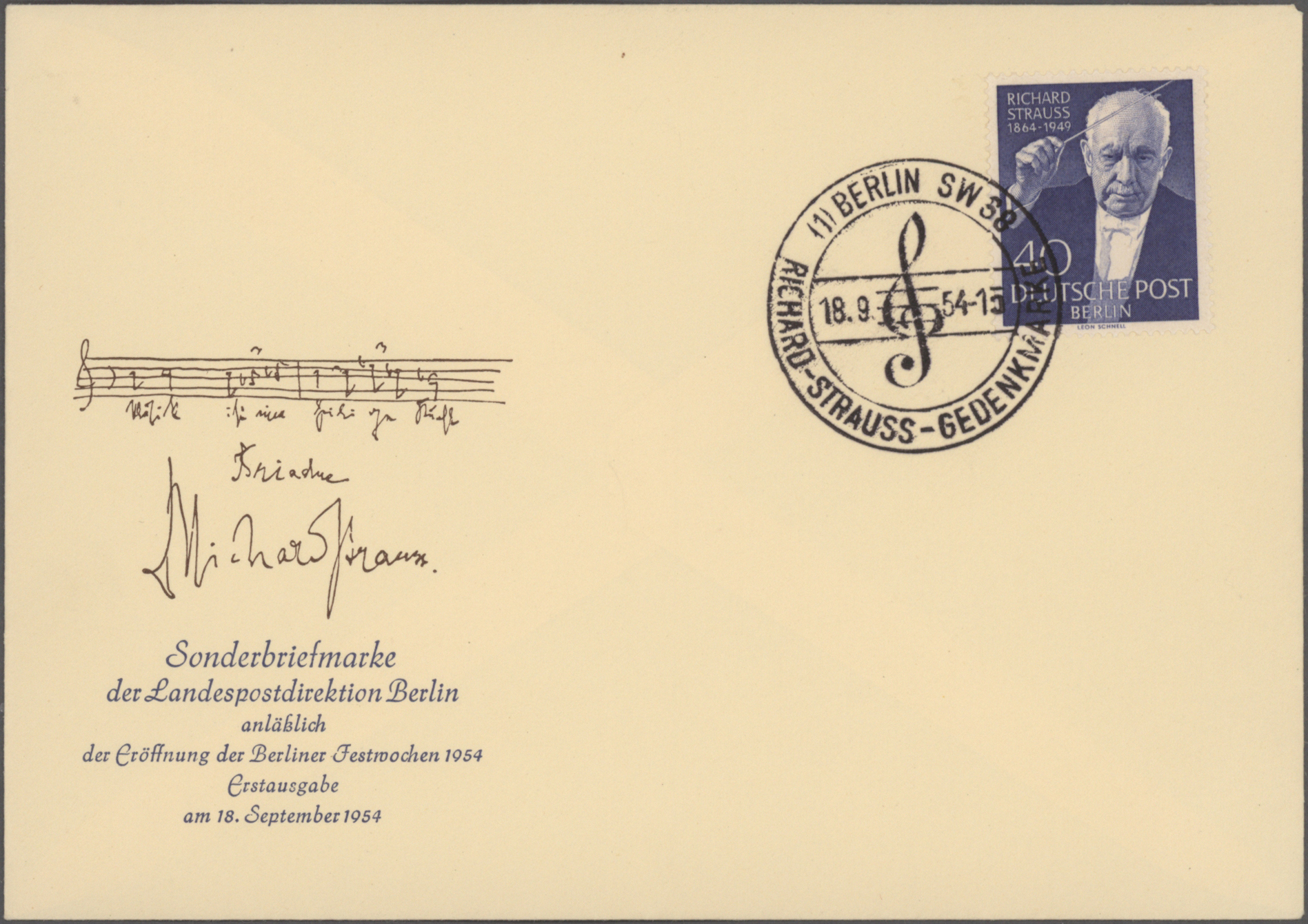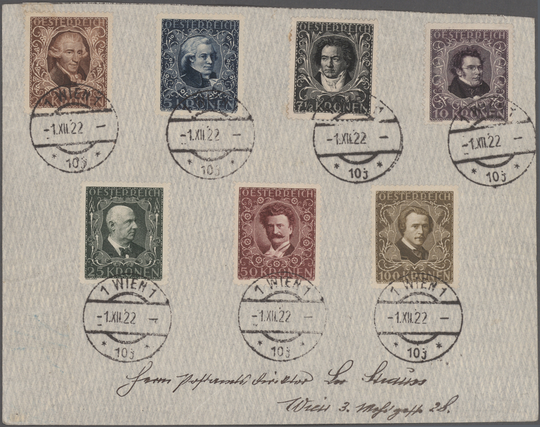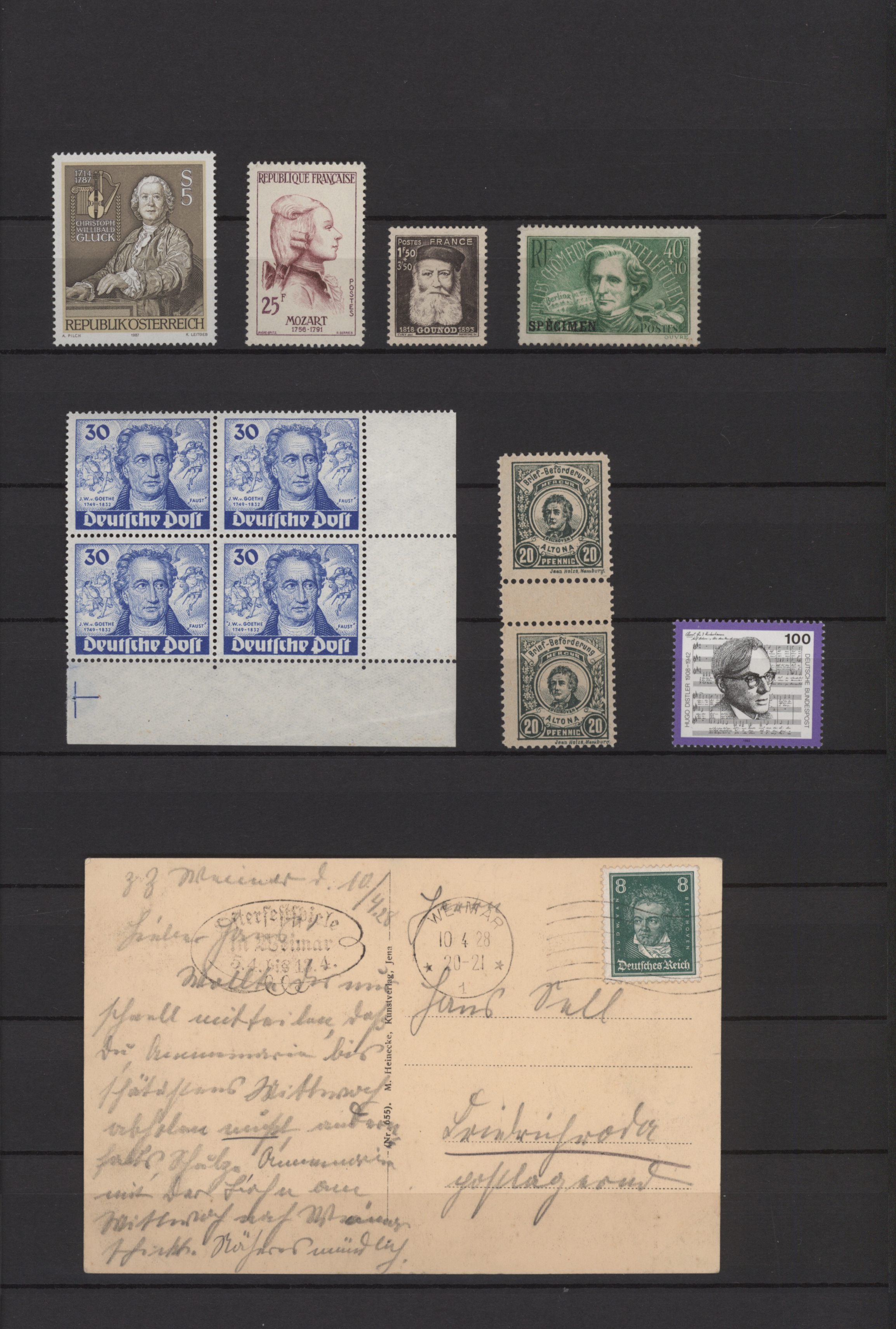 Gustav Mahler, Anton Bruckner, Joseph Haydn, Dirigenten Wilhelm Furtwängler und Herbert von Karajan, usw., mit guter Vielfalt an entsprechenden Frankaturen, Sonder- und Werbestempeln, (Privat-)Ganzsachen, besseren Belegen wie Ungarn Block 1 und