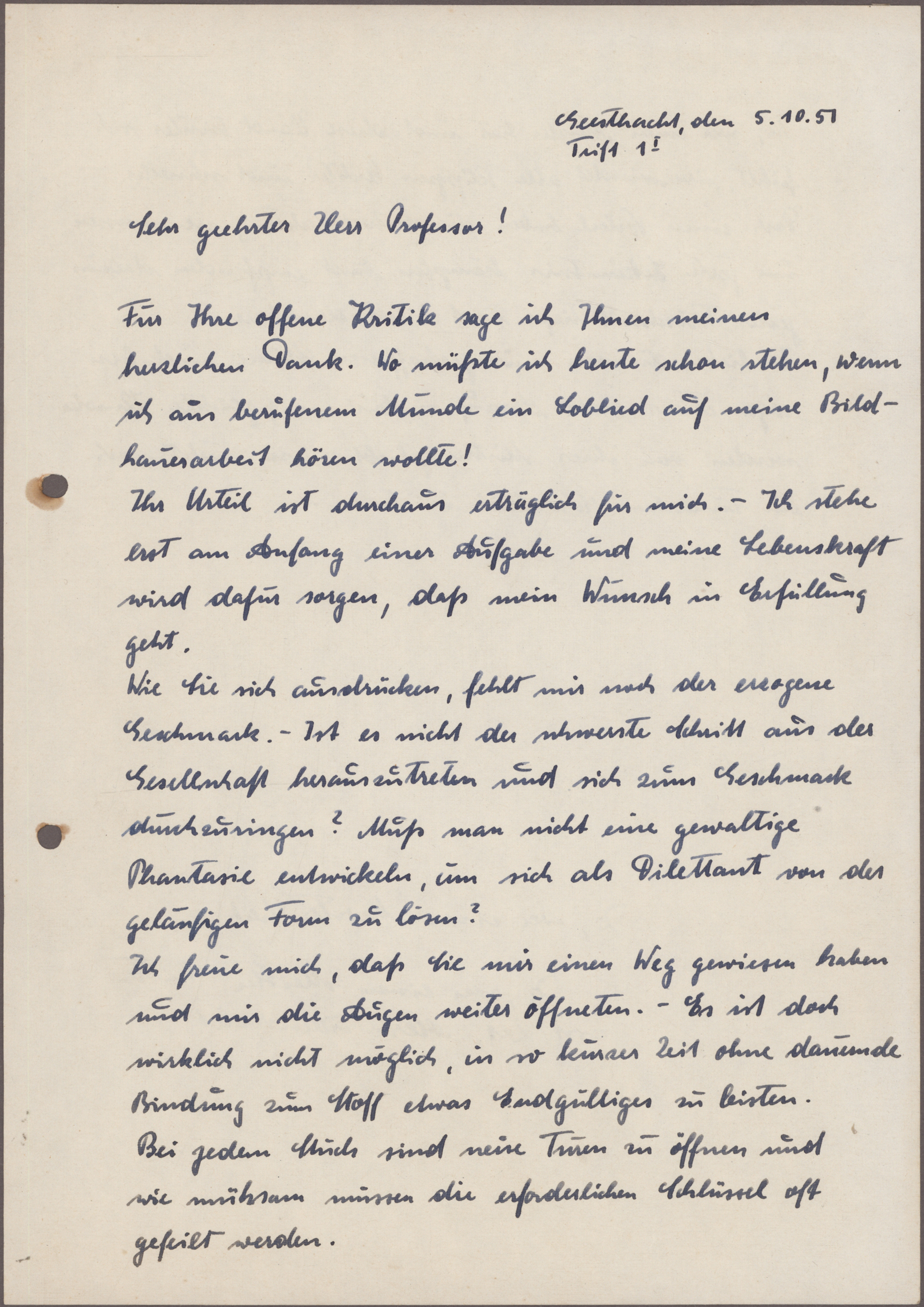 1951 Bilderhauer Gerhard Marcks und Ernst Dircks-Rix: Brief von Gerhard Marcks an Ernst Dircks-Rix in Geesthacht vom 2.X.51 betreffs dessen künstlerischen Schaffens,