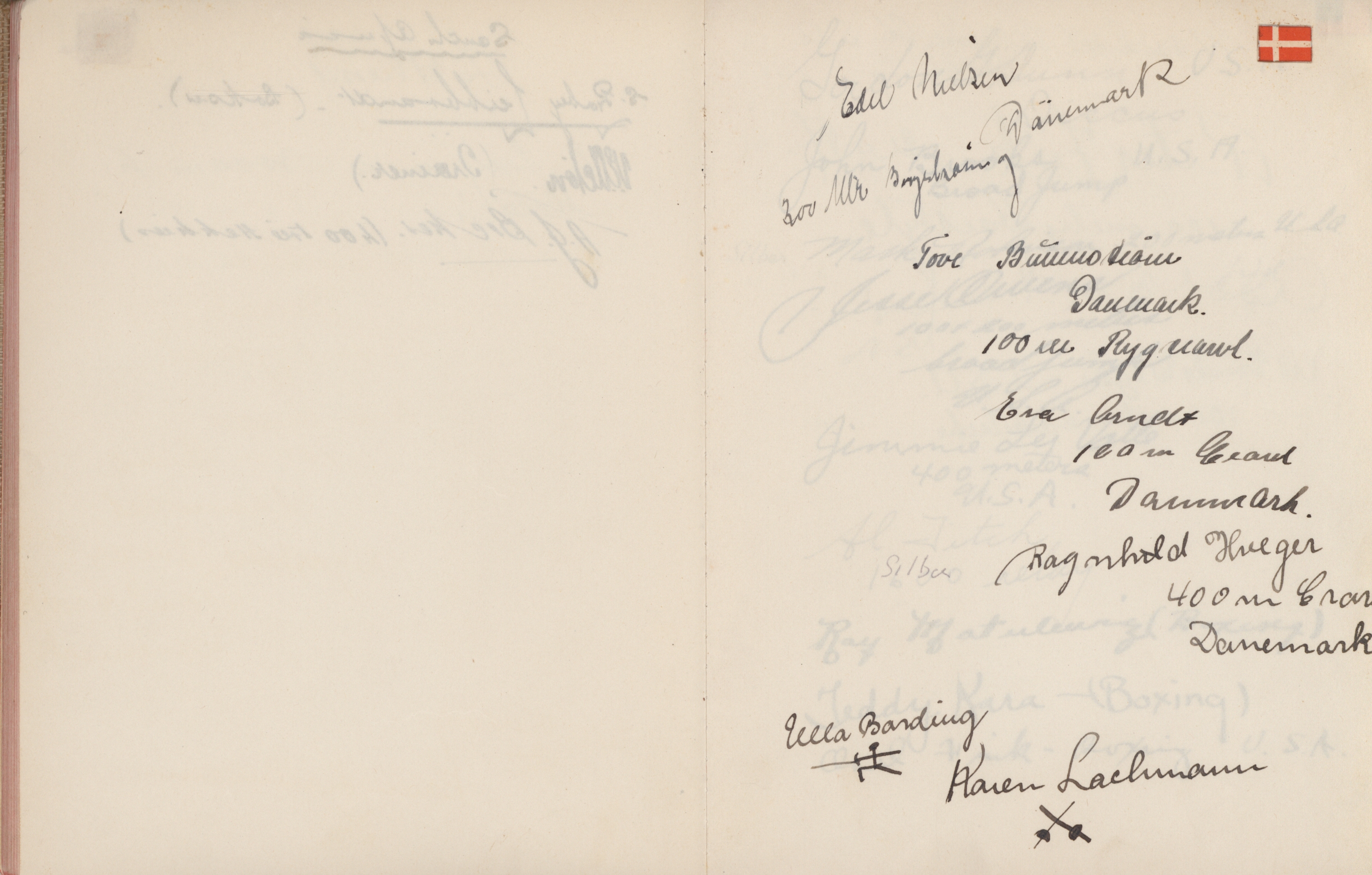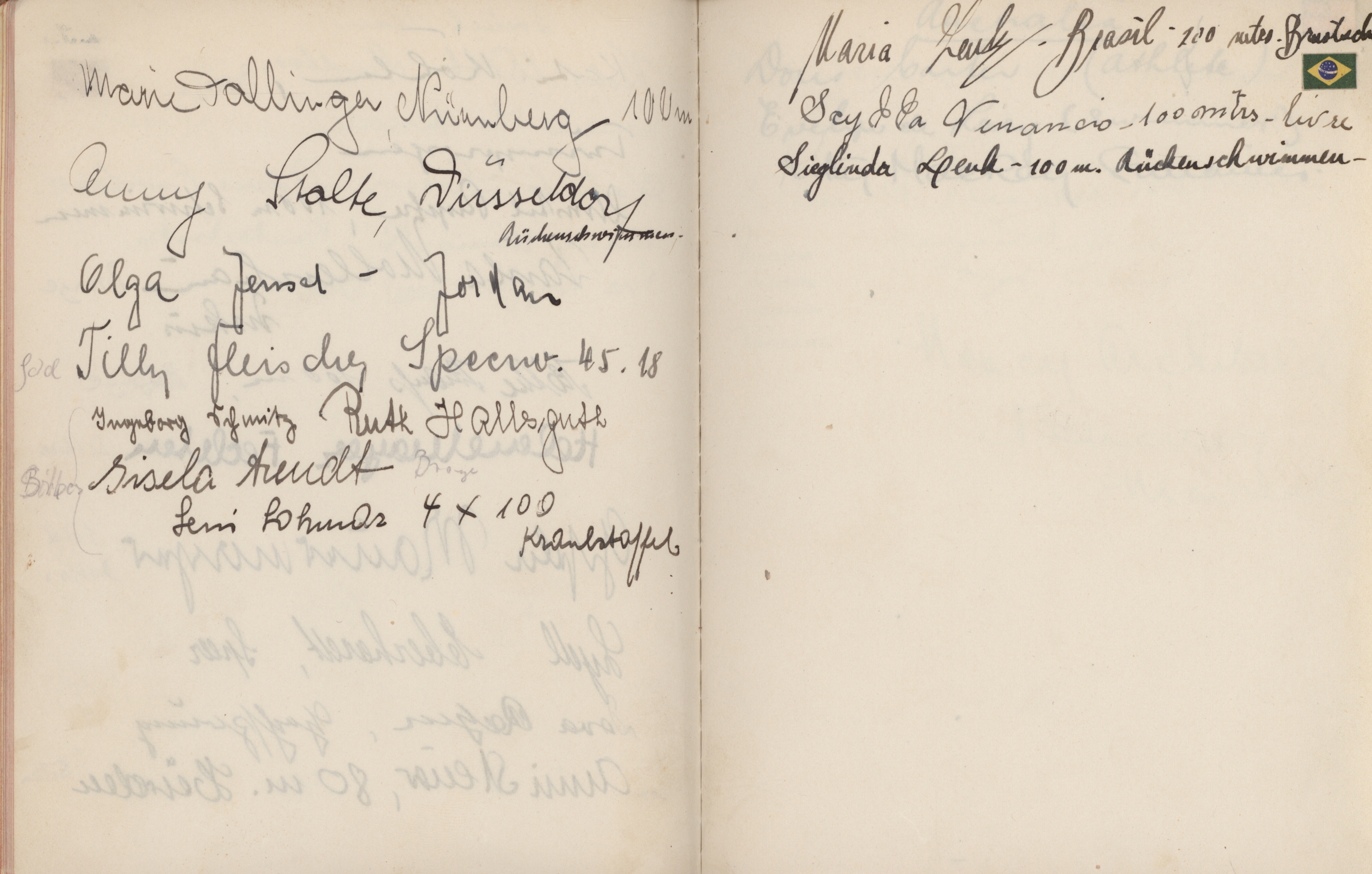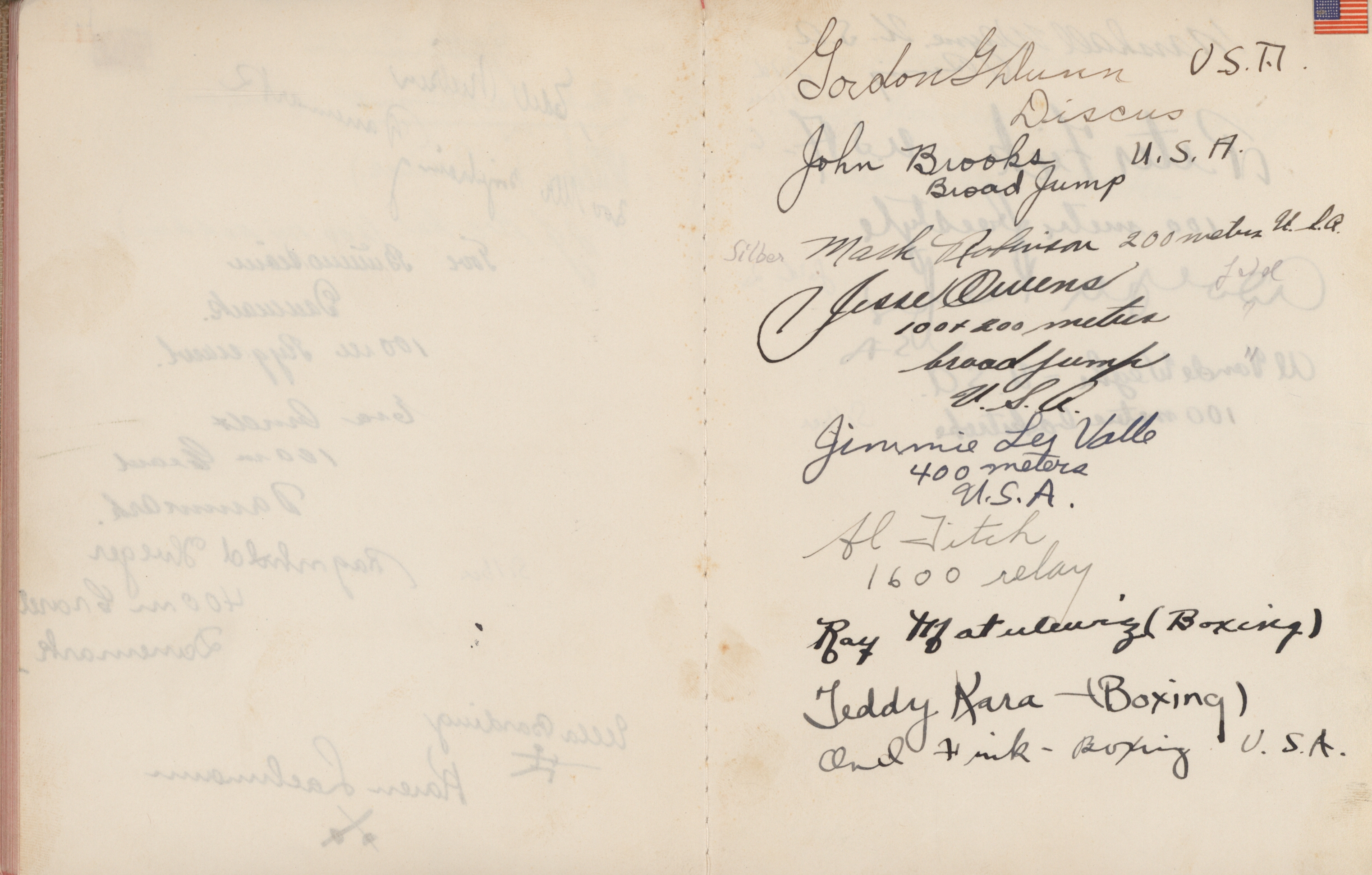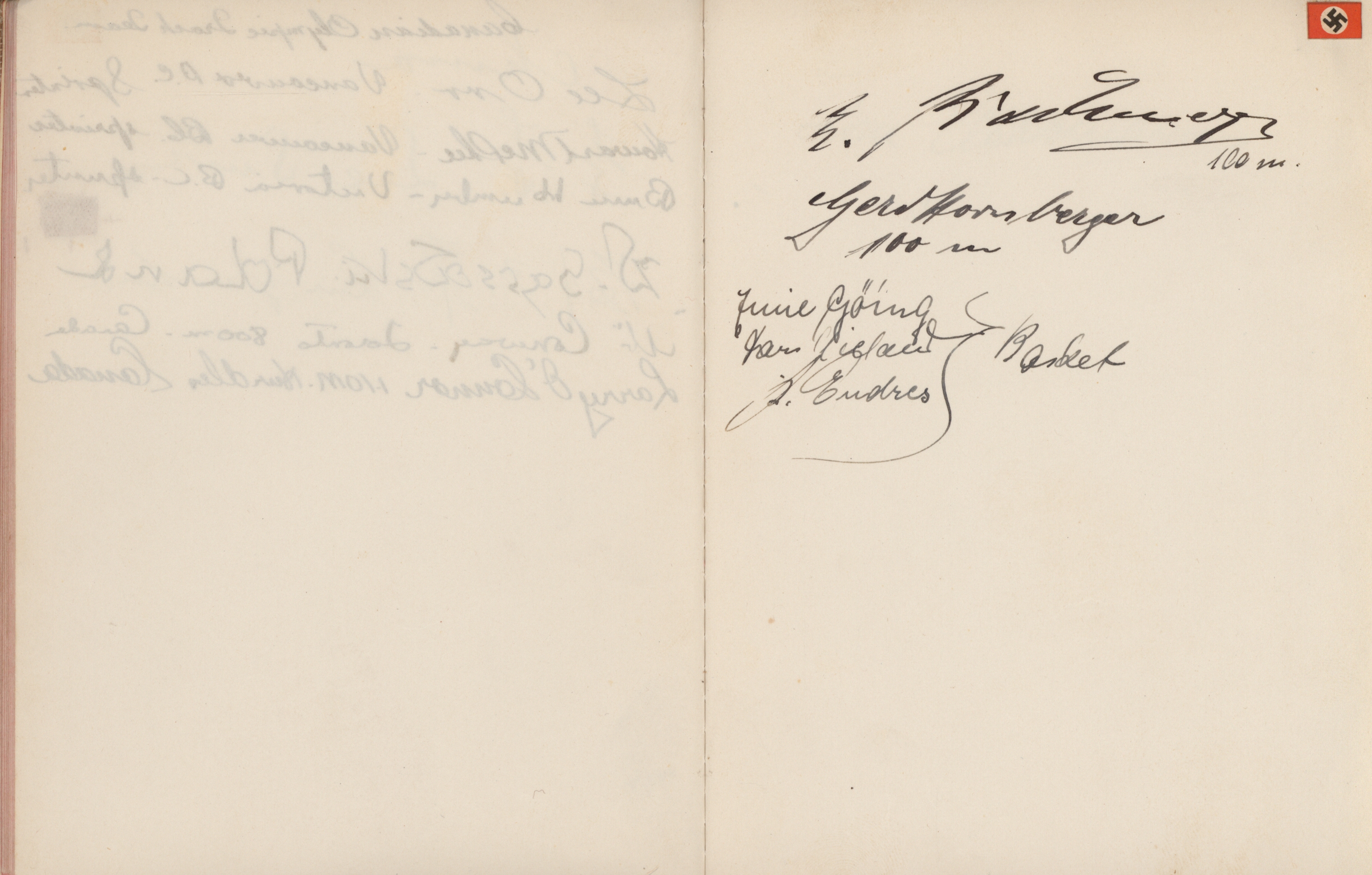 signatures of the athletes and some Nazi celebrities. Among them are the Olympia champions: Jesse Owens, USA (100m, 200m, long jump), Helen Stephens, USA (100m), Gisela Mauermayer, Germany (Discus), Tilly Fleischer, Germany (Javelin), Ilona Elek,