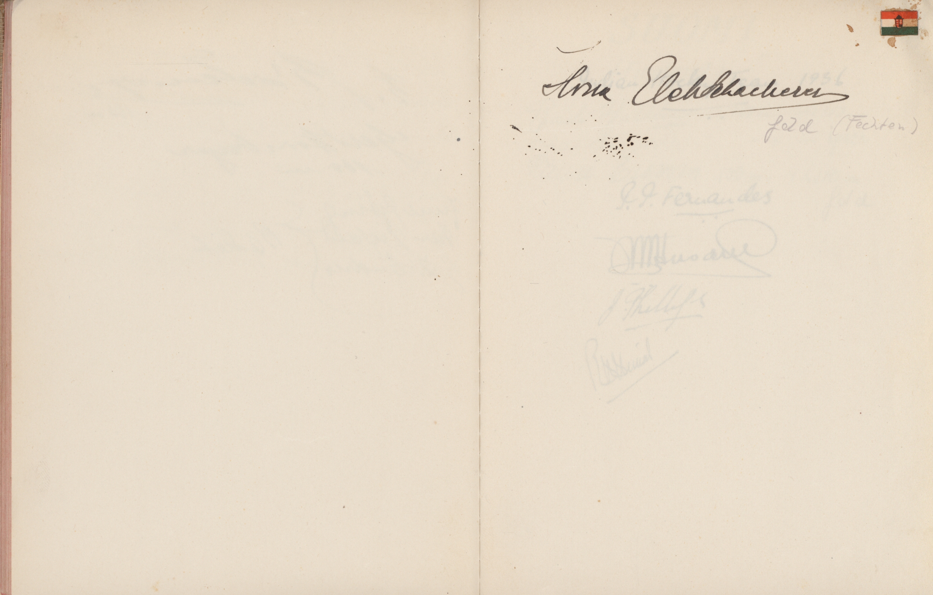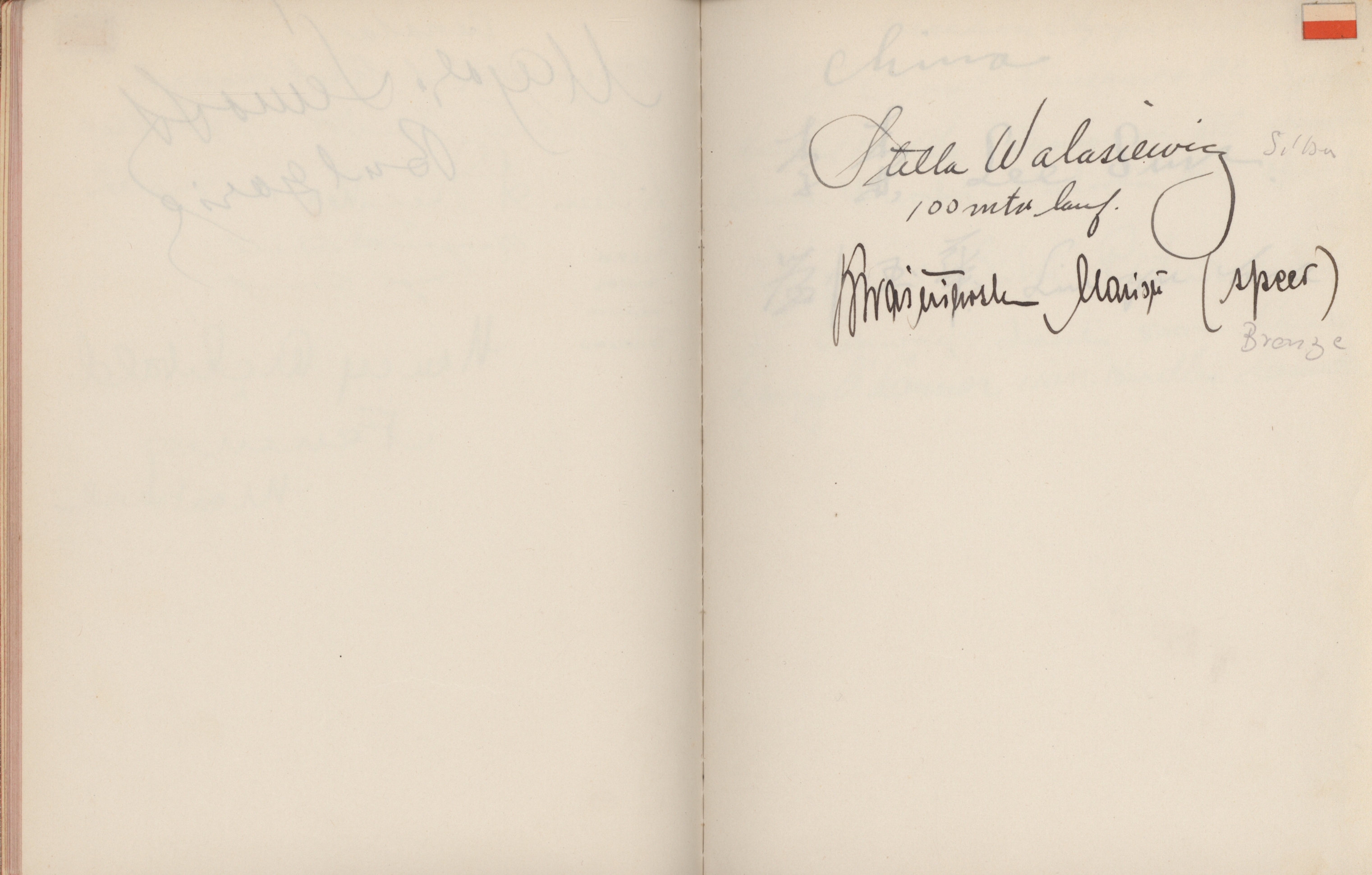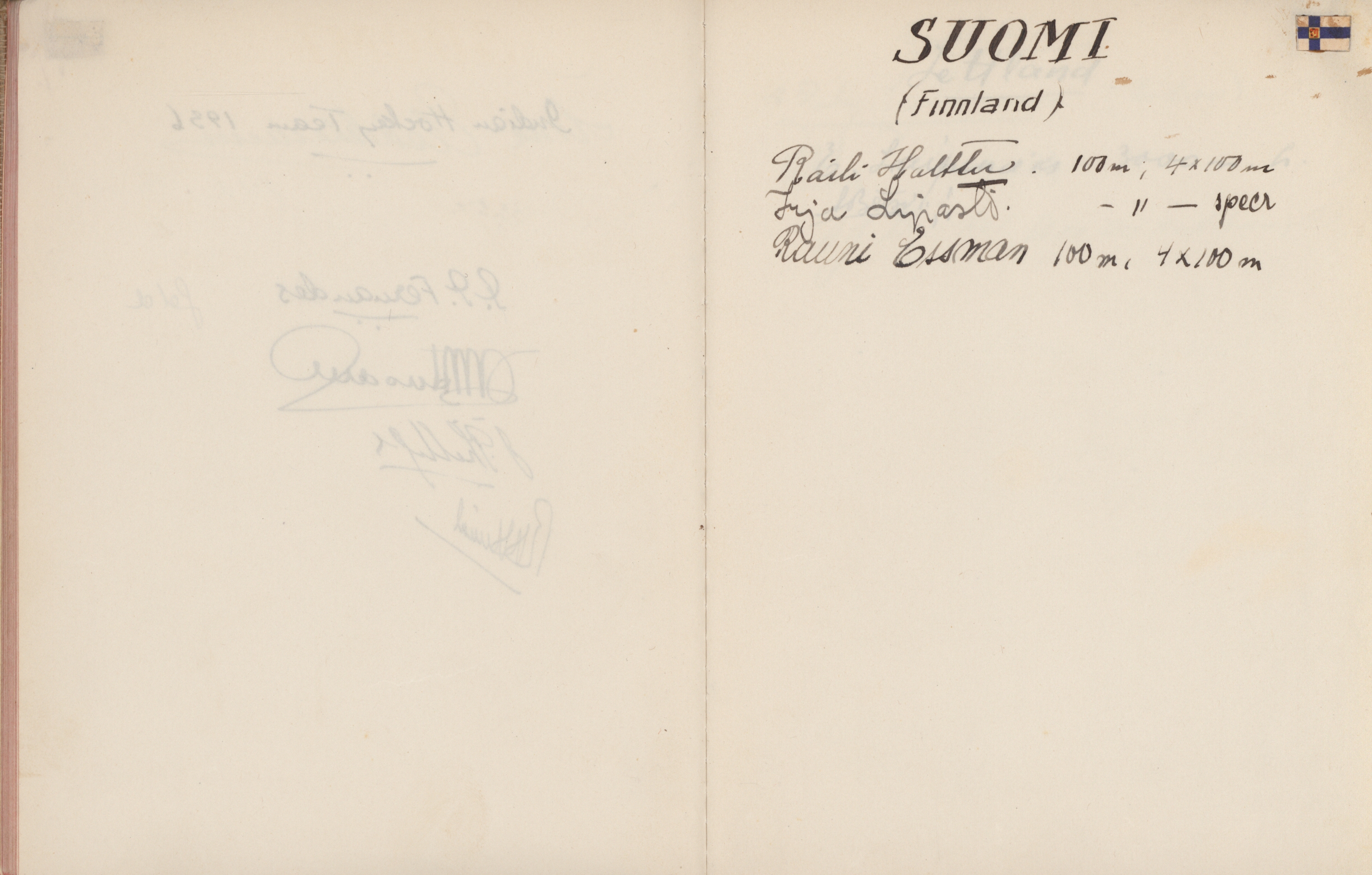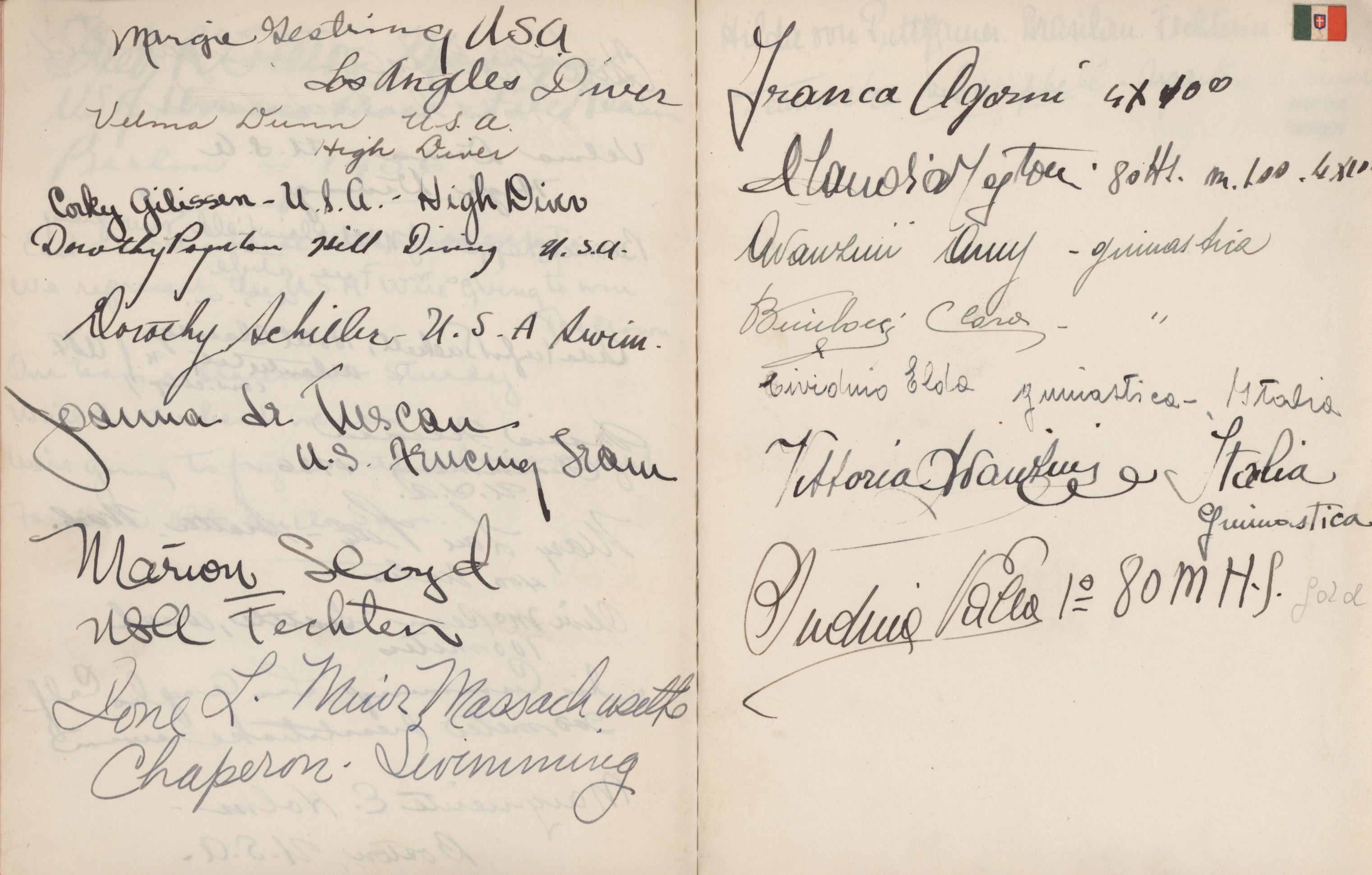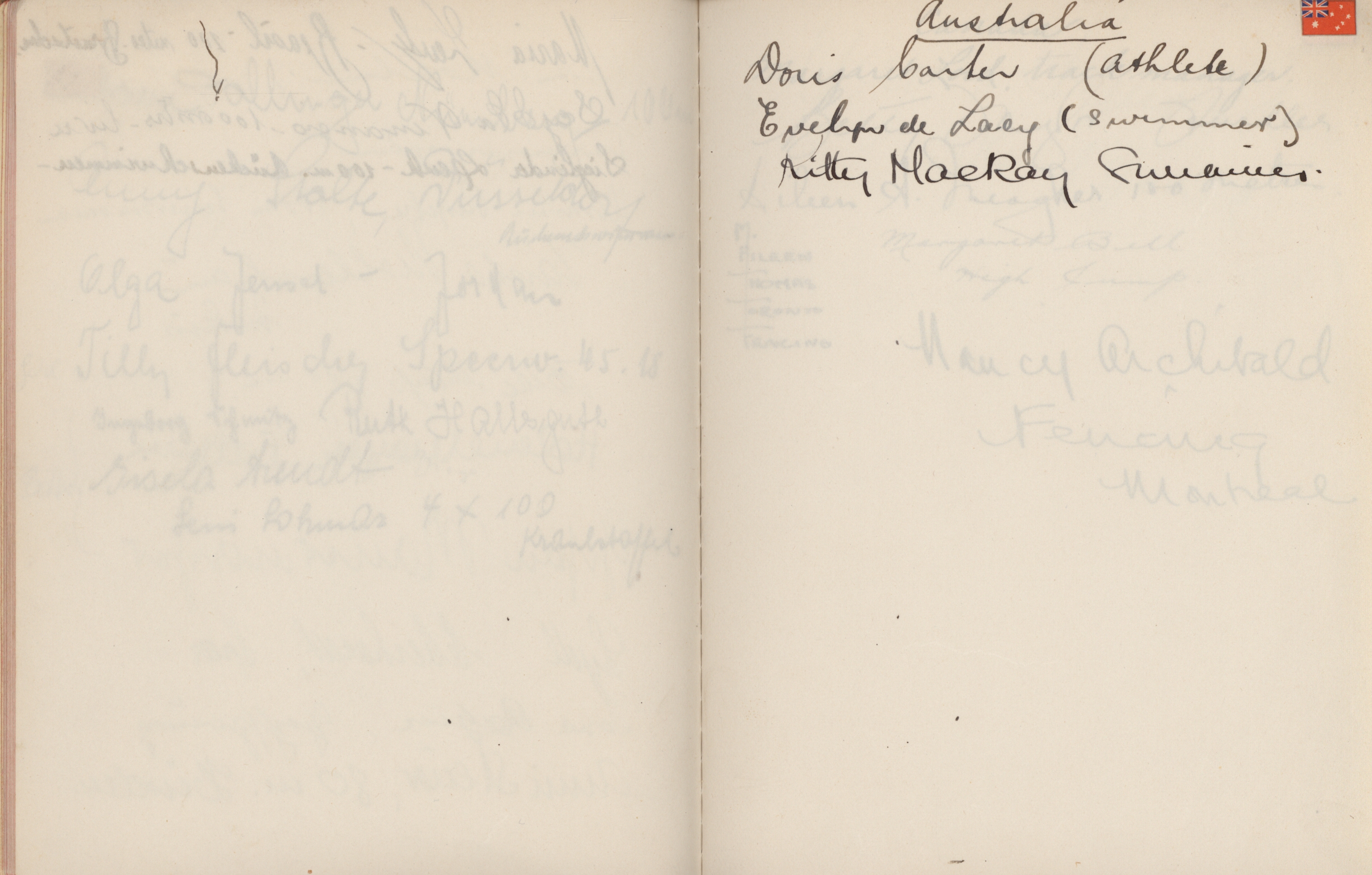 signatures of the athletes and some Nazi celebrities. Among them are the Olympia champions: Jesse Owens, USA (100m, 200m, long jump), Helen Stephens, USA (100m), Gisela Mauermayer, Germany (Discus), Tilly Fleischer, Germany (Javelin), Ilona Elek,