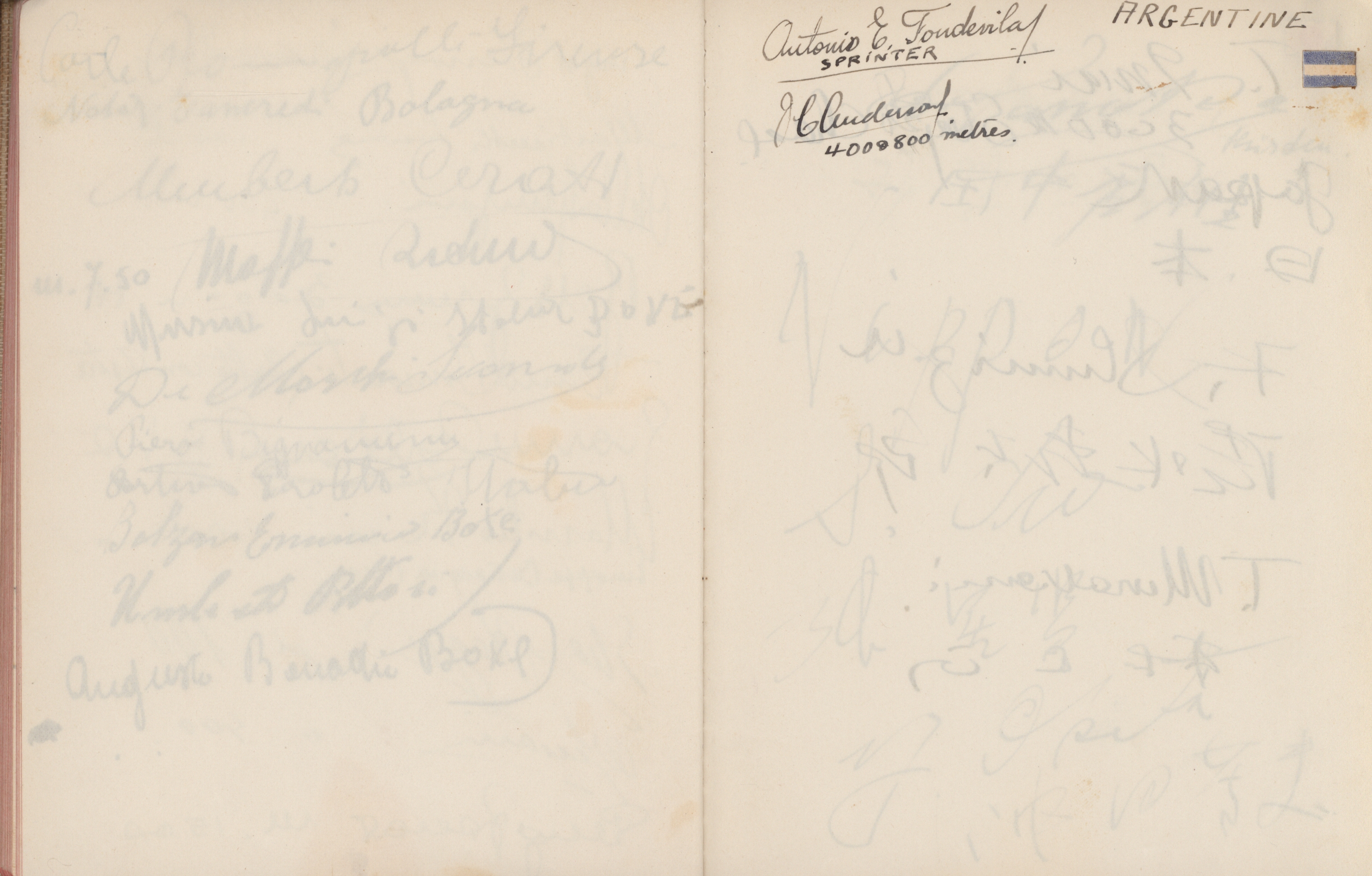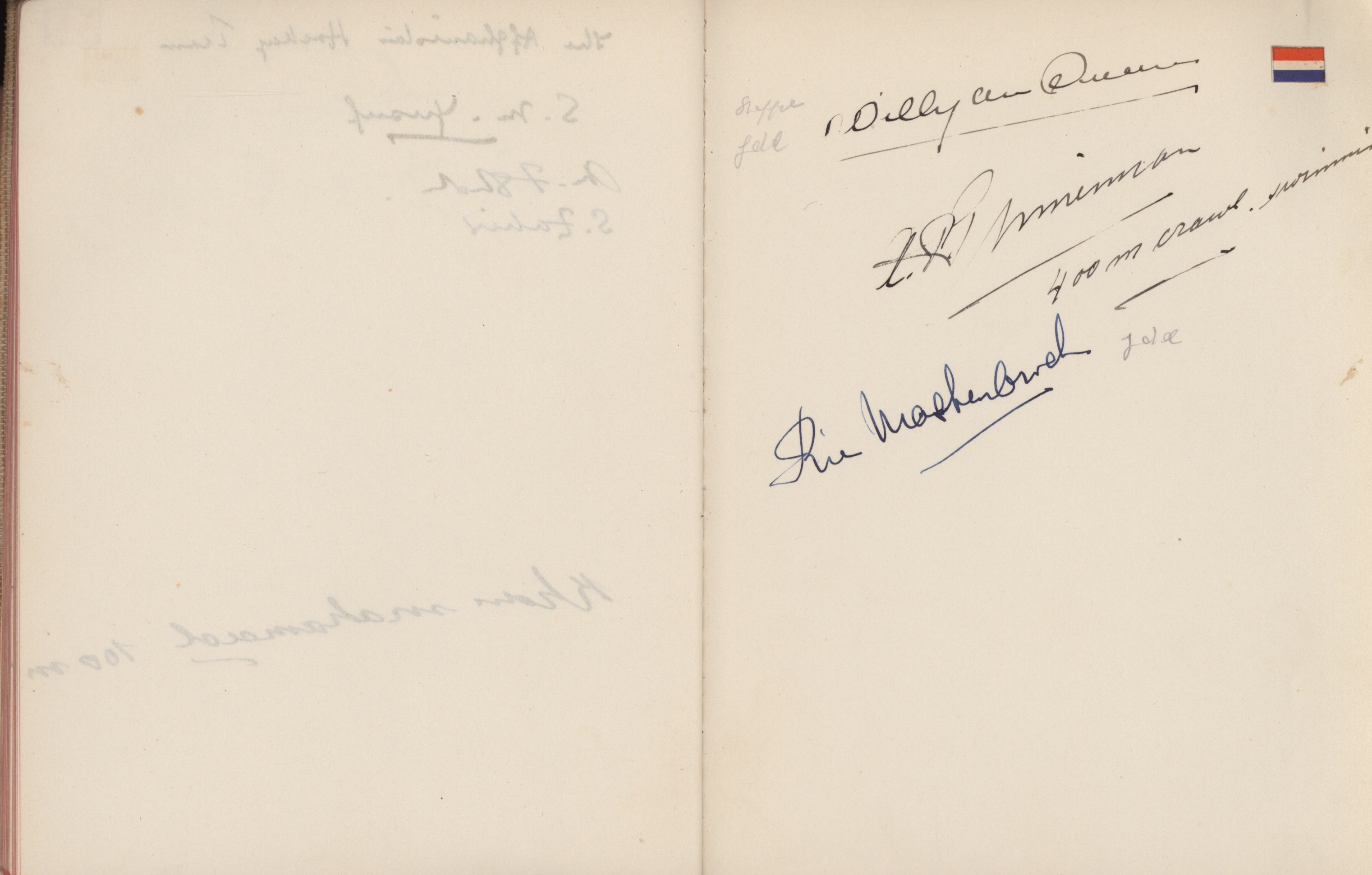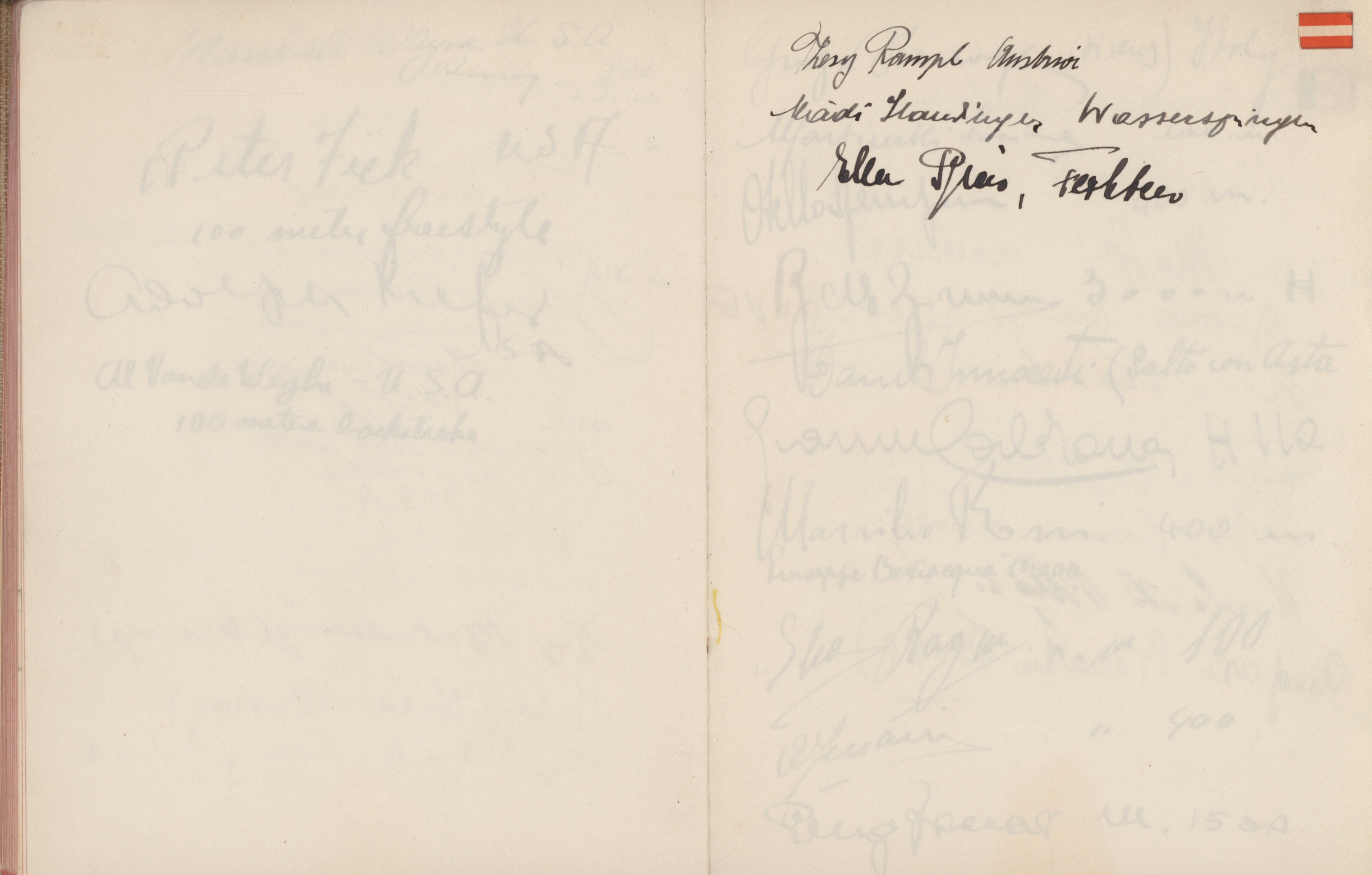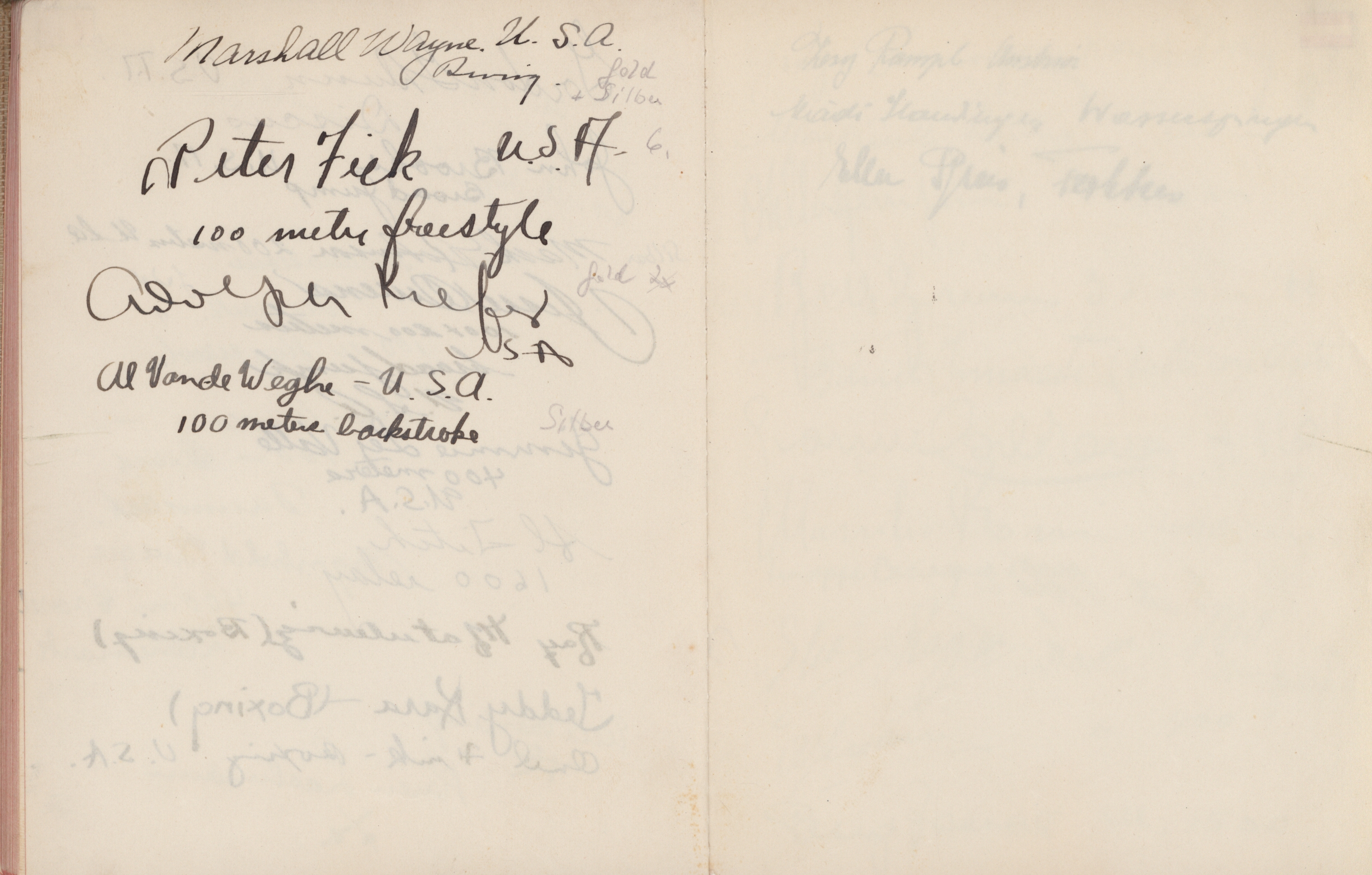 signatures of the athletes and some Nazi celebrities. Among them are the Olympia champions: Jesse Owens, USA (100m, 200m, long jump), Helen Stephens, USA (100m), Gisela Mauermayer, Germany (Discus), Tilly Fleischer, Germany (Javelin), Ilona Elek,