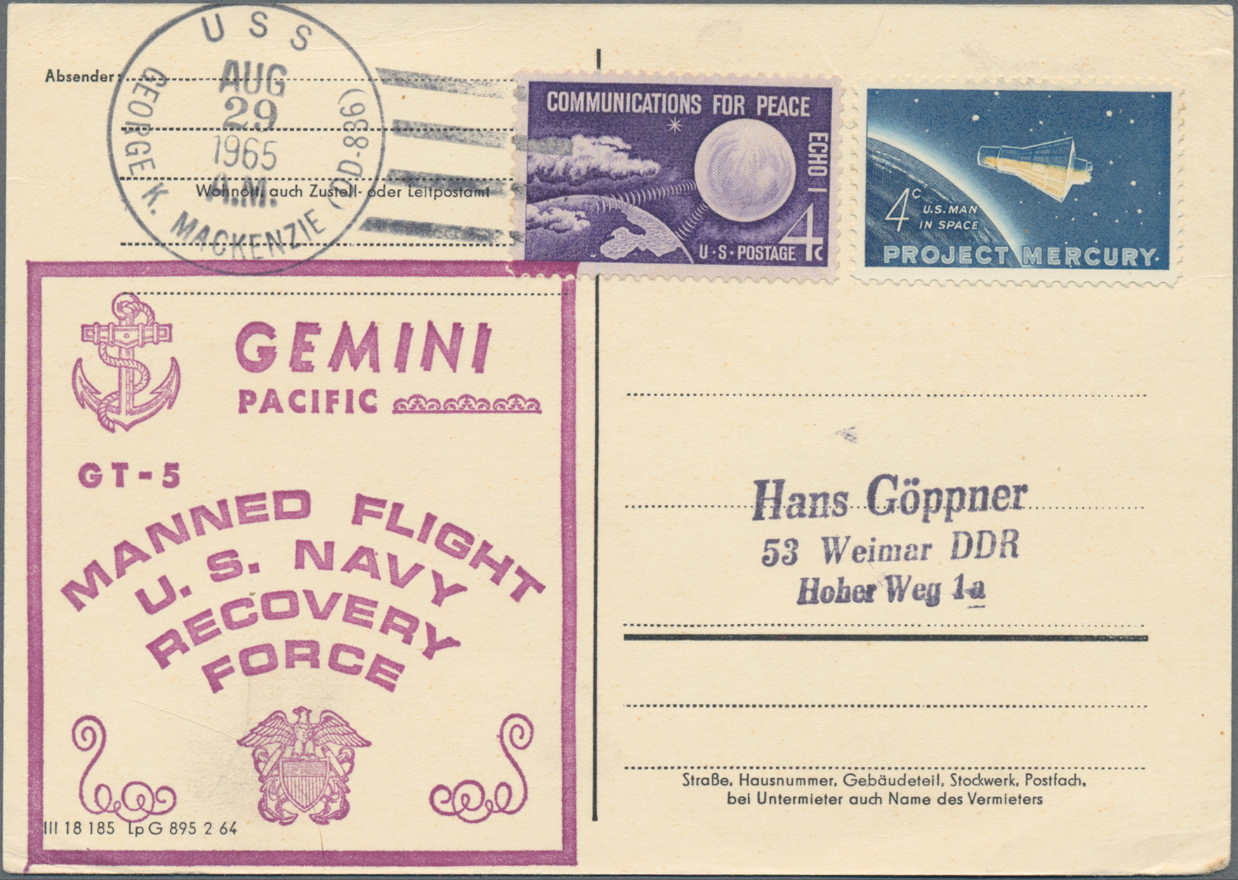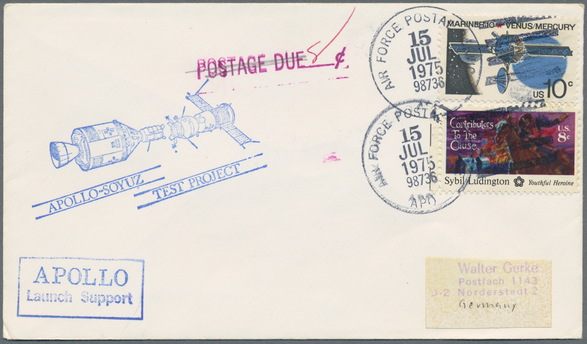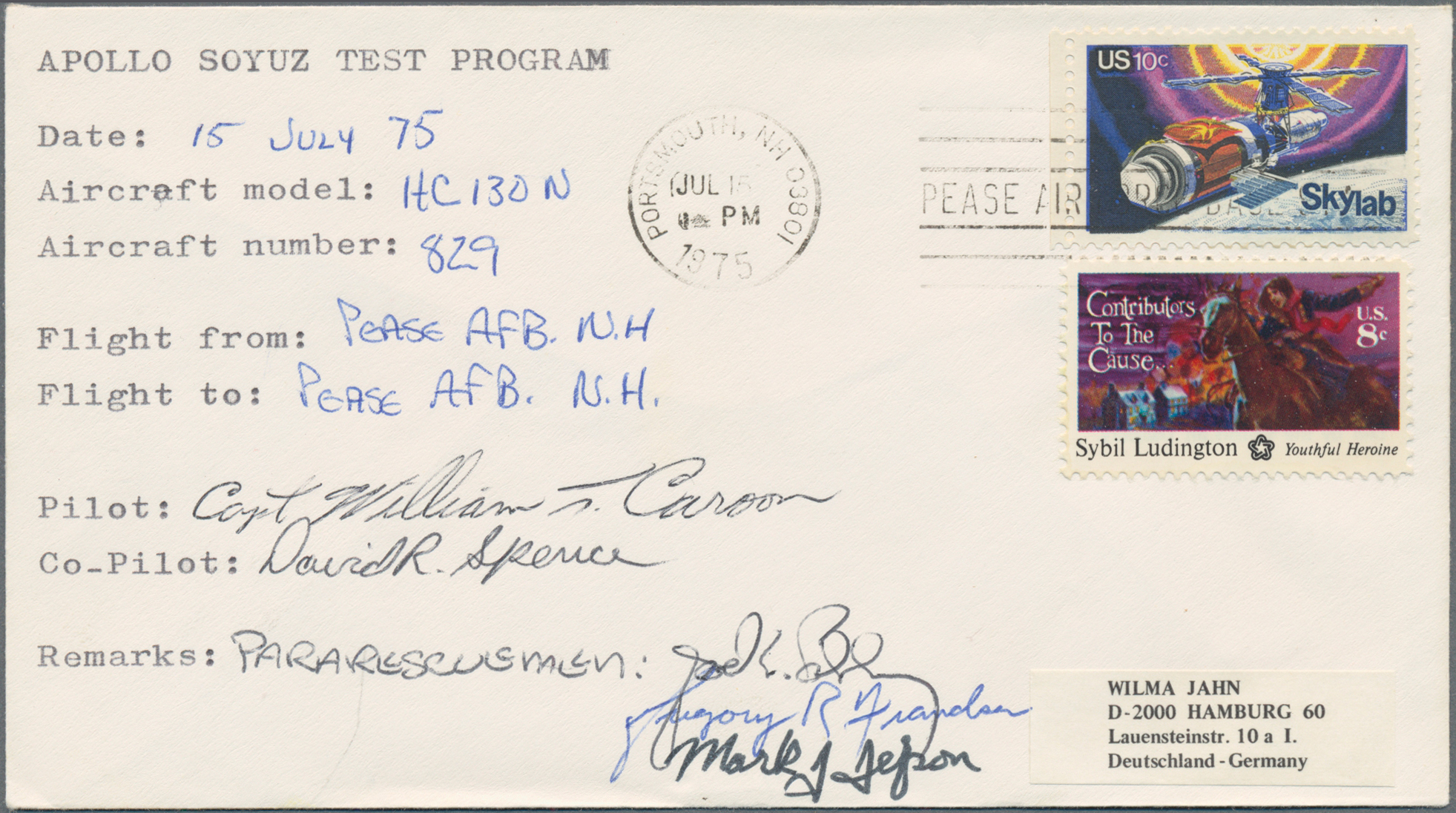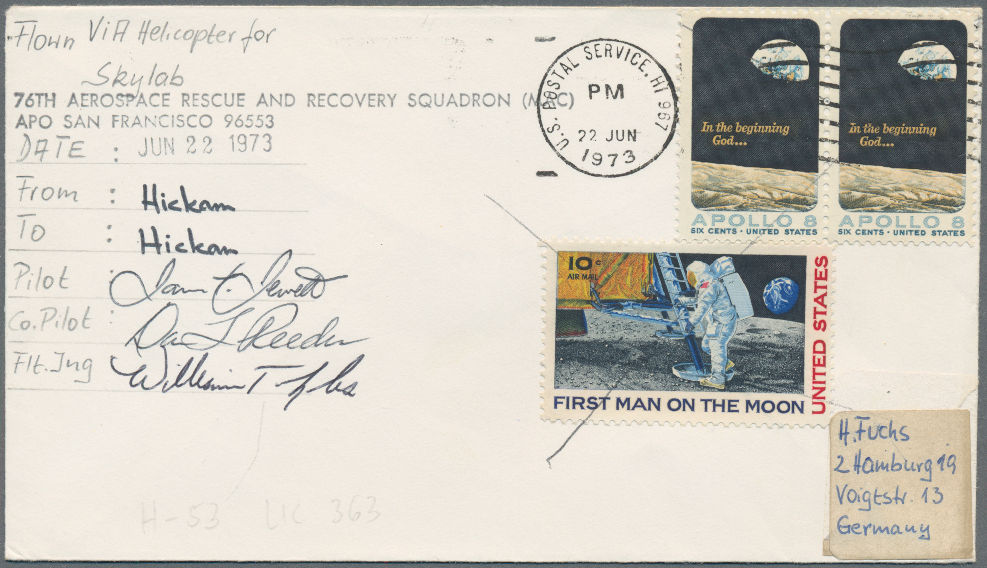 seven airmail f.d.c. 24.8.71 to Germany // U.S. Space Achievements (2637/2652 A/B), complete set of 16 de luxe sheets perf./imperf. each (=32 de luxe sheets) on eight f.d.c. 31 MAR 1973. These items are very rarely seen used on cover!